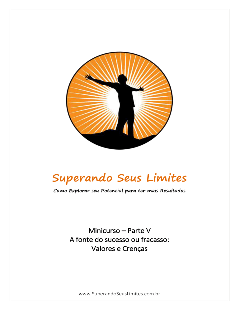 Superando Seus Limites Como Explorar seu Potencial para ter mais Resultados Minicurso – Parte V A fonte do sucesso ou fracasso: Valores e Crenças www.SuperandoSeusLimites.com.br Página 2 de 13 Parte 5.1- Valores e escala de prioridade. Bem vindo à parte 5 do minicurso Superando Seus Limites! Essa é a última parte do curso. Aproveite ao máximo! Nossa, esse curso poderia ter infinitas partes, mas dai também não seria “mini Curso” (Rsrsrs). O importante é que você tenha aproveitado o máximo até agora, e tenha feito os exercícios. Continue assim até o final! Vamos lá! Vamos começar! Ah, eu dividi esta parte em 2 partes... para dar mais resultado pra você! ;) Hoje vamos falar sobre a fonte de sucesso ou fracasso na vida que são os valores e crenças que nós temos. São essas forcas que dirigem nossa vida. Veja, você e eu fomos treinados a dar “rótulos” para diferentes níveis de dor e diferentes níveis de prazer. E esses rótulos são o que chamamos de “valores”. Você deve me falar: “André, você já falou que dor e prazer são as forças que controlam nossos comportamentos...” Mas o que estou falando agora é que nós aprendemos durante a vida a dar “rótulos” a diferentes níveis de dor e prazer. Especificamente se eu te perguntasse: o que você preferiria ter? Sucesso, ousadia, amor, conforto, aventura ou segurança?? Você tem que escolher 1 desses estados somente... Pode ter certeza que isso é diferente para todo mundo. Alguns de vocês iam falar: Eu tenho certeza do que quero, quero sucesso! Outros querem aventura! Outros querem amor, outros conforto e outros segurança... Todos nós aprendemos na vida a pegar diferentes palavras que chamamos de “emoção” e dar a elas níveis de importância. Aprendemos a valorizar diferentes emoções em diferentes níveis de intensidade. www.SuperandoSeusLimites.com.br Página 3 de 13 Olha, todas as emoções que citei acima, para a maioria, são fontes de “prazer”, mas não valorizamos todas elas no mesmo nível. Então, como podemos usar essa conclusão de maneira que afete diretamente nossa vida? Bom, todos nós temos uma escala de prioridades que guia nosso foco de todo dia. Como assim?? Nós estamos quase todo o tempo deletando o que esta a nossa volta, não prestamos atenção em tudo. Só prestamos atenção em uma pequena “fatia” do que vivenciamos, experimentamos. O que prestamos atenção e focamos está baseado nos nossos valores. Nossos valores nos dizem no que devemos prestar atenção pra termos muito “prazer” e também temos outros valores que prestamos atenção, que são nos valores dolorosos, nos estados que são mais dolorosos. Porque? Porque queremos evitar dor a todo custo... Nós chamamos esses 2 tipos de valores de – “valores de direção” (os que nos direcionam para o prazer) que são os estados de – amor, felicidade, atração, sucesso, segurança, aventura. São os estados que sempre tentamos ter na vida e para os quais sempre queremos nos dirigir. E tem o outro tipo de valores – que são os “valores de afastamento” – são o alvo oposto, estados como: frustração, depressão, dor física, raiva... Está entendendo?? Esses estados você quer evitar porque te trazem dor. E ainda, mesmo esses estados negativos não são valorizados igualmente. Deixa eu te perguntar uma coisa, qual desses estados você evitaria ao máximo? Qual você faria tudo para evitar? Humilhação, frustração, raiva, dor física, depressão, vergonha?? Agora, você não só vai escolher 1 deles, mas vai ordenar no que chamamos de escala de prioridade de importância. Qual você faria o máximo para evitar sentir? www.SuperandoSeusLimites.com.br Página 4 de 13 Então, imagine aqui como seu cérebro funciona. Seu cérebro está todo o tempo fazendo tudo o que pode para evitar experiências dolorosas e tudo o que pode pra ganhar prazer. Então, se acontecer algo na sua vida, como por exemplo se você tem uma oportunidade de pular de paraquedas – como seu cérebro vai decidir se você deve ou não fazer isso??? “Avaliando”, avaliando a experiência que você teria, seu cérebro vai pensar: “Isso vai me gerar prazer ou dor?” E isso vai depender do que você valoriza, do que acha que é importante na sua vida. Por exemplo, se você é uma pessoa que vê valor em tudo o que tem a ver com “ser aventureiro” ou mesmo se na vida você já teve experiências de aventura que mesmo com medo, depois de fazer você se sentiu incrível, seu cérebro fez uma neuroassociação ligando “aventura=prazer total”. Se isso é o que está no seu cérebro, aventura estará no topo da sua escala de importância para valores de direção. Ou seja, é um estado que ele fará muito para sentir então, provavelmente “ser aventureiro”, “ter liberdade”, “ser ousado” estará no topo da sua lista de prioridades de importância. E provavelmente, segurança não estará no topo da sua lista. Porque segurança pode ser até bom para essa pessoa, mas pode significar “prisão”... Pense na personalidade dessa pessoa. O valor nº1 = aventura e nº25=segurança. Você tem uma ideia de como a personalidade dessa pessoa deve ser? Se você perguntar a ela – “Quer pular de paraquedas?”, ela pode até ficar com medo, mas com certeza vai ficar interessada! Porque tudo tem a ver com nossos valores! Isto é, sempre vai resultar no que o cérebro ligara para gerar prazer. Agora se tiver outra pessoa que o valor nº1 dela é segurança e o que ela mais evita na vida é a possibilidade de dor física, de sentir medo. Adivinha!? Ela não vai pular de paraquedas; ou se for, vai forçada não vai pelo seu desejo... www.SuperandoSeusLimites.com.br Página 5 de 13 O negócio é, se você conhece os valores das outras pessoas, você pode muito bem prever a direção básica da vida delas. Faz sentido? (assim como da sua também, claro...) Se eu te falar que o valor nº1 de uma pessoa é liberdad