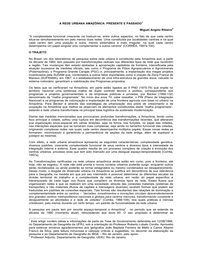 A REDE URBANA AMAZÔNICA: PRESENTE E PASSADO1 Miguel Angelo Ribeiro2 “A complexidade funcional crescente vai traduzir-se, entre outros aspectos, no fato de que cada centro situa-se simultaneamente em pelo menos duas redes. Uma constituída por localidades centrais e na qual cada centro tem uma posição e outra, menos sistemática e mais irregular, na qual cada centro desempenha um papel singular e/ou complementar a outros centros” (CORRÊA, 1997a:100). O TRAJETO No Brasil, um dos laboratórios de pesquisa sobre rede urbana é constituído pela Amazônia que, a partir da década de 1960, tem passado por transformações radicais nos diferentes tipos de rede que recobrem a região. Tais mudanças têm estado atreladas à apropriação capitalista da fronteira, intensificada pela atuação sucessiva de medidas oficiais, tais como o Programa de Pólos Agropecuários e Agrominerais (Polamazônia), o Programa Grande Carajás (PGC) e, principalmente, a implantação dos megas projetos incentivados pela SUDAM que, combinados a outros fatos importantes como a criação da Zona Franca de Manaus (SUFRAMA), em 1967, e o estabelecimento de uma infra-estrutura de grandes eixos, calcada no sistema rodoviário, garantiram a viabilização dos Programas propostos. Os fatos que se verificaram na Amazônia, em parte estão ligados ao II PND (1975-79) que impõe no território nacional uma poderosa malha de duplo controle técnico e político, correspondente aos programas e projetos governamentais e de empresas públicas e privadas, por Becker (1992:132) denominado de “malha programada”. No início dos anos 70, cabe ressaltar, o PIN (Plano de Integração Nacional) e os programas de colonização e implantação de uma fronteira agrícola com base no urbano na Amazônia. Para Becker é através das estratégias de urbanização dos pólos de crescimento e de ocupação na Amazônia que melhor se observam os elementos constituintes desta “malha programada”, estando a rede urbana transformada na principal base logística da acelerada modernização. Diante das medidas mencionadas que provocaram profundas transformações, a Amazônia, tendo como foco principal a cidade, sofreu uma ruptura em decorrência das transformações recentes, que alteraram sua organização sócio-espacial em várias direções, seja na forma, nas funções, no papel das cidades, nas interações espaciais que se tornaram mais complexas, seja ainda no tamanho funcional das cidades, originando complexas redes nas quais cada centro desempenha múltiplos papéis. Essas novas redes se formaram: minimizando e garantindo a permanência de seções da rede antiga, além de superpor e justapor as mesmas. Com efeito, a rede urbana amazônica apresenta as seguintes características: complexidade genética, diversos padrões, crescente complexidade funcional de seus centros e diversos tipos e intensidade de integração interna e externa. Esse quadro resulta de um processo complexo de criação e evolução dos centros urbanos, processo esse que tem sido marcado por uma desigual espaço-temporalidade (Corrêa, 1997a). As Transformações verificadas na rede urbana amazônica ainda estão em curso, pois a fronteira, até hoje, não se esgotou. A rede não está pronta e novos núcleos urbanos poderão surgir, enquanto outros serão revitalizados ou ainda poderão se tornar estagnados ou mesmo condenados ao desaparecimento. Desse modo, o resgate da dimensão urbana na Amazônia se justifica em decorrência de sua relevância para a Geografia, na medida em que por seu intermédio é possível determinar as diferentes escalas da divisão territorial do trabalho e a complexidade da rede urbana, em razão do papel específico e hierarquizado de cada lugar nos fluxos que compõem os diversos tipos de rede. Esses fluxos que organizaram redes e que se realizam em uma sociedade, através das conexões materiais (sistemas de transportes) e não materiais (fluxos de capitais e mensagens diversas) revelam formas que podem ser traduzidas em padrões de conexões espaciais. Tais formas são resultantes das relações de dominação e complementaridade entre os centros – “decisões, investimentos e inovações circulam descendentemente dos grandes centros metropolitanos nacionais e globais para centros menores, transformando constante e desigualmente as atividades e a rede de cidades” (Corrêa, 1988:109), nos quais práticas e inércias cristalizam, pelo menos durante um certo tempo, um padrão de funcionalidade da rede urbana. 3 A pesquisa em pauta tem por recorte espaço-temporal a Amazônia , no período que se estende da década de 1990 (momento atual), retrocedendo aos anos 60. O seu propósito é determinar as 1 Este artigo contém idéias e informações de parte da Tese de Doutoramento defendida em 12/08/1998, no Departamento de Geografia da UFRJ, sob a orientação do Professor Roberto Lobato Corrêa. Aproveito para externar sinceros agradecimentos aos geógrafos João Baptista Ferreira de Mello e Carlos Alberto Franco da Silva, pela leitura minuciosa e valiosas críticas e sugestões, no decorrer da elaboração da pesquisa e ao Departamento de Geografia do IBGE – Rio de Janeiro, pelo apoio. 2 Professor Adjunto. Departamento de Geografia. UERJ. Rio de Janeiro. transformações recentes ocorridas a partir do papel e da organização espacial dos centros urbanos através da análise das redes de produção, de distribuição e de gestão. Para tanto, será necessário avaliar a dinâmica, a função, os fluxos e os nós das redes selecionadas. A problemática desse estudo, está atrelada às transformações em curso verificadas na organização sócio-espacial da rede urbana da Amazônia, iniciadas a partir da década de 1960, transformações que, entre outras, se realizaram sobre uma rede urbana longamente estabelecida e caracterizada por uma estrutura simples – a rede dendrítica. Parte-se do pressuposto de que a rede urbana 