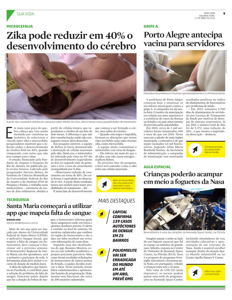 SUA VIDA ZERO HORA SEGUNDA-FEIRA, 11 DE ABRIL DE 2016 MICROCEFALIA 9 GRIPE A TV BRASIL, DIVULGAÇÃO JEFFERSON BOTEGA, BD, 22/04/2014 Zika pode reduzir em 40% o Porto Alegre antecipa desenvolvimento do cérebro vacina para servidores Estimativa da prefeitura é imunizar aproximadamente 4,5 mil funcionários A partir dos resultados obtidos por pesquisa sobre efeitos do vírus, ideia é testar novas possibilidades de tratamento E partir de células-tronco, que reproduzem o cérebro de um feto de dois meses. A diferença é que não têm vascularização, então não conseguem crescer além dessa fase. Em pesquisa anterior, a equipe de Rehen já havia demonstrado a destruição de células neuronais pelo zika. Desta vez, o minicérebro foi infectado pelo vírus no 35º dia de desenvolvimento (equivalente ao feto no segundo mês de gestação) e teve a taxa de crescimento acompanhada por 11 dias. – Observamos redução de crescimento em torno de 40%. De certa forma, é equivalente ao observado in vivo. A partir desse resultado, temos um modelo para testar possibilidades de tratamento – diz. É nessa fase do desenvolvimento TECNOLOGIA Santa Maria começará a utilizar app que mapeia falta de sangue BIBIANA DIHL [email protected] Mais de um ano após ser lançado por alunos da Universidade Federal de Santa Maria (UFSM), o aplicativo Sangue Social, que mapeia a falta de sangue em hemocentros, deve começar a funcionar até a próxima semana. O Hemocentro Regional de Santa Maria, um dos apoiadores, será o primeiro a participar da rede. A ferramenta ainda deve incluir o recurso de doação de medula óssea. A ideia do aplicativo, que funciona no Facebook, é contribuir para a solução do problema da falta de sangue. Funciona assim: depois que faz a doação de bolsas de san- gue, o hemocentro informa quais tipos sanguíneos estão em baixa e quantos doadores precisa. O alerta é emitido no feed de notícias. Os usuários cadastrados que residem na região do hemocentro e são o tipo em falta recebem um aviso, com informações de como doar. Segundo uma das idealizadoras do app, Rossana Moreira, como era um trabalho acadêmico, o projeto procurou parceiros. Mas, como foram recebidas solicitações de hemocentros de outros pontos do Estado, a equipe decidiu reativar a ideia. Neste período, foram feitos cadastramentos e aprimoradas funções de programação. Hoje, mesmo sem funcionar, são cerca de 200 usuários cadastrados. que começa a ser formado o córtex, área nobre do cérebro. – Quando esta etapa é impedida, formam-se alterações que temos visto nos bebês cujas mães tiveram zika, como microcefalia. A equipe ainda contaminou o minicérebro com vírus da dengue. – Ele infecta até mais do que o da zika, mas não causa estragos – explicou Rehen. Na próxima fase da pesquisa, o foco será entender como o zika entra nas células neuronais. Além de microcefalia, zika vírus pode estar associado a outra doença neurológica resultados positivos no índice de afastamentos de funcionários por problemas de saúde. – Em 2012, somamos 6.780 dias de afastamentos de servidores por Licença de Tratamento de Saúde por motivos de doenças do sistema respiratório. Já em 2015, o número total de dias foi de 5.372, uma redução de 20% , o que mostra a importância dessa ação – destacou. Farmácias privadas da Capital já têm falta de Tamiflu AULA ESPACIAL Crianças poderão acampar em meio a foguetes da Nasa KENNEDY SPACE CENTER, DIVULGAÇÃO m mais uma peça do quebra-cabeça que vem sendo montado por cientistas na tentativa de solucionar o vínculo entre zika e microcefalia, pesquisadores mostram que a infecção reduz o desenvolvimento do cérebro fetal em 40%, quando comparado com outro que não teve contato com o vírus. O estudo, financiado pela Fundação de Amparo à Pesquisa do Rio de Janeiro, foi publicado pela revista Science. Liderado pelo pesquisador Stevens Rehen, do Instituto de Ciências Biomédicas da Universidade Federal do Rio de Janeiro e do Instituto D’Or de Pesquisa e Ensino, o trabalho usou minicérebros – estruturas de menos de dois milímetros, obtidas a A prefeitura de Porto Alegre começou hoje a imunizar os servidores municipais contra a gripe A. A campanha vai até sexta-feira. O motivo da antecipação em relação aos anos anteriores é a existência de casos da doença no Estado e no país antes mesmo do previsto pelas autoridades. Em 2015, cerca de 3 mil servidores foram imunizados, 690 a mais do que em 2014. Neste ano,com a adesão de mais órgãos municipais, a estimativa é de que sejam vacinados 4,5 mil funcionários. Segundo Aline Maria Reinbold Simões, da Secretaria de Administração, a campanha de imunização vem mostrando MAIS DESTAQUES CAPITAL CONFIRMA 139 CASOS AUTÓCTONES DE DENGUE EM 25 BAIRROS POLIOMIELITE VAI SER ERRADICADA DO MUNDO EM ATÉ UM ANO, PREVÊ OMS Nave Atlantis é uma das atrações no Kennedy Space Center, na Flórida Imagine passar a noite ao lado de um foguete espacial que foi ao espaço ou embaixo da grande nave Atlantis, exposta no Centro de Visitantes do Kennedy Space Center, na Flórida (EUA). Essa é a proposta do programa Overnight Adventures (Aventuras pela Noite, em português), voltado a crianças entre sete e 14 anos. Pelo valor de US$ 125 (mais impostos), os jovens podem passar uma noite de programações no Kennedy Space Center, incluindo simuladores de voo, atividades educativas e apresentação de um veterano da Nasa. Ainda é possível escolher acampar dentro da atração Space Shuttle AtlantisSM ou no Centro Apollo/Saturn V Center. Saiba mais sobre a programação