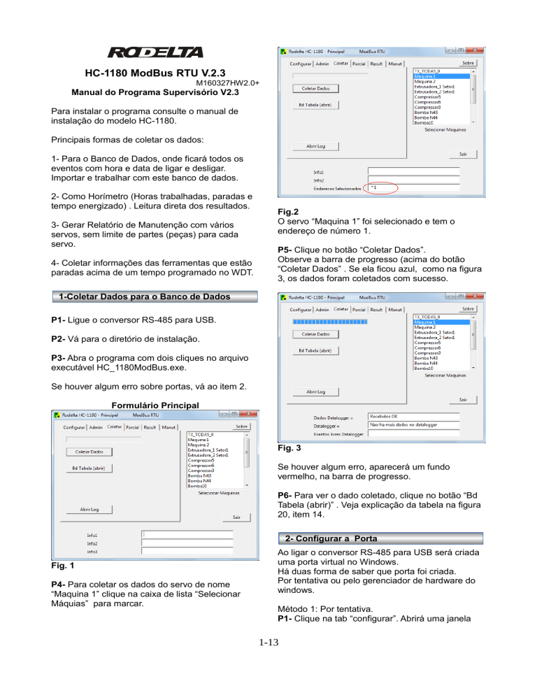 HC-1180 ModBus RTU V.2.3 M160327HW2.0+ Manual do Programa Supervisório V2.3 Para instalar o programa consulte o manual de instalação do modelo HC-1180. Principais formas de coletar os dados: 1- Para o Banco de Dados, onde ficará todos os eventos com hora e data de ligar e desligar. Importar e trabalhar com este banco de dados. 2- Como Horímetro (Horas trabalhadas, paradas e tempo energizado) . Leitura direta dos resultados. 3- Gerar Relatório de Manutenção com vários servos, sem limite de partes (peças) para cada servo. 4- Coletar informações das ferramentas que estão paradas acima de um tempo programado no WDT. Fig.2 O servo “Maquina 1” foi selecionado e tem o endereço de número 1. P5- Clique no botão “Coletar Dados”. Observe a barra de progresso (acima do botão “Coletar Dados” . Se ela ficou azul, como na figura 3, os dados foram coletados com sucesso. 1-Coletar Dados para o Banco de Dados P1- Ligue o conversor RS-485 para USB. P2- Vá para o diretório de instalação. P3- Abra o programa com dois cliques no arquivo executável HC_1180ModBus.exe. Se houver algum erro sobre portas, vá ao item 2. Formulário Principal Fig. 3 Se houver algum erro, aparecerá um fundo vermelho, na barra de progresso. P6- Para ver o dado coletado, clique no botão “Bd Tabela (abrir)” . Veja explicação da tabela na figura 20, item 14. 2- Configurar a Porta Fig. 1 P4- Para coletar os dados do servo de nome “Maquina 1” clique na caixa de lista “Selecionar Máquias” para marcar. Ao ligar o conversor RS-485 para USB será criada uma porta virtual no Windows. Há duas forma de saber que porta foi criada. Por tentativa ou pelo gerenciador de hardware do windows. Método 1: Por tentativa. P1- Clique na tab “configurar”. Abrirá uma janela 1-13 conforme figura 4. P5- Clique em “Portas Com e LPT” Fig.4 Fig.6 No exemplo a porta selecionada de ve ser a Com3 ( USB Serial Port(Com3) ). P2- Abra o “combo box” (na figura 4 caixa com a porta Com3) selecione uma outra porta. P3- Clique no botão “le Relógio”. Se a porta selecionada estiver correta aparecera como na figura 5, a data e hora na caixa de texto abaixo. Portanto, selecione a porta Com3 no list box da tab “Configurar” do programa supervisório. Se a porta não existir, há um problema com o conversor usado. Teste novamente o botão “le Relógio” . 3- Mudar Endereço do Servo Em uma rede cada servo tem que ter um endereço diferente. De fábrica vem todos com endereço 1 (um). Para configurar o endereço, mantenha somente um servo ligado ao PC. P1- Na figura 5 clique no botão “Mudar Endereço”. Aparecerá a janela da figura 8. Fig.5 Com a porta correta, o programa leu o relógio do servo 1. Nota: Se sua porta não aparecer na lista, clique no botão “Selecionar Porta” ou feche e abra o programa novamente. Método 2: Ver a porta no “Gerenciador de Dispositivo” do Windows (Exemplo Windows 7). P1- Ligue o conversor na USB do PC. P2- Abra o painel de controle do windows. P3- Clique em “ Sistema e Segurança”. P4- No link “Sistema” veja abaixo e clique em “Gerenciador de Dispositivos”. Abrirá uma janela como na figura 6. Fig.8 Entre com o número do servo, no exemplo, endereço 2. O supervisório somente aceita os valores sequenciais. Por exemplo para 3 servos os endereços só podem ser 1, 2 e 3. P2- Confirme no botão “ok”. Aparecerá uma janela de alerta pedindo para verificar se o endereço é igual ao que está na caixa texto colorida em amarelo. P3- Ao confirmar aparecerá um alerta: Fig.9 Chama atenção se tiver mais de um servo ligado na rede todos esses servos serão modificados. Só 2-13 pode ter um de cada vez, para configurar o endereço. Confirme em “Yes”. Veja a informação na caixa de texto abaixo: “Endereço Atribuído = 2” Servo configurado para o endereço 2. Repita esta operação para os demais servos. 4-Atualizar Data e Hora do servo Após configurar o endereço, marque o servo na lista de servos e clique no botão “Atualiza Data e Hora”. Ver na figura 5 o botão. P1- Clique no botão “Caminho BD”. Fig.12 P2- Confirme que quer informar o novo caminho do banco de dados. Se houver sucesso, aparecera a janela da figura 10. Fig.10 Fig.13 Verifique se a Data e Hora do seu PC estão corretas antes de efetuar o ajuste do servo. Nota: Em uma rede, este ajuste pode ser feito de uma só vez, selecionando o endereço 0 (TxTodas_0). Todos os servos devem estar ligados. Verifique se entrou com os dados corretamente e clique em OK. P3-Teste se o caminho está correto: Clique na tab “Coletar” P4- Conforme figura 1, clique no botão “ BD Tabela (abrir)” . Aparecerá algo similar a figura 14. 5- Localização do Banco de Dados Informar o caminho onde foi instalado o Banco de Dados SQLite3. Por padrão, o Banco de Dados estará sempre em um subdiretório do arquivo executável (subdiretório \dados) com nome “HC1180.sqlite”. Por exemplo: Se o executável HC1180Modbus.exe foi instalado do diretório C:\HC1180Install, o Banco de Dados estará no caminho: C:\HC1180Install\dados\HC1180.sqlite Fig.14 Se não aparecer as colunas, com nomes, o caminho do banco de dados foi digitado errado. 6- Velocidade de Transmissão e Recepção Recomendamos trabalhar em 9600bps. Somente alterar para compatibilidade com outro supervisório. Para alterar a velocidade selecione no list box o valor 19200bps. Será transmitido para todos os servos da rede. Para retornar, selecione 9600bps. NOTA: Se algum servo for posto na rede com velocidade diferente não responderá. Veja como recuperar no item Solução de Falhas. Fig.11 3-13 7- Paridade Paridade está neste programa apenas por compatibilidade com o protocolo ModBus. Seu uso é desnecessário devido a correção de erro por CRC-16 do próprio protocolo. Recomendamos deixar sem paridade. Cuidado: Se algum servo estiver com paridade diferente dos demais, não vai responder. Veja como recuperar em Solução de Fal
