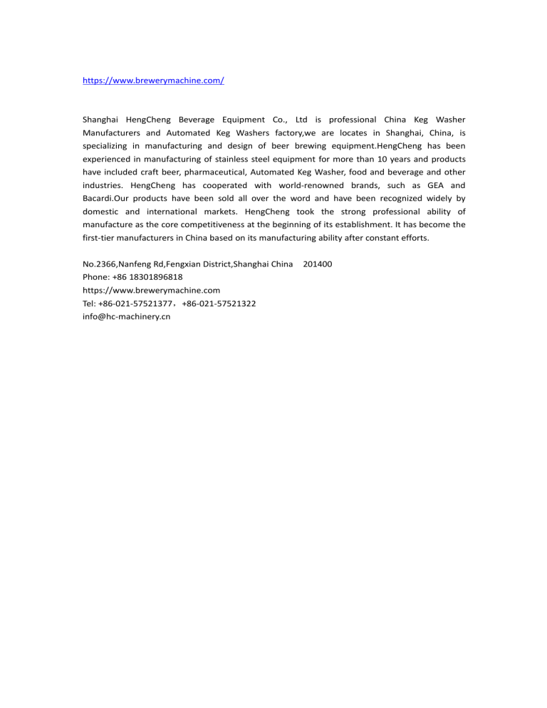 https://www.brewerymachine.com/ Shanghai HengCheng Beverage Equipment Co., Ltd is professional China Keg Washer Manufacturers and Automated Keg Washers factory,we are locates in Shanghai, China, is specializing in manufacturing and design of beer brewing equipment.HengCheng has been experienced in manufacturing of stainless steel equipment for more than 10 years and products have included craft beer, pharmaceutical, Automated Keg Washer, food and beverage and other industries. HengCheng has cooperated with world-renowned brands, such as GEA and Bacardi.Our products have been sold all over the word and have been recognized widely by domestic and international markets. HengCheng took the strong professional ability of manufacture as the core competitiveness at the beginning of its establishment. It has become the first-tier manufacturers in China based on its manufacturing ability after constant efforts. No.2366,Nanfeng Rd,Fengxian District,Shanghai China Phone: +86 18301896818 https://www.brewerymachine.com Tel: +86-021-57521377,+86-021-57521322 [email protected] 201400