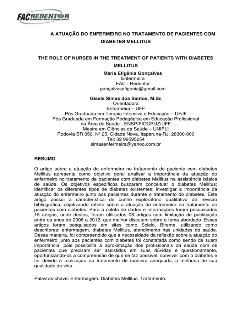 1 A ATUAÇÃO DO ENFERMEIRO NO TRATAMENTO DE PACIENTES COM DIABETES MELLITUS THE ROLE OF NURSES IN THE TREATMENT OF PATIENTS WITH DIABETES MELLITUS Maria Efigênia Gonçalves Enfermeira FAC - Redentor gonç[email protected] Gisele Simas dos Santos, M.Sc Orientadora Enfermeira – UFF Pós Graduada em Terapia Intensiva e Educação – UFJF Pós Graduada em Formação Pedagógica em Educação Profissional na Área de Saúde - ENSP/FIOCRUZ/UFF Mestre em Ciências da Saúde – UNIPLI Rodovia BR 356, Nº 25, Cidade Nova, Itaperuna-RJ, 28300-000 Tel: 32 99595254 [email protected] RESUMO O artigo sobre a atuação do enfermeiro no tratamento de paciente com diabetes Mellitus apresenta como objetivo geral analisar a importância da atuação do enfermeiro no tratamento de pacientes com diabetes Mellitus na assistência básica de saúde. Os objetivos específicos buscaram conceituar o diabetes Mellitus; identificar os diferentes tipos de diabetes existentes; investigar a importância da atuação do enfermeiro junto aos pacientes durante o tratamento do diabetes. Este artigo possui a característica de cunho exploratório qualitativo de revisão bibliográfica, objetivando refletir sobre a atuação do enfermeiro no tratamento de pacientes com diabetes. Para a coleta de dados e informações foram pesquisados 15 artigos, onde destes, foram utilizados 08 artigos com limitação de publicação entre os anos de 2006 a 2012, que melhor discutem sobre o tema abordado. Esses artigos foram pesquisados em sites como Scielo, Bireme, utilizando como descritores: enfermagem, diabetes Mellitus, atendimento nas unidades de saúde. Dessa maneira, foi compreendido que a necessidade da reflexão sobre a atuação do enfermeiro junto aos pacientes com diabetes foi constatada como sendo de suam importância, pois possibilita a aproximação dos profissionais da saúde com os pacientes que precisam ser assistidos em suas dúvidas e questionamento, oportunizando-os a compreensão de que se faz possível, conviver com o diabetes e ter devido à realização do tratamento de maneira adequada, a melhoria de sua qualidade de vida. Palavras-chave: Enfermagem. Diabetes Mellitus. Tratamento. 2 ABSTRACT The article on the role of a nurse in the treatment of patients with diabetes mellitus has aimed at analyzing the importance of nurses' performance in treating patients with diabetes mellitus in primary health care. The specific objectives sought to conceptualize Diabetes Mellitus; identify the different types of diabetes exist; investigate the importance of the work of the nurses with the patients during the treatment of diabetes. This product has the characteristic of an exploratory qualitative literature review, in order to reflect on the role of nurses in treating patients with diabetes. To collect data and information were surveyed 15 articles where these, 08 articles were used with limited published between the years 2006 to 2012, what better discuss about the topic. These articles were searched on sites like Scielo Bireme, using descriptors such as: nursing, diabetes mellitus, attendance at health facilities. Thus, it was understood that the need for reflection on the role of a nurse with patients with diabetes was seen as vitally important because it enables the approximation of health professionals with patients who need to be assisted in their doubts and questions, providing opportunities them to understand that it makes possible to live with diabetes and have the due performance of the treatment properly, improving their quality of life. Keywords: Nursing. Diabetes Mellitus. Treatment. 1 INTRODUÇÃO A sociedade contemporânea é caracterizada por diferentes aspectos que impulsionaram a percepção de como o tempo se apresenta dominante, interferindo nos hábitos da população, agravando a saúde de crianças, jovens, adultos e idosos, influenciado por má alimentação, estresse, dentre outros fatores que prejudicam a qualidade de vida dos indivíduos. A necessidade de se atentar para as práticas de atividades relacionadas à saúde configura-se na adoção de medidas preventivas. Atualmente, convive-se com o alarmante quadro do aumento de pacientes com diabetes Mellitus, o que gera preocupação por parte do Ministério da Saúde em decorrência do número de pacientes portadores da doença. Os fatores ligados ao surgimento da diabetes vêm sendo discutidos pelos profissionais da saúde, desencadeando a reflexão sobre os hábitos alimentares, a correria do cotidiano, a busca por novas formas que ampliem o tempo gasto em benefício da saúde, objetivando a redução do número de casos de diabetes. 3 As formas de tratamento existentes favorecem o controle do avanço da doença, salientando o fato de que os avanços alcançados pela medicina vêm propiciando a convivência com a doença de maneira a não prejudicar as atividades diárias realizadas pelos pacientes. Sendo assim, surge a seguinte indagação: Como o enfermeiro pode contribuir para a melhoria da qualidade de vida dos pacientes com diabetes? O objetivo geral do estudo visa analisar a importância da atuação do enfermeiro no tratamento de pacientes com diabetes Mellitus na assistência básica de saúde. Os objetivos específicos buscam conceituar o diabetes Mellitus e identificar os diferentes tipos de diabetes existentes. Justifica-se a escolha do tema proposto relacionado à contribuição do enfermeiro no tratamento de pacientes diabéticos pelo fato de buscar aprofundar em conceitos que possam favorecer a prática do atendimento aos pacientes que são atendidos nas unidades de saúde, já que, por meio dos conhecimentos técnicocientíficos que o enfermeiro possui, ele pode realizar com maior eficiência as suas funções no atendimento, permeando a orientação e as informações aos pacientes e suas famílias, vislumbrando a melhoria de sua qualidade de vida. 2 METODOLOGIA Para identificar o que é uma pesquisa qualitativa, Lakatos e M