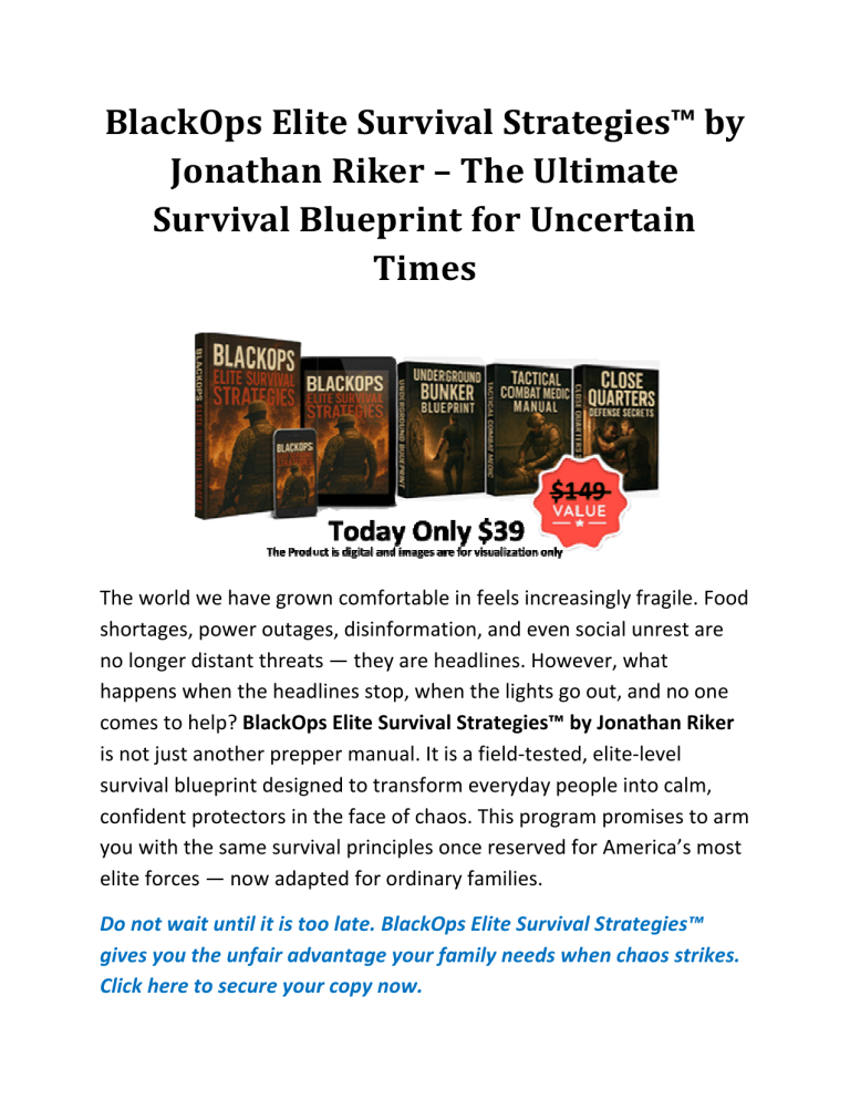 BlackOps Elite Survival Strategies™ by Jonathan Riker – The Ultimate Survival Blueprint for Uncertain Times The world we have grown comfortable in feels increasingly fragile. Food shortages, power outages, disinformation, and even social unrest are no longer distant threats — they are headlines. However, what happens when the headlines stop, when the lights go out, and no one comes to help? BlackOps Elite Survival Strategies™ by Jonathan Riker is not just another prepper manual. It is a field-tested, elite--level survival blueprint designed to transform everyday people into calm, confident protectors in the face of chaos. This program promises to arm you with the same survival principles once reserved fo forr America’s most elite forces — now adapted for ordinary families. Do not wait until it is too late. BlackOps Elite Survival Strategies™ gives you the unfair advantage your fa family needs when chaos strikes. Clickk here to secure your copy now. What is BlackOps Elite Survival Strategies? BlackOps Elite Survival Strategies™ is not a typical survival book. It is a complete civilian survival system built from decades of black site experience, elite war zone training, and classified operations. Originally designed for top-tier military operatives, this guide reveals the hidden vulnerabilities in our food supply, digital systems, and urban infrastructures — and then gives you the tools to safeguard your family before disaster strike. Inside, you will learn how to secure food and water during a system breakdown, fortify your home with stealth and tactical defense, create off-grid fallback plans even in small living spaces, protect your digital footprint during mass surveillance, and lead your loved ones when panic spreads. This is not about fear. It is about clarity, preparation, and control. About the Author Colonel Jonathan Riker is not a theorist. He is a former elite strategist and survival trainer who spent decades preparing America’s most covert operatives — Green Berets, SEALs, and black site teams — to endure the harshest environments on Earth. From jungles to deserts to urban sieges, Riker honed survival strategies under conditions where failure meant death. However, after uncovering classified information — known as “Project Silence” — detailing a coordinated domestic collapse, he walked away from the shadows. His new mission: to bring the survival tactics once hidden behind top-secret clearances into the hands of everyday Americans before it is too late. Who is the Program For? This program is built for ordinary citizens who refuse to be caught unprepared. Whether you are a father, mother, grandparent, teacher, first responder, or simply someone who senses the system’s fragility, BlackOps Elite Survival Strategies™ gives you the tools to protect what matters most. No prior military training is required. If you want to move from fear to focus and lead your loved ones when the unthinkable happens, this blueprint is for you. Your family will not look to the government in a crisis — they will look to you. Be the protector they can count on. Get BlackOps Elite Survival Strategies™ today Benefits Here is what you will gain with BlackOps Elite Survival Strategies™: • Food & Water Security – Discover how to secure critical resources even in urban areas during total system failure. • Home Fortification – Apply stealth defense and tactical positioning to protect your home. • Off-Grid Planning – Build fallback plans for your family, even in small apartments. • Digital Protection – Safeguard your online presence and communications during surveillance or blackouts. • Leadership Under Pressure – Stay calm, focused, and leads others when panic spreads. • Early Warning Skills – Detect supply chain failures, media manipulation, and emerging threats before the public catches on. • Psychological Resilience – Train your mind to stay sharp and steady under stress. Pros and Cons Pros: Built from real-world elite survival training and classified strategies. Adapted for everyday Americans — no prior training required. Covers not only physical survival but also psychological resilience and leadership Includes three powerful bonus guides (bunker blueprints, combat medic manual, close-quarters defense). Risk-free 60-day money-back guarantee Cons: × The tone of urgency may feel overwhelming to some readers. × Requires personal action and discipline to implement fully × Focuses heavily on U.S. scenarios, though principles are universal Pricing and Money-Back Guarantee Jonathan Riker has priced BlackOps Elite Survival Strategies™ at just $39 — a fraction of what similar high-level training would cost. Along with the core program, buyers receive three valuable bonuses: Underground Bunker Blueprint Tactical Combat Medic Manual Close Quarters Defense Secrets Together, these resources would normally cost over $200, but they are free with your purchase. In addition, because this is not about profit but protection, Riker backs the program with a 60-day 100% moneyback guarantee. If you do not feel safer, sharper, and more prepared, you will get a full refund — no questions asked. Conclusion The warning signs are everywhere. Empty shelves. System glitches. Misinformation. In addition, when the next crisis hits, there will not be a siren or headline — only silence. BlackOps Elite Survival Strategies™ by Jonathan Riker is your chance to move from helplessness to leadership, from confusion to clarity. It is more than a survival manual. It is a call to action for every American who refuses to be a victim of chaos. For just $39, you can access the same survival code built to protect Riker’s own family — and now thousands of Americans who will not be caught off guard again. When your loved ones look to you during a crisis, will you be ready? One decision today can change everything tomorrow. Try BlackOps Elite Survival Strategies™ r