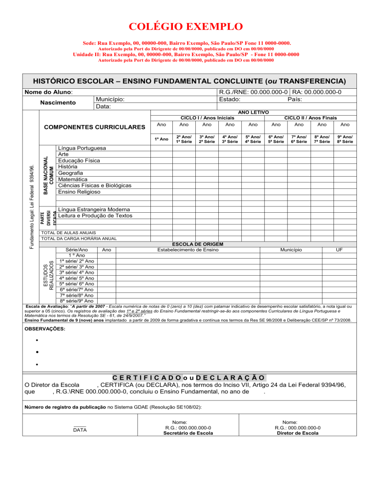 COLÉGIO EXEMPLO Sede: Rua Exemplo, 00, 00000-000, Bairro Exemplo, São Paulo/SP Fone 11 0000-0000. Autorizado pela Port do Dirigente de 00/00/0000, publicado em DO em 00/00/0000 Unidade II: Rua Exemplo, 00, 00000-000, Bairro Exemplo, São Paulo/SP - Fone 11 0000-0000 Autorizado pela Port do Dirigente de 00/00/0000, publicado em DO em 00/00/0000 HISTÓRICO ESCOLAR – ENSINO FUNDAMENTAL CONCLUINTE (ou TRANSFERENCIA) R.G./RNE: 00.000.000-0 RA: 00.000.000-0 Estado: País: Nome do Aluno: Nascimento Município: Data: ANO LETIVO COMPONENTES CURRICULARES Ano PARTE DIVERSI FICADA Fundamento Legal: Lei Federal 9394/96. BASE NACIONAL COMUM 1º Ano CICLO I / Anos Iniciais Ano Ano Ano 2º Ano/ 1ª Série 3º Ano/ 2ª Série 4º Ano/ 3ª Série Ano Ano 5º Ano/ 4ª Série 6º Ano/ 5ª Série CICLO II / Anos Finais Ano Ano Ano 7º Ano/ 6ª Série 8º Ano/ 7ª Série 9º Ano/ 8ª Série Língua Portuguesa Arte Educação Física História Geografia Matemática Ciências Físicas e Biológicas Ensino Religioso Língua Estrangeira Moderna Leitura e Produção de Textos ESTUDOS REALIZADOS TOTAL DE AULAS ANUAIS TOTAL DA CARGA HORÁRIA ANUAL Série/Ano 1 º Ano 1ª série/ 2º Ano 2ª série/ 3º Ano 3ª série/ 4º Ano 4ª série/ 5º Ano 5ª série/ 6º Ano 6ª série/7º Ano 7ª série/8º Ano 8ª série/9º Ano Ano ESCOLA DE ORIGEM Estabelecimento de Ensino Município UF Escala de Avaliação: “A partir de 2007 - Escala numérica de notas de 0 (zero) a 10 (dez) com patamar indicativo de desempenho escolar satisfatório, a nota igual ou superior a 05 (cinco). Os registros de avaliação das 1ª e 2ª séries do Ensino Fundamental restringir-se-ão aos componentes Curriculares de Língua Portuguesa e Matemática nos termos da Resolução SE - 61, de 24/9/2007.” Ensino Fundamental de 9 (nove) anos implantado a partir de 2009 de forma gradativa e contínua nos termos da Res SE 98/2008 e Deliberação CEE/SP nº 73/2008. OBSERVAÇÕES: CERTIFICADOouDECLARAÇÃO O Diretor da Escola , CERTIFICA (ou DECLARA), nos termos do Inciso VII, Artigo 24 da Lei Federal 9394/96, que , R.G.\RNE 000.000.000-0, concluiu o Ensino Fundamental, no ano de . Número de registro da publicação no Sistema GDAE (Resolução SE108/02): DATA Nome: R.G.: 000.000.000-0 Secretário de Escola Nome: R.G.: 000.000.000-0 Diretor de Escola COLÉGIO EXEMPLO Sede: Rua Exemplo, 00, 00000-000, Bairro Exemplo, São Paulo/SP Fone 11 0000-0000. Autorizado pela Port do Dirigente de 00/00/0000, publicado em DO em 00/00/0000 Unidade II: Rua Exemplo, 00, 00000-000, Bairro Exemplo, São Paulo/SP - Fone 11 0000-0000 Autorizado pela Port do Dirigente de 00/00/0000, publicado em DO em 00/00/0000 (Verso) Colégio: TRANSFERÊNCIA DURANTE O ANO LETIVO ENSINO FUNDAMENTAL DECLARAÇÃO DECLARO, nos termos do Inciso VII, artigo 24, da Lei 9394/96, que o aluno , RG nº , RA nº , encontra-se matriculado na Série/Ano, do Ensino Fundamental, no presente ano letivo, e apresenta o aproveitamento e freqüência descritos abaixo, até / / . Série/Ano Fundamento Legal: Lei Federal 9394/96 COMPONENTES CURRICULARES NOTAS PARTE DIVERSIFI CADA BASE NACIONAL COMUM 1º Bim 2º Bim 3º Bim 4º Bim TOTAL DE FALTAS Aulas Dadas ou Dias Letivos (Para o Ciclo I) 1º Bim 2º Bim 3º Bim 4º Bim Língua Portuguesa Arte Educação Física História Geografia Matemática Ciências Físicas e Biológicas Ensino Religioso Língua Estrangeira Moderna Leitura e Produção de Textos OBSERVAÇÕES: DATA Nome R.G.: 000.000.000-0 Secretário de Escola Nome R.G.: 000.000.000-0 Diretor de Escola
