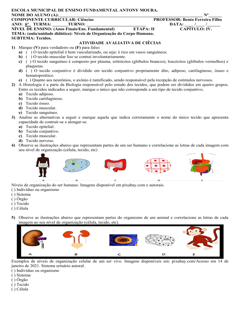 ESCOLA MUNICIPAL DE ENSINO FUNDAMENTAL ANTONY MOURA. NOME DO ALUNO (A):_________________________________________________________________ Nº______ COMPONENTE CURRICULAR: Ciências PROFESSOR: Bento Ferreira Filho ANO: 6º TURMA: _______TURNO: ___________________________ DATA: ____ /____ /______ NÍVEL DE ENSINO: (Anos Finais/Ens. Fundamental) ETAPA: II CAPÍTULO: IV. TEMA: (aula/unidade didática): Níveis de Organização do Corpo Humano. SUBTEMA: Tecidos. ATIVIDADE AVALIATIVA DE CIÊCIAS 1) Marque (V) para verdadeiro ou (F) para falso: a) ( ) O tecido epitelial é bem vascularizado, ou seja: é rico em vasos sanguíneos. b) ( ) O tecido muscular liso se contrai involuntariamente. c) ( ) O tecido sanguíneo é composto por plasma, eritrócitos (glóbulos brancos), leucócitos (glóbulos vermelhos) e plaquetas. d) ( ) O tecido conjuntivo é dividido em tecido conjuntivo propriamente dito, adiposo, cartilaginoso, ósseo e hematopoiético. e) ( ) Quanto aos neurônios, o axônio é ramificado, sendo responsável pela recepção de estímulos nervosos. 2) A Histologia é a parte da Biologia responsável pelo estudo dos tecidos, que podem ser divididos em quatro grupos. Entre os tecidos indicados a seguir, marque o único que não corresponde a um tipo de tecido conjuntivo. a) Tecido adiposo. b) Tecido cartilaginoso. c) Tecido ósseo. d) Tecido muscular. e) Tecido sanguíneo. 3) Analise as alternativas a seguir e marque aquela que indica corretamente o nome do único tecido que apresenta capacidade de contrair-se e alongar-se. a) Tecido epitelial. b) Tecido conjuntivo. c) Tecido muscular. d) Tecido nervoso. 4) Observe as ilustrações abaixo que representam partes de um ser humano e correlacione as letras de cada imagem com seu nível de organização (célula, tecido, etc) Níveis de organização do ser humano. Imagens disponível em pixabay.com e autorais. ( ) Indivíduo ou organismo ( ) Sistema ( ) Órgão ( ) Tecido ( ) Célula 5) Observe as ilustrações abaixo que representam partes do organismo de um animal e correlacione as letras de cada imagem ao seu nível de organização (célula, tecido, etc). Exemplos de níveis de organização celular de um ser vivo. Imagens disponíveis em: pixabay.com/Acesso em 14 de janeiro de 2021. Sistema urinário autoral. ( ) Indivíduo ou organismo ( ) Sistema ( ) Órgão ( ) Tecido ( ) Célula