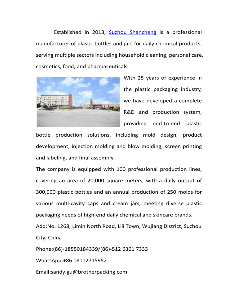 Established in 2013, Suzhou Shancheng is a professional manufacturer of plastic bottles and jars for daily chemical products, serving multiple sectors including household cleaning, personal care, cosmetics, food, and pharmaceuticals. With 25 years of experience in the plastic packaging industry, we have developed a complete R&D and production system, providing end-to-end plastic bottle production solutions, including mold design, product development, injection molding and blow molding, screen printing and labeling, and final assembly. The company is equipped with 100 professional production lines, covering an area of 20,000 square meters, with a daily output of 300,000 plastic bottles and an annual production of 250 molds for various multi-cavity caps and cream jars, meeting diverse plastic packaging needs of high-end daily chemical and skincare brands. Add:No. 1268, Limin North Road, Lili Town, Wujiang District, Suzhou City, China Phone:(86)-18550184339/(86)-512 6361 7333 WhatsApp:+86 18112715952 Email:[email protected] This 120ml safe and durable PET serum bottle is ideal for beauty and skincare packaging. Its transparent body and pink pump create a sophisticated yet simple aesthetic, showcasing the serum's texture and color, enhancing the product's visual appeal and creating a premium image. Made from food-grade PET, it ensures safety from the source, allowing direct contact with serums and other skincare ingredients without worrying about contamination. It also offers exceptional durability, resisting drops and scratches, making it remarkably resistant to breakage during daily transport and use. The bottle features a 24-thread mouth and a pump head for a perfect seal, effectively sealing out air and dust, preventing serum oxidation and deterioration, and extending its shelf life. The smooth feel and even, controllable dispense volume ensure convenient dispensing while minimizing waste. With a capacity of 120ml and an empty weight of approximately 25g, the bottle is a convenient size, perfectly balancing portability and longevity. It's ideal for filling a wide range of serums and a practical choice for beauty brands looking to enhance the quality of their products. This 500ml tough material spray bottle from PE is the ideal choice for both durability and practicality. Made from high-quality PE, the bottle is durable and drop-resistant, making it remarkably durable even from knocks and dings during daily use, ensuring it remains in excellent condition for years to come. The bottle's sleek, minimalist design, with clean, streamlined lines, complements a modern aesthetic while remaining easy to hold. The optimized push-button spray head delivers a smooth, effortless press, delivering a fine, even spray and precise control to minimize waste. The ample 500ml capacity meets the needs of gardening, plant care, and other applications, eliminating the need for frequent refills. The 28-thread neck provides a strong seal, effectively preventing leaks and making it easy to store at home or carry on the go. Whether used by home gardeners for spraying flowers and plants or for daily cleaning, this spray bottle offers reliable quality and a convenient and efficient experience.
