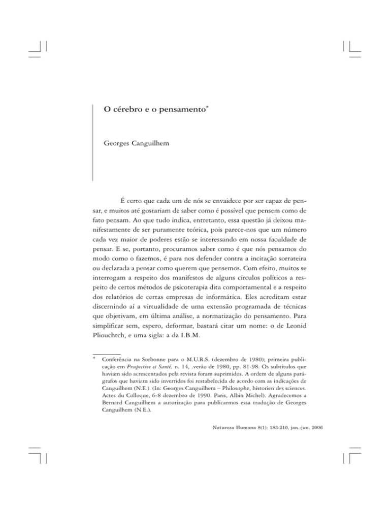 O cérebro e o pensamento* Georges Canguilhem É certo que cada um de nós se envaidece por ser capaz de pensar, e muitos até gostariam de saber como é possível que pensem como de fato pensam. Ao que tudo indica, entretanto, essa questão já deixou manifestamente de ser puramente teórica, pois parece-nos que um número cada vez maior de poderes estão se interessando em nossa faculdade de pensar. E se, portanto, procuramos saber como é que nós pensamos do modo como o fazemos, é para nos defender contra a incitação sorrateira ou declarada a pensar como querem que pensemos. Com efeito, muitos se interrogam a respeito dos manifestos de alguns círculos políticos a respeito de certos métodos de psicoterapia dita comportamental e a respeito dos relatórios de certas empresas de informática. Eles acreditam estar discernindo aí a virtualidade de uma extensão programada de técnicas que objetivam, em última análise, a normatização do pensamento. Para simplificar sem, espero, deformar, bastará citar um nome: o de Leonid Pliouchtch, e uma sigla: a da I.B.M. * Conferência na Sorbonne para o M.U.R.S. (dezembro de 1980); primeira publicação em Prospective et Santé, n. 14, .verão de 1980, pp. 81-98. Os subtítulos que haviam sido acrescentados pela revista foram suprimidos. A ordem de alguns parágrafos que haviam sido invertidos foi restabelecida de acordo com as indicações de Canguilhem (N.E.). (In: Georges Canguilhem – Philosophe, historien des sciences. Actes du Colloque, 6-8 dezembro de 1990. Paris, Albin Michel). Agradecemos a Bernard Canguilhem a autorização para publicarmos essa tradução de Georges Canguilhem (N.E.). Natureza Humana 8(1): 183-210, jan.-jun. 2006 Georges Canguilhem Da mesma forma que os biólogos acharam que só podiam falar do cérebro humano situando esse cérebro no extremo de uma história dos seres vivos, parece-me também apropriado, para começar uma palestra sobre o cérebro e o pensamento, situar essa questão, antes de mais nada, na história da cultura. Se, hoje, é fato notório ser o cérebro humano o órgão do pensamento, é preciso, entretanto, lembrar que um dos maiores filósofos da Antiguidade, Aristóteles, ensinava que a função do cérebro, antagonista da do coração, é a de arrefecer o corpo do animal. Foi Hipócrates quem ensinou que o cérebro é a sede das sensações, o órgão dos movimentos e dos juízos. É o que prova o tratado hipocrático Da doença sagrada (isto é, a epilepsia). Essa doutrina, retomada em parte por Platão, notadamente no Timeu, deve a Galeno o fato de ter-se imposto na cultura ocidental. O aristotelismo militante de Galeno não o desviou da tarefa de procurar a confirmação da tese hipocrática, praticando experiências muito engenhosas no sistema nervoso e no cérebro. Tendo recebido de suas origens e conservado no correr dos séculos a feição de uma questão concernente à sede da alma, nosso problema de hoje vem suscitando, a partir da filosofia cartesiana, uma filiação de teorias e uma sucessão de polêmicas de que somos hoje os herdeiros. É indispensável que façamos um rápido histórico para identificar a época em que devemos iniciar nosso exame. Trata-se do século XIX, momento em que se travou o combate do positivismo contra o espiritualismo: a teoria das localizações cerebrais. Costuma-se, com demasiada freqüência, situar o início desse histórico em Descartes. Isso é um perfeito contra-senso. Descartes ensinava que a alma indivisível está unida ao corpo por inteiro por meio de um órgão único e, por assim dizer, fisicamente pontual: a glândula pineal (o conarium dos antigos, a nossa epífise)1 . Não se tratava, portanto, de unir um pensamento dividido a um organe fédéral (órgão central do governo). 1 184 Epífise ou Glândula Pineal: corpúsculo oval situado no cérebro, por cima e atrás das camadas ópticas e ao qual se atribuem funções endócrinas. (N.R.) Natureza Humana 8(1): 183-210, jan.-jun. 2006 O cérebro e o pensamento Aqueles que posteriormente não entenderam que a função da glândula pineal era uma função metafisiológica, criticaram Descartes e foram procurar em outro lugar do cérebro a sede do sensorium commune. A lista é longa, de Willis a La Peyronier. Até mesmo a invenção da guilhotina deu margem a argumentações – por parte de médicos eminentes como Soemmering, correspondente de Kant – em favor desta ou daquela teoria. Cabanis (1795), para quem o cérebro secreta pensamentos assim como o fígado secreta a bílis, inseriu-se na controvérsia e debateu o caso da decapitação de Charlotte Corday. Em 1810, Gall publicou sua Anatomia e fisiologia do sistema nervoso em geral e do cérebro em especial. Foi naquele momento que surgiu, efetivamente, a ciência do cérebro, embora ela devesse, em seguida, ultrapassar o obstáculo inicial da frenologia, feita ao mesmo tempo de ingenuidade e de pretensão. O ponto forte da doutrina de Gall é a exclusividade que ele atribui ao encéfalo e, mais especialmente, aos hemisférios cerebrais como “sede” de todas as faculdades intelectuais e morais. O cérebro, entendido como um “sistema de sistemas”, é apresentado como o único suporte físico do quadro das faculdades. A frenologia é uma cranioscospia baseada na correspondência entre o conteúdo e o continente, entre a configuração dos hemisférios e a forma do crânio. Em oposição à ideologia sensualista e contra aquilo que hoje seria chamado de aquisição da experiência sob pressão do ambiente, Gall e seus discípulos sustentam a inerência das qualidades morais e dos poderes intelectuais. Mas, de forma oposta aos metafísicos espiritualistas, eles fundamentam esse inatismo no substrato anatômico de um órgão e não na substancialidade ontológica de uma alma. O interesse da controvérsia pode parecer, à distância, puramente teórico, quando na verdade, ele não o era. Ridicularizou-se bastante a corcova dos mat