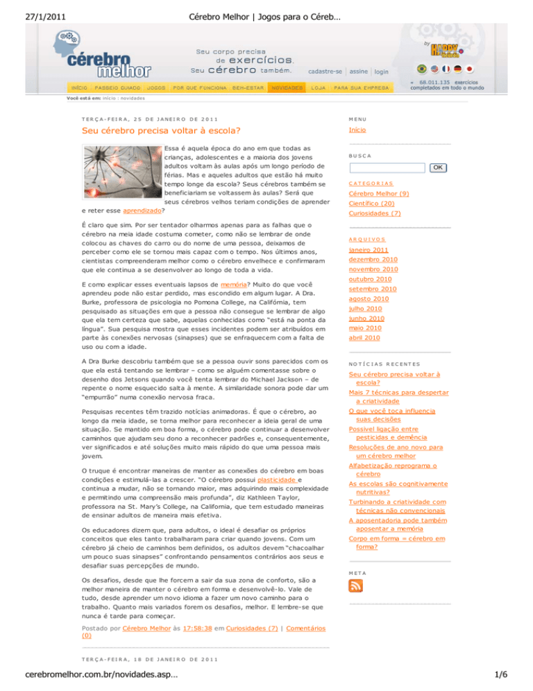 27/1/2011 Cérebro Melhor | Jogos para o Céreb… Você está em: iníc io : novidades T ER Ç A - F EI R A , 2 5 D E J A NEI R O D E 2 0 1 1 M ENU Seu cérebro precisa voltar à escola? Início Essa é aquela época do ano em que todas as c rianç as, adolesc entes e a maioria dos jovens BUSC A adultos voltam às aulas após um longo período de OK férias. Mas e aqueles adultos que estão há muito tempo longe da escola? Seus cérebros também se C A T EG O R I AS beneficiariam se voltassem às aulas? Será que Cérebro Melhor (9) seus cérebros velhos teriam condições de aprender Científico (20) e reter esse aprendizado? Curiosidades (7) É claro que sim. Por ser tentador olharmos apenas para as falhas que o cérebro na meia idade c ostuma cometer, c omo não se lembrar de onde colocou as chaves do c arro ou do nome de uma pessoa, deixamos de AR Q UIVO S perc eber como ele se tornou mais capaz c om o tempo. Nos últimos anos, janeiro 2011 cientistas c ompreenderam melhor c omo o c érebro envelhece e confirmaram dezembro 2010 que ele continua a se desenvolver ao longo de toda a vida. novembro 2010 E como explicar esses eventuais lapsos de memória? Muito do que voc ê aprendeu pode não estar perdido, mas esc ondido em algum lugar. A Dra. Burke, professora de psicologia no Pomona College, na Califórnia, tem outubro 2010 setembro 2010 agosto 2010 pesquisado as situações em que a pessoa não consegue se lembrar de algo julho 2010 que ela tem certeza que sabe, aquelas conhec idas como “está na ponta da junho 2010 língua”. Sua pesquisa mostra que esses inc identes podem ser atribuídos em maio 2010 parte às conexões nervosas (sinapses) que se enfraquecem c om a falta de abril 2010 uso ou com a idade. A Dra Burke descobriu também que se a pessoa ouvir sons parecidos com os que ela está tentando se lembrar – como se alguém c omentasse sobre o desenho dos Jetsons quando você tenta lembrar do Michael Jackson – de repente o nome esquec ido salta à mente. A similaridade sonora pode dar um “empurrão” numa c onexão nervosa frac a. Pesquisas recentes têm trazido notícias animadoras. É que o c érebro, ao longo da meia idade, se torna melhor para reconhecer a ideia geral de uma situação. Se mantido em boa forma, o cérebro pode c ontinuar a desenvolver caminhos que ajudam seu dono a reconhec er padrões e, c onsequentemente, ver significados e até soluç ões muito mais rápido do que uma pessoa mais jovem. O truque é encontrar maneiras de manter as c onexões do cérebro em boas condições e estimulá-las a crescer. “O cérebro possui plasticidade e continua a mudar, não se tornando maior, mas adquirindo mais complexidade e permitindo uma c ompreensão mais profunda”, diz Kathleen Taylor, professora na St. Mary’s College, na California, que tem estudado maneiras de ensinar adultos de maneira mais efetiva. Os educ adores dizem que, para adultos, o ideal é desafiar os próprios conceitos que eles tanto trabalharam para criar quando jovens. Com um cérebro já c heio de caminhos bem definidos, os adultos devem “c hacoalhar NO T Í C I A S R EC ENT ES Seu c érebro precisa voltar à escola? Mais 7 téc nicas para despertar a criatividade O que voc ê toca influenc ia suas decisões Possivel ligação entre pesticidas e demência Resoluções de ano novo para um cérebro melhor Alfabetização reprograma o cérebro As esc olas são cognitivamente nutritivas? Turbinando a criatividade com técnicas não convencionais A aposentadoria pode também aposentar a memória Corpo em forma = cérebro em forma? um pouc o suas sinapses” c onfrontando pensamentos c ontrários aos seus e desafiar suas percepções de mundo. M ET A Os desafios, desde que lhe forc em a sair da sua zona de c onforto, são a melhor maneira de manter o cérebro em forma e desenvolvê-lo. Vale de tudo, desde aprender um novo idioma a fazer um novo caminho para o trabalho. Quanto mais variados forem os desafios, melhor. E lembre-se que nunca é tarde para começar. Postado por Cérebro Melhor às 17:58:38 em Curiosidades (7) | Comentários (0) T ER Ç A - F EI R A , 1 8 D E J A NEI R O D E 2 0 1 1 cerebromelhor.com.br/novidades.asp… 1/6 27/1/2011 Cérebro Melhor | Jogos para o Céreb… Mais 7 técnicas para despertar a criatividade Já abordamos anteriormente a relação entre “Inteligência e criatividade” e como a criatividade pode ser melhorada por meio de estimulaç ão c ognitiva, como a oferecida nos jogos do Cérebro Melhor. Apresentamos também no artigo “Turbinando a criatividade c om técnicas não convencionais” uma série de técnicas, baseadas em pesquisas c ientíficas, para despertar a criatividade. Retomando esse... Leia Mais "Mais 7 técnicas para despertar a criatividade" Postado por Cérebro Melhor às 23:41:56 em Curiosidades (7) | Comentários (0) Q U I NT A - F EI R A , 1 3 D E J A NEI R O D E 2 0 1 1 O que você toca influencia suas decisões Da próxima vez que voc ê for negoc iar a compra de um carro, evite sentar em cadeiras macias que você fechará um negócio melhor. É a ciência que está dizendo.Nos últimos anos, psic ólogos estudando cognição têm demonstrado que muitos de nossos conceitos abstratos estão fundamentados em nossas experiências físicas no mundo. Por exemplo, Williams e Bargh mostraram que a ideia de calor interpessoal... Leia Mais "O que você toca influencia suas decisões" Postado por Cérebro Melhor às 08:35:28 em Científico (20) | Comentários (0) T ER Ç A - F EI R A , 4 D E J A NEI R O D E 2 0 1 1 Possivel ligação entre pesticidas e demência Por Dr. Bernard Croisile. Os resultados de um estudo c om 614 franceses que trabalham em vinhedos com idades na casa dos 40 e 50 anos demonstraram que pode haver uma ligação entre a exposição de longo prazo a pesticidas e a demência.Os participantes do estudo, que haviam trabalhado na agricultura por pelo menos 20 anos, foram classific ados pelo nível de exposiç ão que 