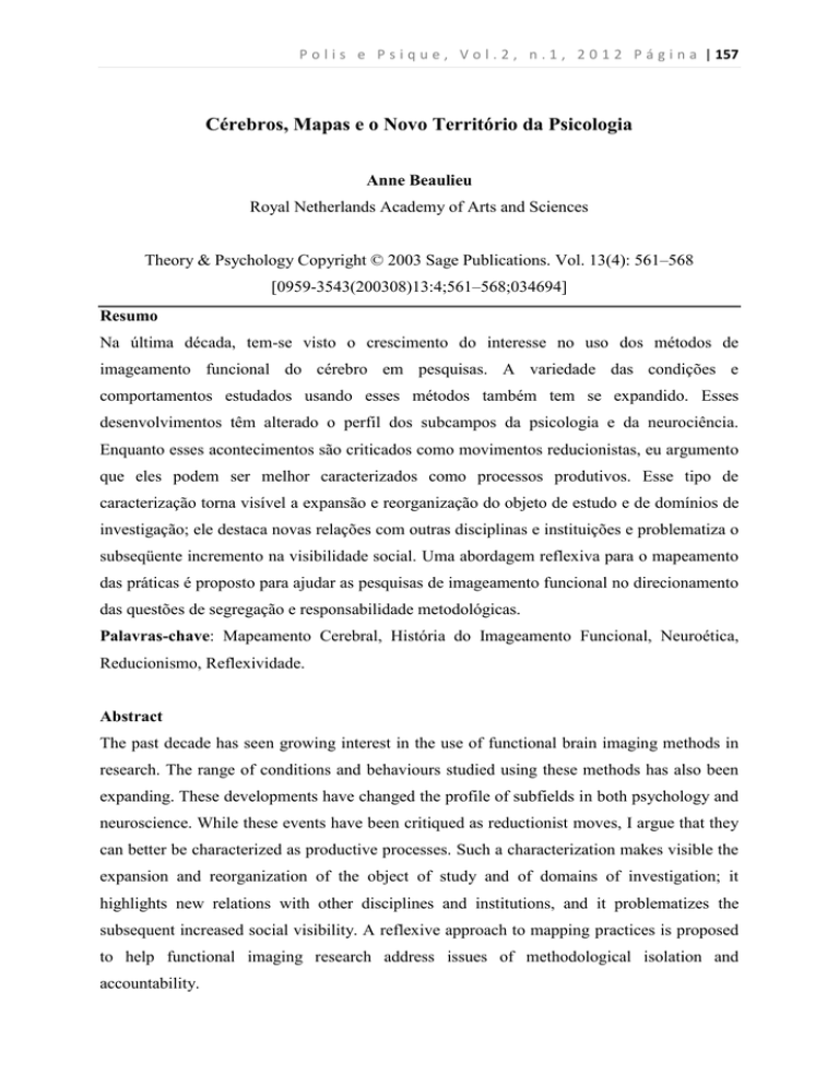 P o l i s e P s i q u e , V o l . 2 , n . 1 , 2 0 1 2 P á g i n a | 157 Cérebros, Mapas e o Novo Território da Psicologia Anne Beaulieu Royal Netherlands Academy of Arts and Sciences Theory & Psychology Copyright © 2003 Sage Publications. Vol. 13(4): 561–568 [0959-3543(200308)13:4;561–568;034694] Resumo Na última década, tem-se visto o crescimento do interesse no uso dos métodos de imageamento funcional do cérebro em pesquisas. A variedade das condições e comportamentos estudados usando esses métodos também tem se expandido. Esses desenvolvimentos têm alterado o perfil dos subcampos da psicologia e da neurociência. Enquanto esses acontecimentos são criticados como movimentos reducionistas, eu argumento que eles podem ser melhor caracterizados como processos produtivos. Esse tipo de caracterização torna visível a expansão e reorganização do objeto de estudo e de domínios de investigação; ele destaca novas relações com outras disciplinas e instituições e problematiza o subseqüente incremento na visibilidade social. Uma abordagem reflexiva para o mapeamento das práticas é proposto para ajudar as pesquisas de imageamento funcional no direcionamento das questões de segregação e responsabilidade metodológicas. Palavras-chave: Mapeamento Cerebral, História do Imageamento Funcional, Neuroética, Reducionismo, Reflexividade. Abstract The past decade has seen growing interest in the use of functional brain imaging methods in research. The range of conditions and behaviours studied using these methods has also been expanding. These developments have changed the profile of subfields in both psychology and neuroscience. While these events have been critiqued as reductionist moves, I argue that they can better be characterized as productive processes. Such a characterization makes visible the expansion and reorganization of the object of study and of domains of investigation; it highlights new relations with other disciplines and institutions, and it problematizes the subsequent increased social visibility. A reflexive approach to mapping practices is proposed to help functional imaging research address issues of methodological isolation and accountability. P o l i s e P s i q u e , V o l . 2 , n . 1 , 2 0 1 2 P á g i n a | 158 Key Words: Brain Mapping, History of Functional Imaging, Neuroethics, Reductionism, Reflexivity racial’ aplicados antes dos scans. Esse Tudo no Cérebro estudo foi publicado em um dos O argumento de que ‘tudo está no cérebro’ dificilmente principais periódicos científicos suscita americanos. Não se seguiu nenhum dúvidas. Quase todos os meses, uma protesto. Exatamente como medir esse nova área para tal processo ou uma rede traço pode ser debatido, mas aquele para é medo de que o Outro está conectado em encontrado e amplamente divulgado. De nossos cérebros é uma ideia que pode fato, ao longo da Década do Cérebro, a ser levada em consideração. É também ideia de uma base biológica para a uma ideia que parece não apenas mente tornou-se enraizada, tanto no carregar a agenda de um novo estilo de discurso popular quanto no científico. pesquisa psicológica, mas também de Algumas declarações sobre as bases abraçar biológicas de aprimoramento nas relações sociais. Se podem os mecanismos biológicos do medo aquele de comportamento certos personalidade traços ainda o podem Um artigo recente afirma ter encontrado eventualmente os substratos biológicos para atitudes (biologicamente, farmacologicamente) raciais (Phelps et al., 2000). Como modulados. atitudes complexas estar identificados, de ocasionalmente surpreender e chocar. poderiam ser compromisso podem também eles ser culturais tão O que não quer dizer que a relacionadas aos metodologia do mapeamento cerebral tecidos do cérebro e a circulação não vem sendo debatida, tanto dentro sanguínea? Um grupo de sujeitos foi quanto fora da comunidade de pesquisa. escaneado enquanto observavam rostos Figuras como Jerry Fodor e Tom Wolfe negros e brancos, e a atividade foi escreveram sobre as fraquezas desta mensurada em suas amígdalas (uma abordagem. Wolfe (1997) preocupa-se estrutura envolvida na aprendizagem com a queda de noções como cultura, emocional e no medo). O nível de self e alma, como um resultado dos atividade correspondia aos resultados cientistas examinando dentro de nossos dos sujeitos nos testes de ‘avaliação cérebros, tornando-os transparentes P o l i s e P s i q u e , V o l . 2 , n . 1 , 2 0 1 2 P á g i n a | 159 através das tecnologias de imageamento. Fodor (1999) insiste na complexos. Em uma frase: mapas ligam a vida da mente e o espaço do cérebro. importância de fazer questões sobre a O desenvolvimento do mente, para além de observar áreas mapeamento do cérebro tem marcado específicas do cérebro iluminando-se uma importante mudança na prática de em relação a uma determinada tarefa. experimentos Certamente, uma linha de argumento psicologia e da neurociência. Pela comumente ouvida quando se discute utilização mapeamento em escaneamento, fenômenos que estavam denunciar o reducionismo potencial dos sendo estudados utilizando medidas mapas cerebrais e apontar as limitações comportamentais, dos scans. Esse tipo de crítica não deixa estudados utilizando base cerebral, e, de ser interessante, mas pode perder mais importantes e anatômicas. Em vez de focar nos científicos desta nova tendência. Uma processos da mente no tempo, o crítica sobre esses mapas que visibilize mapeamento cerebral suas complexidades e o modo como são atenção para padrões no espaço do produtivos (não apenas redutivos) pode cérebro proporcionar um melhor trabalho de mudanças no foco dos experimentos são contextualização desta nova corrente de detalhadas em Images of Mind, de pesquisa. Posner e Raichle (1997), dois pioneiros cerebral aspectos consiste sociais em de certas áreas experimentos vieram especificamente, (Beaulieu, a da de se