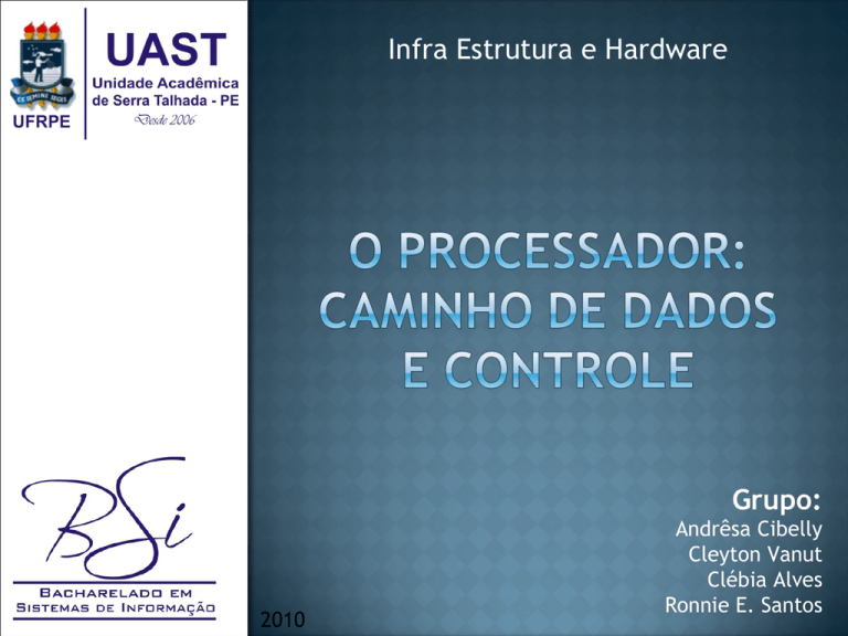 Infra Estrutura e Hardware Grupo: 2010 Andrêsa Cibelly Cleyton Vanut Clébia Alves Ronnie E. Santos Será mostrado: Como construir o Caminho de Dados e a Unidade de Controle O Processador: Caminho de dados e controle 1 - Instruções de Referência à memória: Load word (lw) Store Word (sw) 2 - Instruções Artimética e Lógicas: add, sub, and, or e stl 3 - Intruções de Desvio: Beq e Jump O Processador: Caminho de dados e controle A implementação de outras instruções pode ser feita de maneira similar Para qualquer instrução, os dois primeiros passos são idênticos: 1 Enviar o valor armazenado no Program Counter (PC) para a memória. 2 Ler um ou dois registradores, usando os campos da instrução para selecionar os registradores. add $t0, $s1, $s2 Sub $t1, $s3, $s4 lw $t1, 8($s5) O Processador: Caminho de dados e controle Após estes dois passos as ações necessárias a completar a execução de uma instrução dependem da classe de instrução em pauta. Semelhanças: Todas as classes usam a ULA após a leitura dos registradores; Referência de Memória: efetuar cálculo de endereço; Instruções Aritméticas: Execução da própria operação; Desvios condicionais: Comparações. O Processador: Caminho de dados e controle Após usar a ULA, as instruções diferem: Referência de Memória: acessa a memória para escrever/ler um dado; Instruções Aritméticas: Escreve em um registrador o valor calculado pela ULA; add $t0, $s1, $s2 Desvios condicionais: Com base no resultado de uma comparação, pode modificar o endereço da próxima instrução O Processador: Caminho de dados e controle Principais Unidades Funcionais e conexões entre elas Dados P C Endereço Instrução Reg 1# Reg 2# Memória de Instrução Reg 3# ULA Endereço Memória de Dados Dados O Processador: Caminho de dados e controle Dados P C Endereço Instrução Reg 1# Reg 2# Memória de Instrução Reg 3# ULA Endereço Memória de Dados Dados O processo começa no PC, que fornece o endereço da instrução à Memória de Instrução Após busca da instrução, os operandos armazenados em registradores usados pela instrução, são especificados pelos campos da própria instrução O Processador: Caminho de dados e controle Dados P C Endereço Instrução Reg 1# Reg 2# Memória de Instrução Reg 3# ULA Endereço Memória de Dados Dados Uma vez que os operandos em registradores tenham sido buscados, podem ser operados para: calcular um endereço de memória, o resultado de ma operação aritmética ou fazer comparações Após busca da instrução, os operandos armazenados em registradores usados pela instrução, são especificados pelos campos da própria instrução O Processador: Caminho de dados e controle Dados P C Endereço Instrução Reg 1# Reg 2# Memória de Instrução Reg 3# ULA Endereço Memória de Dados Dados Se a instrução for... Aritmética Acesso à memória Desvios condicionais O resultado processado pela ULA deve ser escrito em um registrador. O resultado obtido na ULA é usado como endereço para armazenar valores vindos da memória nos registradores, ou o contrario Devem usar a saída da ULA para determinar o endereço da próxima instrução a ser executada O Processador: Caminho de dados e controle Ao discutir o projeto de máquina, deve-se decidir: Como a lógica que vai implementá-la deve operar Como será o esquema de Clock nela usado. Unidades Funcionais da implementação do MIPS são construídas a partir de dois tipos de elementos lógicos: Elementos que operam sobre dados Elementos que contêm estados. O Processador: Caminho de dados e controle Elementos que operam sobre dados (combinacionais) Sua saída depende das entradas presentes no momento, ou seja, em presença das mesmas entradas, sempre produz a mesma saída. ULA ULA: Exemplo de elemento combinacional O Processador: Caminho de dados e controle Elementos de Estados Um elemento contém estado (sequenciais) possui algum tipo de memória interna. Caso a máquina seja desligada, ao reinicializá-la os elementos de estado serão carregados com os mesmo valores que tinham antes. Dados P C Endereço Instrução Reg 1# Reg 2# Memória de Instrução Reg 3# ULA Endereço Memória de Dados Dados O Processador: Caminho de dados e controle Define quando os sinais podem ser lidos e quando podem ser escritos. Importante, pois se um sinal for lido e escrito ao mesmo tempo, o valor da leitura pode corresponder ao antigo, ao novo valor ou mesmo uma cominação dos dois. Para simplificar, trabalha-se com uma metodologia sensível às transições de sinal do clock. O Processador: Caminho de dados e controle Num projeto de caminho de dados é preciso examinar quais os componentes utilizados na execução de cada uma das classes de instruções do MIPS. Assim, iniciamos com os componentes do caminho de dados comum a todas as instruções. Construímos, a partir deles, as diversas seções do caminho de dados para cada classe de instruções. Nesta construção são mostrados os respectivos sinais de controle associados aos componentes. Baseamos esta construção nos seguintes passos de execução de uma instrução: Busca,Execução e Resultado. O Processador: Caminho de dados e controle O primeiro passo de uma instrução é o passo de busca. Ele é comum a qualquer instrução. Para realizar a busca são necessários três componentes: dois elementos de estado e um somador. Memória de Instruções O Processador: Caminho de dados e controle PC Somador Unidade de Memória: Armazenar as instruções; Programa Counter-PC: Armazena o endereço da próxima instrução a ser executada; Somador: Calcula o endereço da próxima instrução a ser executada. O Processador: Caminho de dados e controle O caminho de Dados para a realização da busca é a seguinte: O Processador: Caminho de dados e controle Todas instruções lógicas e aritméticas do processador MIPS precisam ler dois registradores, realizar a operação sobre o conteúdo dos regi