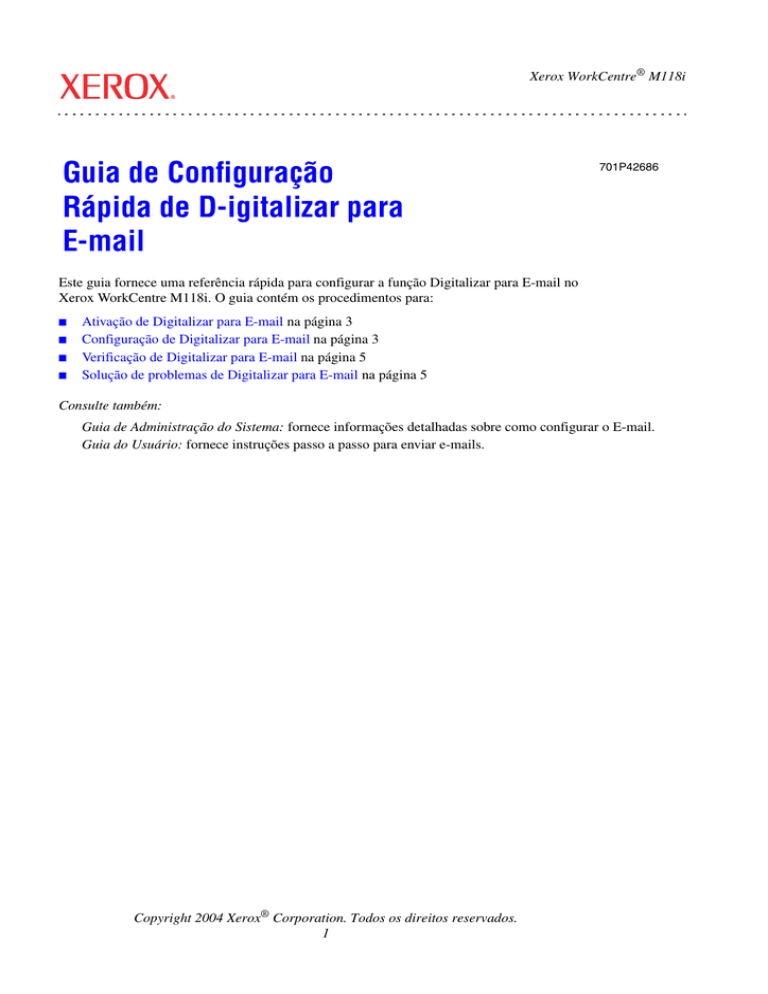 Xerox WorkCentre® M118i Guia de Configuração Rápida de D-igitalizar para E-mail 701P42686 Este guia fornece uma referência rápida para configurar a função Digitalizar para E-mail no Xerox WorkCentre M118i. O guia contém os procedimentos para: ■ ■ ■ ■ Ativação de Digitalizar para E-mail na página 3 Configuração de Digitalizar para E-mail na página 3 Verificação de Digitalizar para E-mail na página 5 Solução de problemas de Digitalizar para E-mail na página 5 Consulte também: Guia de Administração do Sistema: fornece informações detalhadas sobre como configurar o E-mail. Guia do Usuário: fornece instruções passo a passo para enviar e-mails. Copyright 2004 Xerox® Corporation. Todos os direitos reservados. 1 Antes de começar Antes de ativar e configurar a função Digitalizar para E-mail: ■ ■ Assegure-se de que a máquina esteja conectada à uma rede TCP/IP. Consulte o Guia de Configuração Rápida de Conexão da Rede para mais informações. Obtenha as seguintes informações do seu administrador da rede ou Fornecedor de Serviços de Internet (ISP): Requerido: Endereço de E-mail do Administrador ____________________________________________ Note Digite o endereço de e-mail criado para o equipamento M118i no campo Endereço de E-Mail do Administrador. O endereço de e-mail preenche o campo De de cada e-mail enviado do equipamento M118i. Se um endereço de e-mail para o equipamento não tiver sido criado, digite o seu endereço de e-mail. Quando um endereço de e-mail tiver sido criado para o equipamento, substitua o seu endereço de e-mail pelo endereço de e-mail do equipamento. Consulte Configuração de Digitalizar para E-mail na página 3. Endereço do Servidor SMTP __________ . __________ . __________ . __________ Endereço de E-mail local para teste ____________________________________________ Opcional: Endereço do Servidor DNS __________ . __________ . __________ . __________ Endereço do Servidor POP3 __________ . __________ . __________ . __________ Login do POP3 Nome de Usuário: ____________________________________________ Senha: ______________________________________ Xerox WorkCentre M118i 2 Ativação de Digitalizar para E-mail Ativação de Digitalizar para E-mail Para ativar a função Digitalizar para E-mail: 1. No painel de controle, pressione o botão de Log In/Out. 2. Pressione o botão de Seleção abaixo do visor para selecionar Configurações do Sistema. a. Use o teclado numérico para inserir a Senha. A senha padrão é 11111. b. Pressione o botão de Seleção para selecionar Confirmar. 3. Selecione Configurações de Impressão, e, em seguida, pressione o botão Entrar. 4. Pressione o botão de Seleção até que Opção de Software apareça no visor e, em seguida, pressione o botão Entrar. 5. Use o teclado numérico para inserir a senha da Opção de Software de Digitalizar para E-mail e, em seguida, pressione o botão Entrar. A senha pode ser encontrada na capa interna das Instruções para Digitalizar para E-mail. Configuração de Digitalizar para E-mail Após a ativação de Digitalizar para E-mail, siga essas etapas para configurar a função Digitalizar para E-mail na sua rede. Definir o Endereço do Administrador de E-mail 1. 2. 3. 4. No seu computador, inicie o navegador da web. Digite o endereço IP da máquina no campo Endereço do navegador (http://xxx.xxx.xxx.xxx). Clique na guia Propriedades. Selecione Detalhes da Máquina na barra lateral esquerda. a. Digite o endereço de e-mail do equipamento no campo Endereço de E-mail do Administrador. Se um endereço de e-mail para o equipamento não tiver sido criado, digite o seu endereço de e-mail. Quando o endereço de e-mail estiver disponível para o equipamento M118i, repita as Etapas de 1 a 5 neste procedimento para substituir o seu endereço de e-mail pelo endereço de e-mail do equipamento. b. Clique no botão Aplicar Novas Configurações na parte inferior da página. c. Digite o Nome de Usuário e a Senha do administrador do CentreWare IS, e, em seguida, clique no botão OK. Observação O Nome de Usuário padrão do administrador do CentreWare IS é admin e a senha é x-admin. Estas devem ser alteradas após a configuração da rede ter sido concluída. d. No aviso de comando Reinicializar, clique no botão Reinicializar. 5. Aguarde um minuto para que a reinicialização seja concluída e, em seguida, clique no botão Atualizar do navegador. Xerox WorkCentre M118i 3 Configuração de Digitalizar para E-mail Ativar as Portas de E-mail 1. Clique na guia Propriedades. 2. Selecione Status da Porta na barra lateral esquerda. a. Ative as portas SNMP, Enviar E-mail e Serviço de Aviso de Correspondência. Não modifique as outras configurações de portas nessa página. b. Clique no botão Aplicar Novas Configurações na parte inferior da página. c. No aviso de comando Reinicializar, clique no botão Reinicializar. 3. Aguarde um minuto para que a reinicialização seja concluída e, em seguida, clique no botão Atualizar do navegador. Digitar as Configurações de SMTP 1. Clique na guia Propriedades. 2. Selecione a pasta Configurações do Protocolo na barra lateral esquerda e, em seguida, selecione E-mail. a. Digite o Endereço do Servidor SMTP. b. Se a autenticação de SMTP for requerida, digite o Endereço do Servidor POP3, Nome do Usuário POP, e a Senha do Usuário POP. Observação O Endereço do Servidor POP3 pode ser digitado como um Endereço IP ou nome de servidor. c. Se a máquina usar um nome de host ao invés de um Endereço IP, clique em TCP/IP na barra lateral esquerda e assegure-se de que o campo Endereço de DNS 1 contenha o Endereço do Servidor DNS. Para mais informações, consulte o Guia de Configuração Rápida de Conexão da Rede. d. Clique no botão Aplicar Novas Configurações na parte inferior da página. e. No aviso de comando Reinicializar, clique no botão Reinicializar. 3. Aguarde um minuto para que a reinicialização seja 