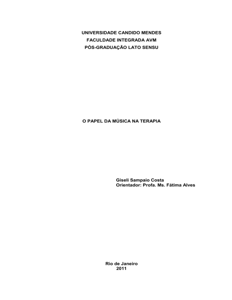 UNIVERSIDADE CANDIDO MENDES FACULDADE INTEGRADA AVM PÓS-GRADUAÇÃO LATO SENSU O PAPEL DA MÚSICA NA TERAPIA Giseli Sampaio Costa Orientador: Profa. Ms. Fátima Alves Rio de Janeiro 2011 UNIVERSIDADE CANDIDO MENDES FACULDADE INTEGRADA AVM PÓS-GRADUAÇÃO LATO SENSU O PAPEL DA MÚSICA NA TERAPIA Monografia apresentada pela acadêmica Giseli Sampaio Costa como exigência do curso de pós-graduação em Arteterapia da Universidade Candido Mendes sob a orientação da professora Fátima Alves. Rio de Janeiro 2011 AGRADECIMENTOS Deus, meu tudo! Minha família, meu tesouro, João Igor e Maria Eduarda. Mana, amiga de todas as horas, tiazona, Marillyn, você é 10, obrigada por tudo. A distância não diz nada quando amamos alguém. Pri, na angústia nasce um irmão. Meus intercessores: Kedma (mãezona), Lana, Meire, Lílian e Brígida. Pastor Lauremir, amigão! Sua esposa Vitória e família. Obrigada pelo carinho. Liosana, obrigada pela ajuda. Jana e Luiz, obrigada por me apoiar e acolher sempre. DEDICATÓRIA Dedico esta monografia a meus filhos, João Ígor e Maria Eduarda. RESUMO A música – arte e ciência de combinar os sons de modo agradável ao ouvido – assim como outras expressões culturais e artísticas, é capaz de despertar sentimentos e trazer lembranças à memória. É um conjunto de significados, representações e percepções distintas, que tornam possível afirmar que cada indivíduo a perceberá de uma maneira diferente. Essa arte põe em funcionamento diversas áreas do cérebro humano, podendo ainda induzir atos, pensamentos e emoções, como ocorre com a música religiosa, romântica ou com uma mais agitada. Este trabalho tem como objetivo analisar os benefícios que a música, através da arteterapia, pode oferecer ao ser humano. Além disto, se propõe a investigar o poder, a importância e a utilização de uma melodia no processo de cura. A estudar a música como um agente influenciador nas emoções e nos sentimentos das pessoas, já que essa abrange as dimensões mental/psicológica, física, social e espiritual do indivíduo. Sendo considerada, assim, uma terapia capaz de aflorar certos tipos de características na personalidade do indivíduo. Palavras-chave: Música, cérebro humano, arteterapia, processo de cura. Nos últimos anos, diversos estudos vêm sendo realizados no intuito de conhecer os efeitos que, alguns recursos artísticos, como a música, podem causar no cérebro de pacientes que fazem uso de tratamentos terapêuticos. O termo que designa a utilização de recursos artísticos em contexto terapêutico é a arteterapia. Já a ciência que objetiva desenvolver potenciais e/ou restabelecer funções do indivíduo para que ele possa alcançar uma melhor integração intra e/ou interpessoal e, conseqüentemente, uma melhor qualidade de vida, pela prevenção, reabilitação ou tratamento através da música denomina-se Musicoterapia. A Musicoterapia é a utilização da música e seus elementos – som, ritmo, melodia e harmonia – por um musicoterapeuta qualificado, com um cliente ou grupo, num processo para facilitar e promover a comunicação, relação, aprendizagem, mobilização, expressão, organização e outros objetivos terapêuticos relevantes, no sentido de alcançar necessidades físicas, emocionais, mentais, sociais e cognitivas. Partindo de pesquisas interdisciplinares e utilizando-se de metodologias investigativas baseadas nas modernas técnicas artísticas, um dos objetivos dos estudos terapêuticos empreendidos com a música é conhecer como ela pode ajudar no processo de reabilitação emocional de um indivíduo. Dessa forma, nos últimos anos, importantes discussões e estudos no campo da Musicoterapia estão sendo realizados como forma de integrar os resultados obtidos com a realidade prática da música. A partir do reconhecimento da importância das pesquisas desenvolvidas por musicoterapeutas para a prática musical e, da necessidade de divulgar estes estudos aos profissionais da área terapêutica, tem desenvolvido um trabalho de conclusão de curso que pretende destacar as implicações do uso da música em tratamentos terapêuticos, sob a orientação da professora Fátima Alves. Este relato de experiências tem por objetivo apresentar o projeto de pesquisa e parte da literatura que subsidia este trabalho. Finalmente, feitas algumas considerações. SUMÁRIO INTRODUÇÃO .................................................................................................. 07 CAPÍTULO I - O CAMINHO DO SOM ............................................................... 11 CAPÍTULO II - A MÚSICA E O CÉREBRO ....................................................... 19 CAPÍTULO III - OS EFEITOS DA MÚSICA ....................................................... 23 CAPÍTULO IV - TERAPIAS EXPRESSIVAS ..................................................... 26 CONSIDERAÇÕES FINAIS .............................................................................. 36 REFERÊNCIAS................................................................................................. 37 ÍNDICE ............................................................................................................. 39 8 INTRODUÇÃO Segundo o dicionário Aulete, música é uma palavra que veio do grego mousikós, que representa a arte e ciência de combinar os sons de modo agradável ao ouvido. Porém, a influência da música no ser humano vai muito além do lazer de escutar um disco ou ensinar como um processo pedagógico, podendo servir até mesmo para fins terapêuticos. É o caso da Musicoterapia. Essa ciência utiliza a música e seus elementos sonoros como terapia para a obtenção de uma potencialidade do individuo, resultando numa melhor qualidade de vida, seja ela feita por prevenção, reabilitação ou tratamento. A música é conhecida como meio terapêutico desde a Antiguidade. Relatos históricos comprovam que tem sido reconhecido por milhares