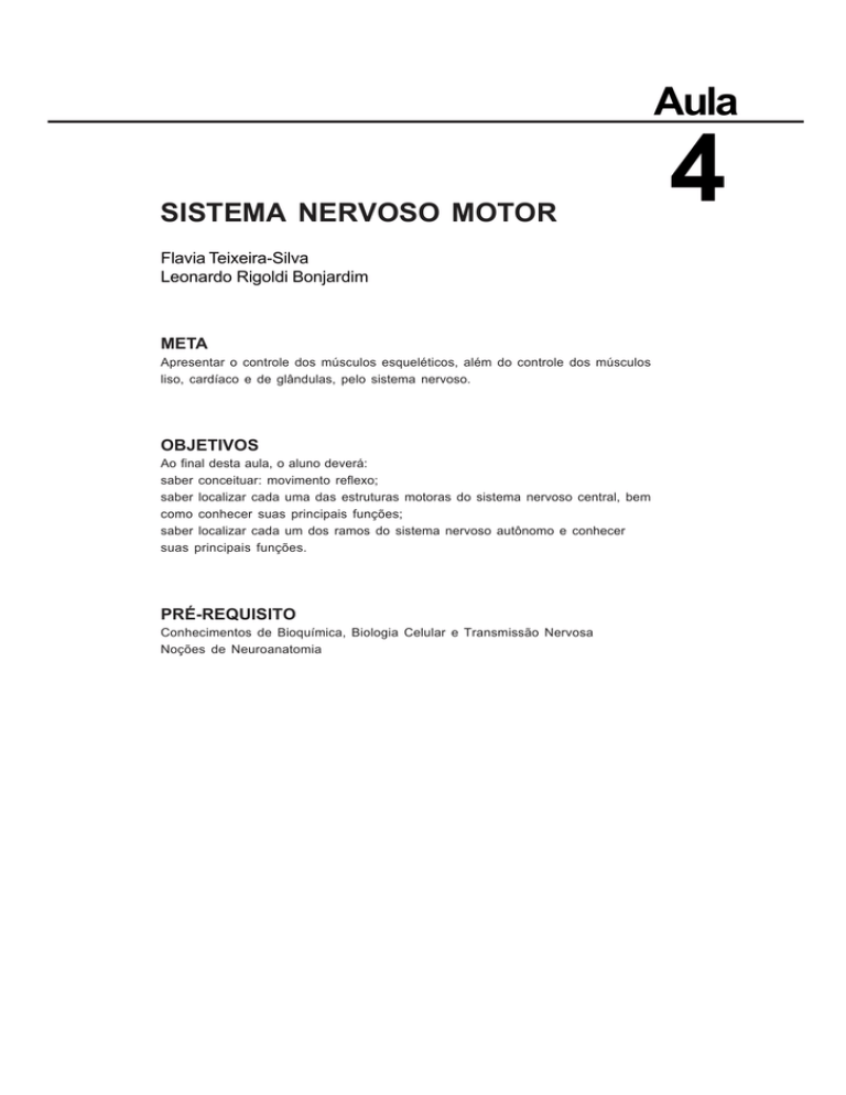 Aula SISTEMA NERVOSO MOTOR Flavia Teixeira-Silva Leonardo Rigoldi Bonjardim META Apresentar o controle dos músculos esqueléticos, além do controle dos músculos liso, cardíaco e de glândulas, pelo sistema nervoso. OBJETIVOS Ao final desta aula, o aluno deverá: saber conceituar: movimento reflexo; saber localizar cada uma das estruturas motoras do sistema nervoso central, bem como conhecer suas principais funções; saber localizar cada um dos ramos do sistema nervoso autônomo e conhecer suas principais funções. PRÉ-REQUISITO Conhecimentos de Bioquímica, Biologia Celular e Transmissão Nervosa Noções de Neuroanatomia 4 Fisiologia Básica INTRODUÇÃO Olá. Nas aulas anteriores você aprendeu os mecanismos básicos da fisiologia sensorial. Muito bem. O sistema nervoso sensorial é o que nos possibilita perceber o mundo. Mas do que adiantaria perceber o mundo se não pudéssemos responder a ele? É aí que entra o sistema nervoso motor. O tempo todo, estamos expostos a diversas modalidades de estímulos sensoriais: visuais, auditivos, olfativos, somestésicos... Você lembra que cada uma dessas modalidades é de responsabilidade de uma área diferente do córtex cerebral. No entanto, num determinado momento, todas as informações sensoriais são combinadas no que chamamos de área de associação parieto occipto-temporal e se transformam em percepções de ordem mais alta. Estas, então, são transferidas para a área de associação pré-frontal, onde avaliamos a situação e decidimos como reagir a ela. Qualquer que seja a decisão – falar, correr, chorar -, sua manifestação envolverá movimento. Além da musculatura esquelética, a musculatura dos nossos órgãos também responderá às condições do meio (tanto externo quanto interno), no entanto seu movimento será sempre involuntário. Sendo assim, nessa aula, vamos explorar os mecanismos básicos de controle do movimento esquelético e visceral. (Fonte: http://www.campcursos.com.br). 94 Sistema Nervoso Motor CONTROLE DA MUSCULATURA ESQUELÉTICA: MEDULA ESPINHAL Aula 4 Embora muitos pensem que a medula é simplesmente uma via de passagem dos impulsos nervosos do sistema nervoso periférico em direção ao encéfalo, este raciocínio é equivocado. Na verdade, a medula é bem mais que isso. Ela é capaz de integrar respostas simples a estímulos específicos, os chamados reflexos. CONTROLE DA MUSCULATURA ESQUELÉTICA: “FOI SEM QUERER QUERENDO” Você já deve ter passado pela experiência do reflexo patelar. Lembra de um médico batendo no seu joelho com um martelinho de borracha? E o que você fez em resposta? Chutou o médico, “sem querer”! Este é um exemplo clássico de reflexo medular. A resposta foi realmente independente de sua vontade. Isso porque o estímulo sensorial não precisou chegar a nível consciente para que fosse gerada uma resposta, já que a própria medula se encarregou disso. Agora você deve estar se perguntando: “Qual a importância desses movimentos reflexos?”. Os reflexos medulares têm um papel protetor. Determinados estímulos, potenciais causadores de lesão, devem ser evitados o mais rápido possível. O processamento deles pela medula acelera a geração de uma resposta, já que assim o percurso percorrido pelos impulsos nervosos é menor que se eles tivessem que chegar ao encéfalo. Tal percurso é chamado de arco reflexo. O arco reflexo (Fig. 4.1) é composto por: 1) receptor sensorial; 2) neurônio sensorial; 3) centro integrador (medula, no caso de reflexos medulares); 4) neurônio motor; e 5) efetor (músculo esquelético, no caso de movimento). Podem existir também interneurônios entre o neurônio sensorial e o motor. 95 Fisiologia Básica Na ausência de interneurônios, ocorrerá somente uma sinapse no arco reflexo, que será então chamado de arco monossináptico. Na presença de um ou mais interneurônios, ocorrerão duas ou mais sinapses, e o arco reflexo será chamado de polissináptico. Reflexos mediados por arcos monossinápticos e polissinápticos são chamados reflexos mono e polissinápticos, respectivamente. CONTROLE DA MUSCULATURA ESQUELÉTICA: PROTEGENDO OS MÚSCULOS Os músculos são o tempo todo protegidos de lesões através de dois reflexos: reflexo de estiramento e reflexo tendinoso. A fim de entender melhor estes mecanismos, vamos relembrar dois receptores sensoriais importantes: fuso neuromuscular e órgão tendinoso de Golgi. 96 Sistema Nervoso Motor Aula 4 Preste atenção à Fig. 4.2. Perceba que num músculo, o fuso neuromuscular encontra-se entre as fibras musculares extrafusais. Ele é formado por um tipo especial de fibra muscular, chamada fibra intrafusal, cuja porção central é envolta por uma terminação nervosa. O papel deste tipo de fibra não é promover o encurtamento do músculo, mas enviar ao sistema nervoso central, informações acerca do comprimento do músculo, ou sobre a velocidade de alteração de seu comprimento. Assim, toda vez que o músculo aumenta de comprimento em relação ao seu repouso, o fuso neuromuscular aumenta sua freqüência de disparos. 97 Fisiologia Básica Agora observe a Fig. 4.3, onde está representado o órgão tendinoso de Golgi. Este receptor muscular é formado por ramificações nodosas de uma fibra sensorial que parte de um tendão, e informa o sistema nervoso central sobre o grau de tensão do músculo. Assim, toda vez que o músculo se contrai, o tendão é estirado e o órgão tendinoso de Golgi aumenta sua freqüência de disparos. Voltemos agora ao reflexo de estiramento, um reflexo monossináptico, cujo melhor exemplo é o reflexo patelar. A Fig. 4.4 mostra o processo passo a passo. Repare que paralelamente ao reflexo de estiramento ocorre outro reflexo – o de inibição recíproca. Neste, os músculos antagonistas do quadríceps são relaxados, graças à presença de um interneurônio inibitório no arco reflexo. A inibição recíproca ocorre para permitir que o membro se movimente 