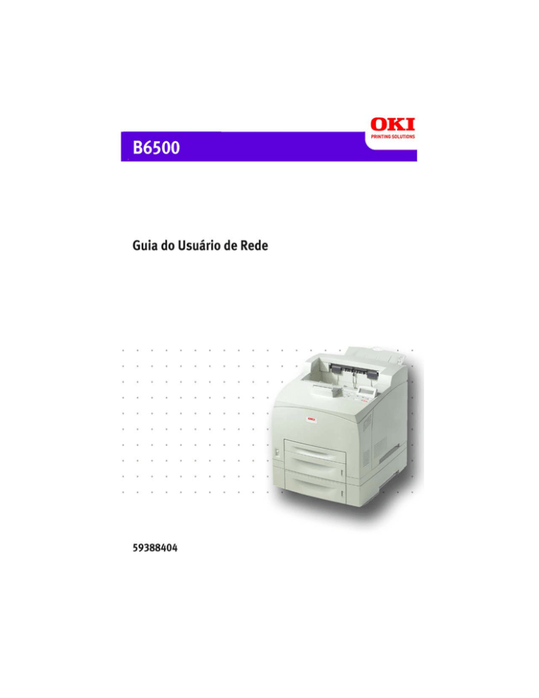 Informações sobre direitos autorais Copyright © 2007. pela Oki Data Americas, Inc. Todos os direitos reservados Título do documento ________________________________________ B6500 Guia do Usuário de Rede P/N 59388404 Revisão 2.0 março, 2007 Aviso de isenção ___________________________________________ Todos os esforços foram empenhados para assegurar que as informações contidas neste documento sejam completas, precisas e atuais. A fabricante não se responsabiliza pelos resultados de erros que estejam além de seu controle. Além disso, a fabricante não garante que alterações feitas em softwares e equipamentos produzidos por outros fabricantes e mencionados neste manual não afetarão a aplicabilidade das informações aqui contidas. A menção de produtos de software fabricados por outras empresas não constitui necessariamente endosso da fabricante. Embora todos os esforços razoáveis tenham sido feitos para tornar esse documento o mais preciso e útil possível, não oferecemos garantia de qualquer tipo, explícita ou implícita, em relação à precisão ou totalidade das informações contidas neste manual. Os manuais e os controladores mais atuais estão disponíveis no site na Web: http://www.okiprintingsolutions.com Informações sobre marcas registradas__________________________ OKI é uma marca registrada da Oki Electric Industry Company, Ltd. Macintosh e Mac OS são marcas registradas da Apple Computers, Inc. Microsoft e Windows são marcas registradas ou marcas da Microsoft Corporation nos Estados Unidos e/ou em outros países. Outros nomes de produtos e de marcas são marcas registradas ou marcas dos respectivos proprietários. Informações normativas _____________________________________ Este produto atende aos requisitos das Diretivas do Conselho 89/336/EEC (EMC), 73/23/EEC (LVD) e 1999/5/EC (R&TTE) com emendas, conforme aplicável, em aproximação à legislação dos países membros quanto à Compatibilidade Eletromagnética, à Baixa Voltagem e ao Equipamento do Terminal de Telecomunicações. B6500 Guia do Usuário de Rede 2 Sumário Informações sobre direitos autorais . . . . . . . . . . . .2 Título do documento . . . . . . . . . . . . . Aviso de isenção . . . . . . . . . . . . . . . . Informações normativas . . . . . . . . . . Informações sobre marcas registradas . . . . . . . . . . . . . . . . . . . . . . . . . . . . . . . . . . . . . . . . . . . . . . . . . . . . . . . . . . . . 2 2 2 2 Prefácio . . . . . . . . . . . . . . . . . . . . . . . . . . . . . . . . . .4 Como usar este manual . . . . . . . . . . . . . . . . . . . . . .5 Conhecimento necessário. . . . . . . . . . . . . . . . . . . . . . . . . 5 Organização . . . . . . . . . . . . . . . . . . . . . . . . . . . . . . . . . . 5 Convenções . . . . . . . . . . . . . . . . . . . . . . . . . . . . . . . . . . 6 Visão geral . . . . . . . . . . . . . . . . . . . . . . . . . . . . . . . .7 Ambiente compatível . . . . . . . . . . . . . . . . . . . . . . . . . . . . 7 Configuração . . . . . . . . . . . . . . . . . . . . . . . . . . . . . . . . . 8 Configuração da impressora usando um navegador. . . . . . . 9 Impressão a partir de um computador com sistema operacional Windows . . . . . . . . . . . .11 Visão geral . . . . . . . . . . . . . . . . . . . . . . . . Instalação do protocolo TCP/IP . . . . . . . . . . Configuração como uma impressora de rede Criação de uma impressora compartilhada . . OKI LPR . . . . . . . . . . . . . . . . . . . . . . . . . . . . . . . . . . . . . . . . . . . . . . . . . . . . . . . . . . . . . . . . . . . . . . . . . . . . .11 .12 .15 .20 .21 Impressão a partir de sistema operacional UNIX .23 Para imprimir a partir de sistema operacional UNIX. . . . . . .23 Número do trabalho . . . . . . . . . . . . . . . . . . . . . . . . . . . .29 Opção -C (Comando LPR). . . . . . . . . . . . . . . . . . . . . . . . .32 Impressão a partir de um computador Macintosh .38 Configuração do sistema . . . . . . . . . . . . . . . . . . . . . . . . .38 Computadores de destino . . . . . . . . . . . . . . . . . . . . . . . .38 Procedimento de configuração . . . . . . . . . . . . . . . . . . . . .38 Compatibilidade com SNMP . . . . . . . . . . . . . . . . . .40 Software de rede . . . . . . . . . . . . . . . . . . . . . . . . . .41 Status Monitor . . . . . . . . . . . . . . . . . . . . . . . . . . . . . . . .41 Precauções e limitações . . . . . . . . . . . . . . . . . . . . .43 Sobre o uso de TCP/IP . . . . . . . . . . . . . . . . . . . . . . . . . . .43 Diagnóstico e resolução de problemas . . . . . . . . .48 Uso de TCP/IP . . . . . . . . . . . . . . . . . . . . . . . . . . . . . . . .48 Ao usar EtherTalk . . . . . . . . . . . . . . . . . . . . . . . . . . . . . .54 Configuração do endereço IP . . . . . . . . . . . . . . . . . . . . . .60 Apêndice A: Configuração do endereço IP . . . . . . .61 B6500 Guia do Usuário de Rede Sumário - 3 Prefácio Obrigado por escolher esta impressora. Este Manual de Rede fornece todas as informações necessárias sobre como instalar e usar esta impressora em rede. Leia-o com atenção para assegurar a utilização plena e eficiente deste produto em rede e mantenha-o em um local de fácil acesso para realizar consultas rápidas caso tenha alguma dificuldade ao usar o equipamento. B6500 Guia do Usuário de Rede 4 Como usar este manual Conhecimento necessário Leia este manual detalhadamente antes de usar a impressora. Se não estiver familiarizado com o equipamento ao qual a impressora será conectada ou com as funções ou conceitos básicos do software, leia primeiro os manuais relevantes. Equipamentos ao qual a impressora será conectada e software referem-se a computadores pessoais, estações de trabalho, redes e os respectivos sistemas operacionais e aplicativos nos quais estes equipamentos estão instalados. Organização Descrevemos a seguir um resumo de cada capítulo. Visão geral Este capítulo contém informa