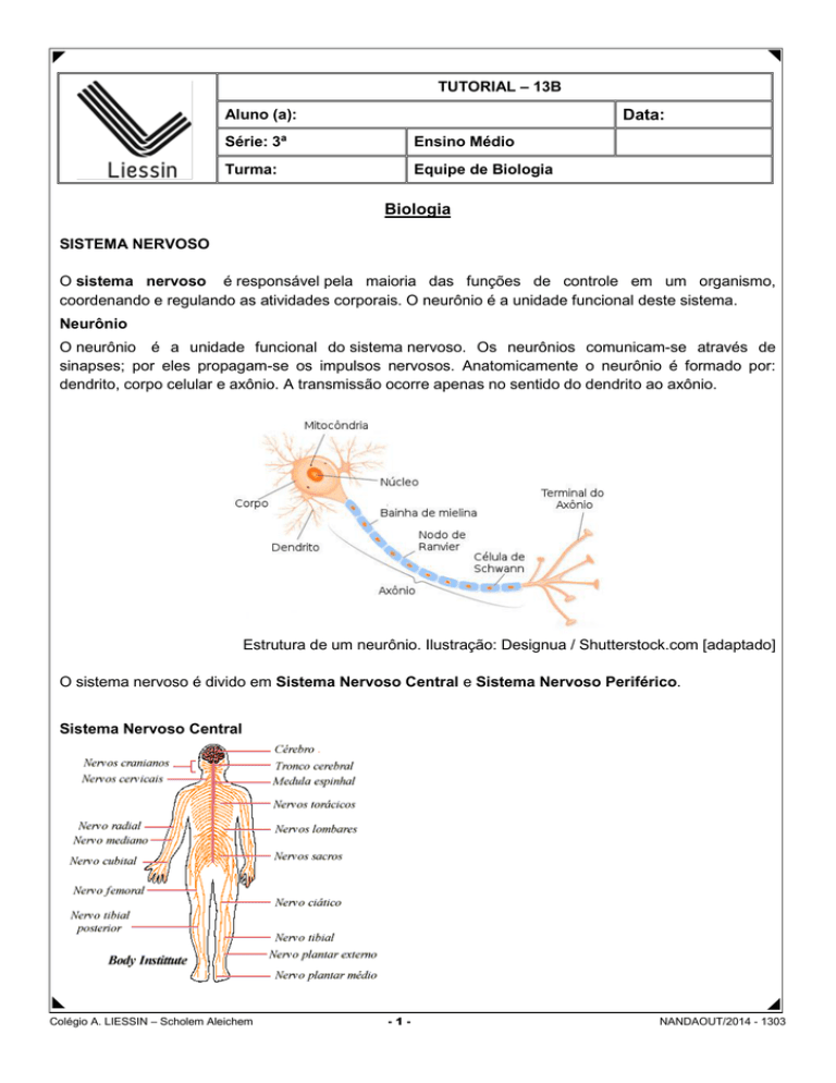 TUTORIAL – 13B Data: Aluno (a): Série: 3ª Ensino Médio Turma: Equipe de Biologia Biologia SISTEMA NERVOSO O sistema nervoso é responsável pela maioria das funções de controle em um organismo, coordenando e regulando as atividades corporais. O neurônio é a unidade funcional deste sistema. Neurônio O neurônio é a unidade funcional do sistema nervoso. Os neurônios comunicam-se através de sinapses; por eles propagam-se os impulsos nervosos. Anatomicamente o neurônio é formado por: dendrito, corpo celular e axônio. A transmissão ocorre apenas no sentido do dendrito ao axônio. Estrutura de um neurônio. Ilustração: Designua / Shutterstock.com [adaptado] O sistema nervoso é divido em Sistema Nervoso Central e Sistema Nervoso Periférico. Sistema Nervoso Central Colégio A. LIESSIN – Scholem Aleichem -1- NANDAOUT/2014 - 1303 Principais componentes do Sistema Nervoso Central: Medula espinhal A medula espinhal é o centro dos arcos reflexos. Encontra-se organizada em segmentos (região cervical, lombar, sacral, caudal, raiz dorsal e ventral). É uma estrutura subordinada ao cérebro, porem pode agir independente dele. Cérebro O cérebro está relacionado com a maioria das funções do organismo como a recepção de informações visuais nos vertebrados, movimentos do corpo que requerem coordenação de grande número de partes do corpo. O cérebro encontra-se protegido pelas meninges: pia-máter, dura-máter e aracnóide. O encéfalo dos mamíferos é dividido em: telencéfalo (cérebro), diencéfalo (tálamo e hipotálamo), mesencéfalo (teto), metencéfalo (ponte e cerebelo) e mielencéfalo (bulbo). Bulbo ou medula oblonga O bulbo tem a função relacionada com a respiração e é considerado um centro vital. Também está relacionado com os reflexos cardiovasculares e transmissão de informações sensoriais e motoras. Cerebelo O cerebelo é responsável pelo controle motor. A organização básica do cerebelo é praticamente a mesma em todos os vertebrados, diferindo apenas no número de células e grau de enrugamento. Pesquisas recentes sugerem que a principal função do cerebelo seja a coordenação sensorial e não só o controle motor. Ponte A função da ponte é transmitir as informações da medula e do bulbo até o córtex cerebral. Faz conexão com centros hierarquicamente superiores. O córtex sensorial coordena os estímulos vindos de várias partes do sistema nervoso. O córtex motor é responsável pelas ações voluntárias e o córtex de associação está relacionado com o armazenamento da memória. Principais divisões do Sistema Nervoso Periférico O SNP pode ser divido em voluntário e autônomo. Sistema Nervoso Voluntário Está relacionado com os movimentos voluntários. Os neurônios levam a informação do SNC aos músculos esqueléticos, inervando-os diretamente. Pode haver movimentos involuntários. Sistema Nervoso Autônomo Está relacionado com os movimentos involuntários dos músculos como não-estriado e estriado cardíaco, sistema endócrino e respiratório. É divido em simpático e parassimpático. Eles têm função antagônica sobre o outro. São controlados pelo SNC, principalmente pelo hipotálamo e atuam por meio da adrenalina e da acetilcolina. O mediador químico do SNA simpático é a acetilcolina e a adrenalina, enquanto do parassimpático é apenas a acetilconlina. Colégio A. LIESSIN – Scholem Aleichem -2- NANDAOUT/2014 - 1303 Arco reflexo Os atos reflexos são reações involuntárias que envolvem impulsos nervosos, percorrendo um caminho chamado arco reflexo. Um exemplo muito conhecido de arco reflexo é o reflexo patelar. O tendão do joelho é o órgão receptor do estímulo. Quando recebe o estímulo (ex. uma pancada) os dendritos dos neurônios ficam excitados. O impulso é transmitido aos neurônios associativos por meio de sinapses, que por sua vez transmitem o impulso aos neurônios motores. Os neurônios associativos levam a informação ao encéfalo e os neurônios motores excitam os músculos da coxa, fazendo com que a perna se movimente. EXERCICIOS: 1. Sabemos que o sistema nervoso pode ser dividido em sistema nervoso central e sistema nervoso periférico. A respeito do sistema nervoso central, marque a alternativa incorreta: a) O sistema nervoso central é composto por medula espinhal e encéfalo. b) O encéfalo, parte integrante do sistema nervoso central, é responsável por controlar diversas funções vitais do nosso organismo. c) Fazem parte do sistema nervoso central diversos nervos e gânglios nervosos. d) A medula espinhal fica alojada no interior do canal formado pelas perfurações das vértebras. e) O sistema nervoso central processa informações vindas de outras partes do corpo e) medula espinhal e encéfalo. 2. A respeito do sistema nervoso, marque a alternativa INCORRETA: a) O tecido que forma o sistema nervoso é o tecido nervoso, que possui como célula principal o neurônio. b) Os neurônios são responsáveis pelo recebimento e transmissão do impulso nervoso e possuem como partes principais os dendritos, o corpo celular e o axônio. c) Os neurônios permanecem conectados entre si, formando uma espécie de fio contínuo por onde os impulsos nervosos propagam-se. d) O sistema nervoso e o sistema endócrino possuem uma íntima relação, sendo o sistema nervoso responsável, por exemplo, por estimular algumas glândulas a produzirem hormônios. 3. Que nome recebe a célula especializada na propagação do impulso nervoso? Marque a alternativa que responde a essa pergunta: a) Neutrófilos b) Neurônios c) Condrócitos d) Miócitos e) Basófilos 4. Os anestésicos, largamente usados pela Medicina, tornam regiões ou todo o organismo insensível à dor porque atuam: a) nos axônios, aumentando a polarização das células. b) nas sinapses, impedindo a transmissão do impulso nervoso. c) nos dendritos, invertendo o sentido do impulso nervoso. d) no corpo celular dos neurônios, bloqueando o met