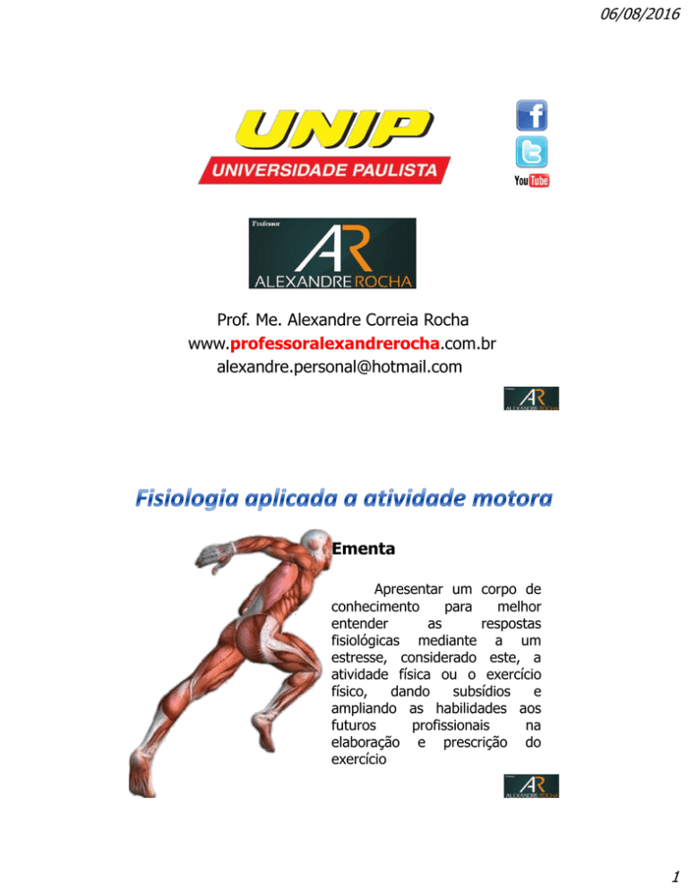 06/08/2016 Prof. Me. Alexandre Correia Rocha www.professoralexandrerocha.com.br [email protected] Ementa Apresentar um corpo de conhecimento para melhor entender as respostas fisiológicas mediante a um estresse, considerado este, a atividade física ou o exercício físico, dando subsídios e ampliando as habilidades aos futuros profissionais na elaboração e prescrição do exercício 1 06/08/2016 Objetivos gerais Conhecer as principais estruturas e o funcionamento dos sistemas responsáveis pelo movimento Objetivos específicos Entender os processos que suportam as demandas energéticas durante a atividade física 2 06/08/2016 Conteúdo programático Controle nervoso movimento muscular do o Estrutura e função do sistema nervoso o Substâncias transmissoras excitatórias e inibitórias o Somação espacial e temporal o Órgãos sensoriais proprioceptivos o Sistema nervoso e habilidades motoras Conteúdo programático Fontes energéticas o Metabolismo e sistemas energéticos básicos o Energia para atividade celular o Bioenergética: Síntese de ATP o Sistemas energéticos e exercício 3 06/08/2016 Conteúdo programático Equilíbrio térmico e exercício o Regulação da temperatura o Exercício sob altas temperaturas e distúrbios induzidos pelo calor o Prevenção dos distúrbios térmicos Estratégia de Trabalho oAulas expositivas (slides e filmes) oDiscussão sobre artigos científicos sugeridos na literatura 4 06/08/2016 Avaliação oAtravés de provas oficiais. Bibliografia básica 1. Wilmore, J.H. e Costill, D.L. Fisiologia do esporte e do exercício. Ed. Manole, 1ª edição, São Paulo,2001 2. Foss, M.L. e Keteyian, S.J. Bases fisiológicas do exercício e do esporte. Ed. Guanabara Koogan, 6ª ed. Rio de Janeiro, 2000. 3. McArdle, W., Katch, F.I. Katch, V.L. Fundamentos de fisiologia do exercício. Ed. Guanabara Koogan, 2ª ed. Rio de Janeiro, 2000 5 06/08/2016 Bibliografia complementar 1. Robergs, R.A. e Roberts, S.O. Princípios fundamentais de fisiologia do exercício: Para aptidão, desempenho e saúde. Ed. Phorte, 1ª edição, São Paulo,2002 2. Garret Jr, W.E.; Kirkendall, D.T. e cols. A ciência do exercício e dos esportes. Ed. Artmed, 1ª ed. São Paulo, 2003. 3. Ghorayb, N. e Barros, T.L.N. O exercício – Preparação fisiológica, avaliação médica, aspectos especiais e preventivos. Ed. Atheneu, 1ª ed. São Paulo, 1999. 4. Plowman, S.A. Fisiologia do exercício para saúde, aptidão e desempenho / Sharon A. Plowman, Denise L. Smith; traduzido por Giuseppe Taranto. – Rio de Janeiro: Guanabara Koogan,2009. 5. Curi, R. Araújo Filho, J.P. Fisiologia Básica. – Rio de Janeiro: Guanabara Koogan,2011 Áreas de concentração Sistema nervoso central Controle nervoso do movimento humano Fontes energéticas Equilíbrio térmico e exercício 6 06/08/2016 Sistema Nervoso Central - SNC Sistema Nervoso Central Quem é o nosso SNC? 7 06/08/2016 Divisão funcional do SN SNC Encéfalo Medula espinhal 8 06/08/2016 Encéfalo - Divisão anatômica Cérebro Cerebelo Tronco encefálico HEMISFÉRIOS CEREBRAIS O Encéfalo 9 06/08/2016 Composição do sistema nervoso central O Encéfalo 1.CEREBRO: Maior porção da massa do encéfalo 2.DIENCEFALO: Tálamo e hipotálamo 3.MESENCEFALO 4.CEREBELO: 2ª maior porção da massa do encéfalo 5.PONTE (protuberância) 6.BULBO RAQUIDIANO (bulbo) 10 06/08/2016 HEMISFÉRIOS CEREBRAIS O Encéfalo Coordena ações voluntárias e atos involuntários O Encéfalo Hemisférios: Direito e esquerdo Conectados - Interconexão: feixe de fibras (corpo caloso) 11 06/08/2016 Lóbulos cerebrais Lobo frontal Intelecto e controle motor geral Lobo temporal Estímulo auditivo e sua interpretação Lobo parietal Estímulo sensorial e sua interpretação Lobo occipital Estímulo visual e sua interpretação O córtex cerebral Forma a porção externa dos hemisférios cerebrais Também é denominado substância cinzenta(Camada externa): Corpos celulares. Substância branca (Parte interna): axônios e dendritos. 12 06/08/2016 O córtex cerebral 1. 2. 3. Principais funções do córtex: Organização dos movimentos complexos Armazenamento das experiências aprendidas Recepção de informações sensoriais Substâncias Branca e Cinzenta Encéfalo Medula espinhal 13 06/08/2016 O Cerebelo Conectado a várias partes do cérebro Coordenação do movimento Auxilio no controle do movimento em resposta ao feedback dos proprioceptores Tronco Cerebral Composto pelo mesencéfalo, ponte e bulbo Conexão entre Encéfalo e Medula 14 06/08/2016 O Diencéfalo Formada principalmente pelo Tálamo e pelo Hipotálamo Tálamo: Centro de integração sensorial e importante região de controle motor Hipotálamo: Manutenção da homeostasia. Seus centros neurais regulam: O Diencéfalo SNA: PA, FC, contratibilidade cardíaca, respiração, etc... Temperatura corporal Equilíbrio hídrico O controle neuroendócrino Emoções Sede Ingestão alimentar 15 06/08/2016 Medula Espinhal Tem cerca de 1cm de diâmetro e 45cm de comprimento Centro nervoso de atos involuntários Veículo condutor de impulsos nervosos. 16 06/08/2016 Medula Espinhal Medula espinhal Vias eferentes Neurônios motores Vias aferentes Neurônios sensoriais 17 06/08/2016 Vias descendentes motoras Vias ascendentes sensoriais Gânglios Divisão anatômica Sistema Nervoso Periférico - SNP 18 06/08/2016 NERVOS CRANIANOS Parte basal do próprio encéfalo NERVOS ESPINHAIS ou RAQUIDIANOS Saem da medula, por meio do forame intervertebral, a cada nível medular 19 06/08/2016 Medula espinhal Núcleo: 3 principais tipos de neurônios (interneurônio, motoneurônios e neurônios sensoriais Vista dorsal Vista frontal Medula espinhal 20 06/08/2016 Organização do SNC Resposta de níveis inferiores - Medula. Organização do SNC Resposta de níveis superiores - Encéfalo. 21 06/08/2016 SNP S.N. VOLUNTÁRIO S.N. AUTÔNOMO SNS SNP Adrenérgicos Colinérgicos Nervos que partem das regiões TORÁCICA e LOMBAR Substâncias químicas geralme