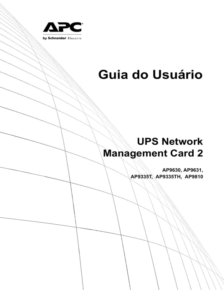 Guia do Usuário UPS Network Management Card 2 AP9630, AP9631, AP9335T, AP9335TH, AP9810 This manual is available in English on the APC Web site (www.apc.com). Dieses Handbuch ist in Deutsch auf der APC Webseite (www.apc.com) verfügbar. Este manual está disponible en español en la página web de APC (www.apc.com). Ce manuel est disponible en français sur le site internet d’APC (www.apc.com). Questo manuale è disponibile in italiano sul sito web di APC (www.apc.com). Este manual está disponível em português no site da APC (www.apc.com). Данное руководство на русском языке доступно на сайте APC (www.apc.com ) Deze handleiding is beschikbaar in het Nederlands op de APC Website (www.apc.com). 本マニュアル<各国の言語に対応する>は APC ウェブサイト (www.apc.com) からダウ ンロードできます。 APC 웹싸이트 (www.apc.com) 에 한국어 매뉴얼 있습니다 . 在 APC 公司的网站上 (www.apc.com) 有本手册的中文版。 This manual is available in English on the enclosed CD. Dieses Handbuch ist in Deutsch auf der beiliegenden CD-ROM verfügbar. Este manual está disponible en español en el CD-ROM adjunto. Ce manuel est disponible en français sur le CD-ROM ci-inclus. Questo manuale è disponibile in italiano nel CD-ROM allegato. Este manual está disponível em português no CD fornecido. Данное руководство на русском языке имеется на прилагаемом компакт-диске. Deze handleiding staat in het Nederlands op de bijgevoegde cd. 本マニュアルの日本語版は同梱の CD-ROM からご覧になれます。 동봉된 CD 안에 한국어 매뉴얼이 있습니다 . 您可以从包含的 CD 上获得本手册的中文版本。 Introdução Descrição do produto Recursos As duas placas de gerenciamento de rede da American Power Conversion (APC®) mencionadas abaixo são produtos baseados na Web, prontos para uso com IPv6 e que gerenciam os dispositivos suportados utilizando vários padrões abertos como: - HTTP (Hypertext Transfer Protocol) - SNMPv1, SNMPv3 (Simple Network Management Protocol) versões 1 e 3 - FTP (File Transfer Protocol) - Telnet - SSH (Secure SHell) - HTTPS - HTTP (Hypertext Transfer Protocol) em conjunto com SSL (Secure Sockets Layer) - SCP (Secure CoPy) A placa de gerenciamento de rede AP9630: • Fornece recursos de programação de autoteste e controle do no-break • Fornece registros de dados e eventos • Fornece suporte ao utilitário PowerChute® Network Shutdown [utilitário de desligamento de rede] da APC • É compatível com o uso de um servidor DHCP (Dynamic Host Configuration Protocol) ou BOOTP (BOOTstrap) para fornecer os valores de rede (TCP/IP) da placa de gerenciamento • Permite usar o Serviço de Monitoração Remota (RMS, Remote Monitoring Service) da APC • Permite configurar a notificação por meio do registro de eventos (pela placa de gerenciamento e Syslog), e-mail e traps de SNMP. Você pode configurar a notificação para eventos únicos ou grupos de eventos, com base no nível de gravidade ou na categoria de eventos • Permite exportar um arquivo de configuração do usuário (.ini) a partir de uma placa configurada para uma ou mais placas não configuradas sem converter o arquivo em binário • Fornece uma seleção de protocolos de segurança para autenticação e criptografia • Comunica-se com o InfraStruXure® Central ou com o InfraStruXure Manager A placa de gerenciamento de rede AP9631 inclui todos os recursos da placa de gerenciamento de rede AP9630 e também os seguintes: • Fornece duas portas USB • Dá suporte a duas portas universais de entrada/saída às quais você pode conectar: – Sensores de temperatura ou temperatura/umidade – Conectores de entrada/saída de relé que suportam dois contatos de entrada e um relé de saída Guia do Usuário da Placa de Gerenciamento de Rede 2 do No-break 1 Dispositivos da APC nos quais você pode instalar a placa de gerenciamento. A placa de gerenciamento pode ser instalada nos seguintes dispositivos da APC: • Qualquer modelo Smart-UPS® que tenha um slot de expansão interno, ou qualquer no-break Symmetra® exceto os no-breaks Symmetra PX 250 e Symmetra PX 500 • Chassi de expansão (AP9600) • Triplo chassi de expansão (AP9604) Configuração inicial do IPv4 Você deve definir duas configurações de TCP/IP para a placa de gerenciamento antes que ela possa ficar em operação na rede: • Endereço IP da placa de gerenciamento • Endereço IP do gateway padrão (necessário somente se você for sair do segmento) Cuidado: Não use o endereço de auto-retorno (127.0.0.1) como o gateway padrão. Isso desativará a placa. Em seguida, você deve fazer logon utilizando uma conexão serial e retornar as configurações de TCP/IP aos seus padrões. Para ajustar as configurações de TCP/IP consulte o Manual de Instalação da placa de gerenciamento de rede disponível no CD de utilitários da placa de gerenciamento de rede da APC e na forma impressa. Para obter informações detalhadas sobre como utilizar um servidor DHCP para ajustar as configurações de TCP/IP em uma placa de gerenciamento, consulte “Configurações TCP/IP e comunicação” na página 63. Configuração inicial do IPv6 A configuração de rede com IPv6 proporciona flexibilidade para atender aos requisitos do usuário. Para ajustar as configurações de TCP/IP para o IPv6 consulte o Manual de Instalação da Placa de Gerenciamento de Rede disponível como arquivo PDF no CD de utilitários da placa de gerenciamento de rede da APC e no site da Web da APC www.apc.com. Recursos de gerenciamento de rede Esses aplicativos e utilitários funcionam com um no-break conectado à rede por meio da placa de gerenciamento. • Desligamento de rede com o PowerChute - Proporciona um desligamento remoto normal, sem necessidade de monitoramento, dos computadores conectados a n