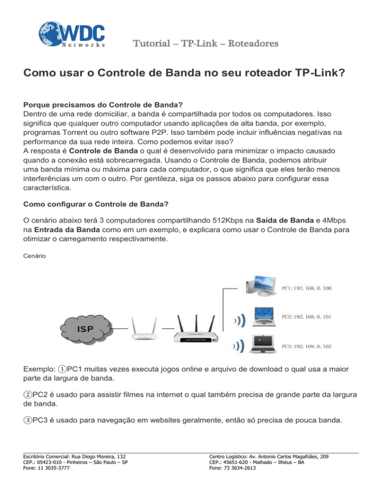 Tutorial – TP-Link – Roteadores Como usar o Controle de Banda no seu roteador TP-Link? Porque precisamos do Controle de Banda? Dentro de uma rede domiciliar, a banda é compartilhada por todos os computadores. Isso significa que qualquer outro computador usando aplicações de alta banda, por exemplo, programas Torrent ou outro software P2P. Isso também pode incluir influências negativas na performance da sua rede inteira. Como podemos evitar isso? A resposta é Controle de Banda o qual é desenvolvido para minimizar o impacto causado quando a conexão está sobrecarregada. Usando o Controle de Banda, podemos atribuir uma banda mínima ou máxima para cada computador, o que significa que eles terão menos interferências um com o outro. Por gentileza, siga os passos abaixo para configurar essa característica. Como configurar o Controle de Banda? O cenário abaixo terá 3 computadores compartilhando 512Kbps na Saída de Banda e 4Mbps na Entrada da Banda como em um exemplo, e explicara como usar o Controle de Banda para otimizar o carregamento respectivamente. Cenário Exemplo: ①PC1 muitas vezes executa jogos online e arquivo de download o qual usa a maior parte da largura de banda. ②PC2 é usado para assistir filmes na internet o qual também precisa de grande parte da largura de banda. ③PC3 é usado para navegação em websites geralmente, então só precisa de pouca banda. _______________________________________________________________________________________________________________________ Escritório Comercial: Rua Diogo Moreira, 132 Centro Logístico: Av. Antonio Carlos Magalhães, 209 CEP.: 05423-010 - Pinheiros – São Paulo – SP CEP.: 45651-620 - Malhado – Ilhéus – BA Fone: 11 3035-3777 Fone: 73 3634-2613 Tutorial – TP-Link – Roteadores Passo 1 Abra o navegador de internet e na barra de endereço digite no acesso padrão como: tplinklogin.net Nota: Por favor, encontre o acesso padrão no rótulo fixado no produto. Passo 2: Digite o usuário e senha na página de acesso. O usuário e senha padrão são "admin" em letras minúsculas. Passo 3: Clique no Controle da Banda - Parâmetros no menu à esquerda. Nota: Por exemplo, se você tem um Modem ADSL, por gentileza, selecione ADSL no tipo de linha. Se você não sabe como selecionar o Tipo de Linha, por gentileza, contate sua operadora de internet a qual o tipo de linha você tem acesso. A Saída de Banda e Entrada de Banda devem ser a real banda fornecida por sua operadora (1Mbps = 1024Kbps) Passo 4: Clique Salvar para salvar as configurações. _______________________________________________________________________________________________________________________ Escritório Comercial: Rua Diogo Moreira, 132 Centro Logístico: Av. Antonio Carlos Magalhães, 209 CEP.: 05423-010 - Pinheiros – São Paulo – SP CEP.: 45651-620 - Malhado – Ilhéus – BA Fone: 11 3035-3777 Fone: 73 3634-2613 Tutorial – TP-Link – Roteadores Passo 5: Clique em Controle de Banda - Regras na esqueda d apágina, você poderá ver e configurar as regras. Passo 6 Clique Adicionar para adicionar uma nova regra. Range de IP - Endereço de IP fixo ou um intervalo de endereços de IP. Quando você configura o endereço de IP fixo, o computador com esse endereço de IP terá independente do controle de banda atribuído. Quando você configura o Range do endereço de IP, todos os computadores no Range compartilharão a banda atribuida. Range de Porta - O Range de porta do protocolo TCP ou protocolo UDP _______________________________________________________________________________________________________________________ Escritório Comercial: Rua Diogo Moreira, 132 Centro Logístico: Av. Antonio Carlos Magalhães, 209 CEP.: 05423-010 - Pinheiros – São Paulo – SP CEP.: 45651-620 - Malhado – Ilhéus – BA Fone: 11 3035-3777 Fone: 73 3634-2613 Tutorial – TP-Link – Roteadores Protocolo - Você pode escolher o protocolo TCP ou protocolo UDP ou ambos. Saída de Controle de Banda - O máximo e o mínimo de velocidade de upload o qual através da porta WAN, número padrão é 0. Entrada de Controle de Banda - O máximo é o mínimo de velocidade de download através da porta WAN, número padrão é 0. NOTE: É melhor configurar endereço de IP estático no seu computador local ou configurar a reserva de endereço no roteador wireless a fim de gerenciar facilmente. Sobre como configurar as propriedades TCP/IP no seu computador, por gentileza, consulte a FAQ 14. Sobre como configurar a reserva de endereço, por gentileza, consulte a FAQ 182. Passo 7 De acordo com a demanda dos clientes, a banda pode ser distribuida da seguinte forma. A partir das regras, a Banda Máxima pode garantir que o PC1 e o PC2 pode ocupar toda a banda quando está sozinha para acessar a internet e o Banda Mínimo pode garantir que eles tem a necessidar da banda quando mais do que um PC trabalha ao mesmo tempo. Nota: A quantidade da Saída mínima de banda e Entrada mínima de banda que você configurou deve ser menos que a Saída da Banda e Entrada da Banda que você configurou na página Configurações do Controle de Banda anteriormente. _______________________________________________________________________________________________________________________ Escritório Comercial: Rua Diogo Moreira, 132 Centro Logístico: Av. Antonio Carlos Magalhães, 209 CEP.: 05423-010 - Pinheiros – São Paulo – SP CEP.: 45651-620 - Malhado – Ilhéus – BA Fone: 11 3035-3777 Fone: 73 3634-2613 Tutorial – TP-Link – Roteadores Passo 8 Habilite o Controle de Banda e clique no botão Salvar nas Configurações de Controle de Banda para obter efeito. _______________________________________________________________________________________________________________________ Escritório Comercial: Rua Diogo Moreira, 132 Centro Logístico: Av. Antonio Carlos Magalhães, 209 CEP.: 05423-010 - Pinheiros – São Paulo – SP CEP.: 45651-620 - Malhado – Ilhéus – BA Fone: 