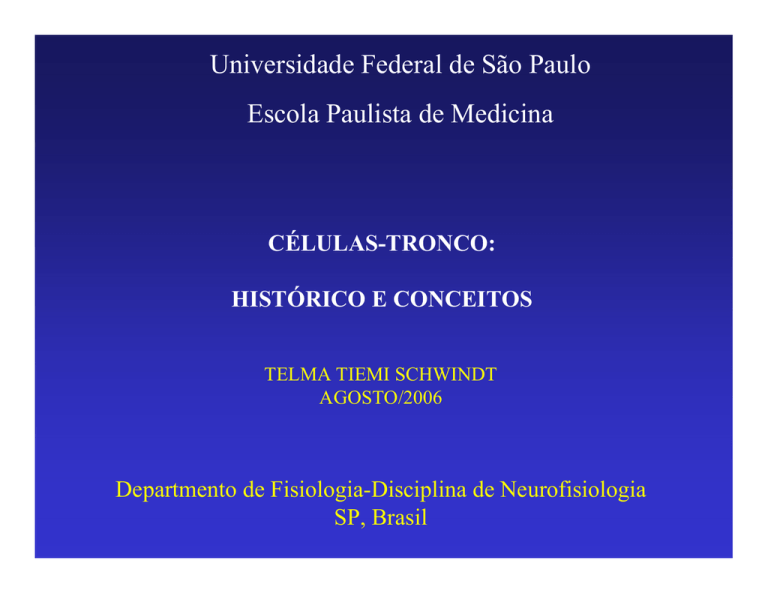Universidade Federal de São Paulo Escola Paulista de Medicina CÉLULAS-TRONCO: HISTÓRICO E CONCEITOS TELMA TIEMI SCHWINDT AGOSTO/2006 Departmento de Fisiologia-Disciplina de Neurofisiologia SP, Brasil O QUE SÃO CÉLULAS-TRONCO? Células-tronco são células capazes de se autorenovarem e de se diferenciarem em pelo menos um tipo de tecido. Plasticidade Totipotente: capaz de dar origem a qualquer tipo celular embrionário ou extra-embrionário Pluripotente: capaz de dar origem a células dos três folhetos embrionários Multipotente:capaz de dar origem a um subconjunto de linhagens celulares Oligopotente: capaz de dar origem a um número mais restrito de linhagens celulares que as multipotentes Unipotente: capaz de dar origem a um único tipo celular Mecanismos de Plasticidade Amy J. Wagers and Irving L. Weissman, Cell, vol 116, 2004 Stem cells: Cell fusion causes confusion A E Wurmser & F H Gage Nature 416, 485 - 487 (2002). De onde vem as células-tronco? Sources of human neural stem cells for research and cell therapy Svendsen and Smith, TINS 99 Células-tronco embrionárias ? Células-tronco neurais Células-tronco da pele e de medula Isolamento de célulastronco neurais ? FUSÃO? ? Células-tronco neurais adultas Expansão Modificação genética Neurônio Oligodendrócito Astrócito Diferenciação HISTÓRICO I 1909 – O biologista russo Alexander Maximow fala pela primeira vez na existência de uma população de células no sangue periférico com pluripotencialidade. 1940– Experimentos mostraram que animais poderiam sobreviver após irradiação letal graças à presença de células-tronco. 1950 – Vários grupos iniciam tentativas clínicas utilizando o transplante de célulastronco hematopoiéticas extraídas da medula óssea em pacientes com leucemia. 1970 – São feitos os primeiros transplantes levando em conta a tipagem do HLA, porém ainda utilizando a medula óssea como fonte de células-tronco. 1980 – Vários grupos demonstram a presença de células-tronco hematopoiéticas no sangue periférico de doadores sadios, ainda que em menores quantidades do que na medula óssea. 1990 – É demonstrada a presença da glicoproteína CD34, um marcador de células hematopoiéticas imaturas. 30 Years of Hope ! U marks 30th anniversary of world's first successful bone marrow transplant John Kersey and David Stahl exchange smiles over an image from the past. www1.umn.edu/umnnews/Feature_Stories/30_years_of_hope.html HISTÓRICO II 1952: Robert Briggs e Thomas King, da Filadélfia, realizam a primeira clonagem de sapos a partir de células embrionárias. 1984: Steen Willadsen da Universidade de Cambridge clona uma ovelha a partir de células embrionárias jovens. 1986: pesquisadores da Universidade de Wisconsin clonam uma vaca a partir de células embrionárias jovens. 1995: Ian Wilmut e Keith Campbell, da Escócia, clonam duas ovelhas idênticas a partir de células embrionárias de nove dias. 1996: Ian Wilmut e Keith Campbell, da Escócia, clonam Dolly, a partir de células congeladas de uma ovelha adulta. 1997: nasce Dolly. www.time.com/.../0,16641,7601970310,00.html On Feb. 23, 1997, a group of scientists in Scotland made an announcement that would forever change the way scientists view mammalian development— they had successfully cloned Dolly, a Finn Dorset sheep, from an adult cell. On Feb. 14, 2003, Dolly was euthanatized after veterinarians confirmed she had a progressive lung disease. PROBLEMAS ÉTICOS! www.greenpeace.org/international/photosvideos... HISTÓRICO II 2003: O médico italiano Severino Antinori anuncia o nascimento de clones humanos, mas não apresenta provas científicas. Antinori (esquerda) e seu colaborador americano Dr Panos Zavos news.bbc.co.uk/2/low/science/nature/1477698.stm 2005 - cientistas sul coreanos desenvolvem as primeiras linhagens de células-tronco a partir de embriões humanos clonados. - no Brasil, a Câmara aprova o projeto da Lei de Biossegurança (PL 2401/03) que permite pesquisas com células-tronco humanas. FRAUDE NA CIÊNCIA! “... é o pesquisador sul-coreano WooSuk Hwang, um dos mais incensados cientistas da atualidade na área biomédica, por ter obtido com sua equipe células-tronco a partir de embriões humanos clonados para tratar doenças incuráveis, como diabetes, distrofias musculares, Alzheimer ou mal de Parkinson. “... Hwang destacou a submissão de sua equipe à lei de bioética em vigor na Coréia do Sul e foi categórico ao rejeitar a clonagem humana com finalidade reprodutiva.” Revista Ciência Hoje, 2005 “A revista americana "Science", um dos maiores periódicos científicos do mundo, está enfrentando problemas para preparar o cancelamento do artigo de maio passado do sul-coreano Woo-Suk Hwang. O trabalho supostamente revolucionário com clonagem humana para fins terapêuticos foi totalmente fraudado.” Folha de S. Paulo Ethics scandal could bolster stem-cell foes Hwang cloned Snuppy U.S. biologist Gerald Schatten abruptly quit collaborating with Hwang Woo-suk last week. seattletimes.nwsource.com/html/nationworld/20... REPARO CEREBRAL Quebra de Paradigma! O Sistema nervoso central adulto não se regenera “Once development was ended, the fonts of growth and regeneration of the axons and dendrites dried up irrevocably. In the adult centers, the nerve paths are something fixed, and immutable: everything may die, nothing may be regenerated.” Santiago Ramon y Cajal, 1928 História da neurogênese em adultos 1960’s J Altman: Células em divisão que podem originar novos neurônios 1970’s M. Kaplan: EM confirma novas células neuron-like 1980’s F. Nottebohm & S. Goldman: Neurogênese em pássaros 1990’s P. Barlett, B. Reynolds, S. Weiss, F. Gage: Isolamento de células-tronco neurais multipotentes do cérebro de roedores adultos late 1990’s E. Gould, B McEwen, E. Fuchs, P. Rakic: Neurogênese em roedores adultos e primatas 1998 P. Eriksson & F. Gage: Neurogênese em humanos adultos 2002 van Praag