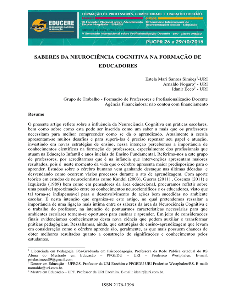 SABERES DA NEUROCIÊNCIA COGNITIVA NA FORMAÇÃO DE EDUCADORES Estela Mari Santos Simões1-URI Arnaldo Nogaro2 - URI Idanir Ecco3 - URI Grupo de Trabalho - Formação de Professores e Profissionalização Docente Agência Financiadora: não contou com financiamento Resumo O presente artigo reflete sobre a influência da Neurociência Cognitiva em práticas escolares, bem como sobre como esta pode ser inserida como um saber a mais que os professores necessitam para melhor compreender como se dá o aprendizado. Atualmente à escola apresentam-se muitos desafios e para superá-los é preciso repensar seu papel e atuação, investindo em novas estratégias de ensino, nessa intenção percebemos a importância de conhecimentos científicos na formação de professores, especialmente dos profissionais que atuam na Educação Infantil e anos iniciais do Ensino Fundamental. Referimo-nos a este grupo de professores, por acreditarmos que é na infância que intervenções apresentam maiores resultados, pois é neste momento da vida que o cérebro apresenta maior predisposição para o aprender. Estudos sobre o cérebro humano vem ganhando destaque nas últimas décadas e desvendando como ocorrem vários processos durante o ato de aprendizagem. Com aporte teórico em estudos de neurocientistas como Kandel (2003), Guerra (2011) , Cosenza (2011) e Izquierdo (1989) bem como em pensadores da área educacional, procuramos refletir sobre uma possível aproximação entre os conhecimentos neurocientíficos e os educadores, visto que tal torna-se indispensável para o desenvolvimento de ações bem sucedidas no ambiente escolar. É nesta intenção que organiza-se este artigo, no qual pretendemos ressaltar a importância de uma ligação mais intima entre os saberes da área da Neurociência Cognitiva e o trabalho do professor, na intenção de pontuarmos características necessárias para que ambientes escolares tornem-se oportunos para ensinar e aprender. Em jeito de considerações finais evidenciamos conhecimentos desta nova ciência que podem auxiliar e transformar práticas pedagógicas. Ressaltamos, ainda, que estratégias de ensino-aprendizagem que levam em consideração como o cérebro aprende são, geralmente, as que mais possuem chances de obter melhores resultados quanto a construção de significações e conhecimentos pelos estudantes. 1 Licenciada em Pedagogia. Pós-Graduada em Psicopedagogia. Professora da Rede Pública estadual do RS Aluna do Mestrado em Educação – PPGEDU – URI – Frederico Westphalen. E-mail: [email protected]. 2 Doutor em Educação – UFRGS. Professor da URI Erechim e PPGEDU URI Frederico Westphalen/RS. E-mail: [email protected]. 3 Mestre em Educação – UPF. Professor da URI Erechim. E-mail: [email protected]. ISSN 2176-1396 38786 Palavras-chave: Educação. Neurociência. Formação de educadores. Introdução Um ensino de qualidade que contribui para a formação de sujeitos capacitados para atuar em sociedade é indispensável para o desenvolvimento econômico e social de um país. A educação escolar eficiente proporciona a qualificação para a vida cidadã, fornecendo meios para o aperfeiçoamento e o desenvolvimento de conhecimento e saberes necessários para uma ativa atuação social. Dentre as funções da escola está aquela de provocar mudanças, seja na vida ou na mente dos estudantes. Contribui para a aquisição de competências que fortalecem as probabilidades de obter-se um emprego melhor através de um nível de ensino maior e proporciona vivências que facilitam a consciência crítica, a reflexão e a ação social. Mas também deve propiciar o desenvolvimento das potencialidades e capacidades pessoais no sentido de constituir-se e desenvolver-se como pessoa, como ser humano, o que envolve questões relacionadas às emoções, à criatividade, às habilidades de relacionamento com os outros, à expressão oral, dentre outras. Nesta direção Gómez (2015) preceitua que a finalidade da escola não pode se esgotar no ensino e na aprendizagem dos conteúdos disciplinares estabelecidos no currículo e organizados nos livros didáticos. A missão da escola é ajudar a desenvolver capacidades, competências ou qualidades humanas fundamentais que o cidadão contemporâneo precisa pra viver em complexos contextos da era da informação. Nosso país, embora muito tenha avançado e perseguido melhores condições para o fornecimento de formações de qualidade, ainda tem muito a percorrer para atingir o padrão que se almeja. Ao analisar indicadores do desempenho escolar da realidade brasileira percebese a enorme dificuldade de nosso país em alcançar os níveis mais alavancados em educação. O sistema educacional no Brasil tem-se mostrado deficitário, com bases frágeis e que frente a resultados apresentados por outros países encontra-se longe do ideal. Segundo a Organização para a Cooperação e Desenvolvimento Econômico (OCDE, 2003) o Brasil experiencia o desgosto de estar entre os últimos lugares, num ranking de 36 países, estando à frente somente do México, colocação obtida de acordo com o desempenho dos alunos no PISA, a quantia de tempo que em média os alunos passam na escola e a porcentagem de estudantes que frequentam o ensino superior. 38787 Outros indicadores Saeb e Prova Brasil apontam os altos níveis de fracasso escolar na realidade brasileira. Também mostram que a maioria dos alunos ao final do Ensino Fundamental não dominam competências básicas em leitura e matemática. O número de analfabetos e os elevados índices de evasão no Brasil também são agravantes que geram o insucesso do nosso nível de ensino nesta década. À escola é posto o desafio de repensar sua prática e papel, aos educadores é posta a provocação, extremamente necessária, de que reorganizem seu trabalho, para que de fato se ofereça um ensino melhor, com iguais oportunidades para que todos aprendam. “Hoje, todos os alunos estão na es