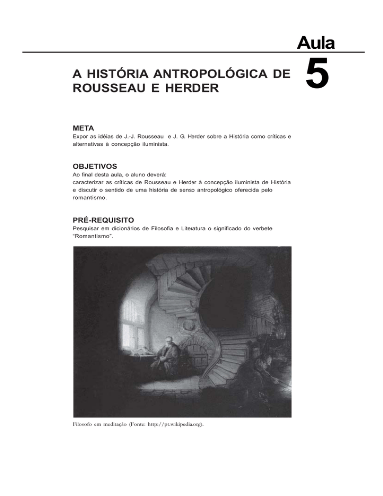A concepção iluminista de História A HISTÓRIA ANTROPOLÓGICA DE ROUSSEAU E HERDER META Expor as idéias de J.-J. Rousseau e J. G. Herder sobre a História como críticas e alternativas à concepção iluminista. OBJETIVOS Ao final desta aula, o aluno deverá: caracterizar as críticas de Rousseau e Herder à concepção iluminista de História e discutir o sentido de uma história de senso antropológico oferecida pelo romantismo. PRÉ-REQUISITO Pesquisar em dicionários de Filosofia e Literatura o significado do verbete “Romantismo”. Filosofo em meditação (Fonte: http://pt.wikipedia.org). Aula 5 Filosofia da História INTRODUÇÃO Esta lição pretende ser um breve apanhado da crítica à idéia iluminista de história feita por Jean-Jacques Rousseau, ainda no contexto do movimento iluminista, e de Johann Gottfried Herder, o qual ao lado de Goethe é figura de destaque do movimento romântico. O foco central destas críticas era 1. o protagonismo da classe política (despotismo esclarecido) ou de um grupo social específico (a burguesia), ainda que iluminado pela filosofia, como flecha do progresso histórico; 2. a idéia iluminista de que as eras passadas e a vida das nações não-européias eram marcadas pela barbárie e pelo obscurantismo; e 3. a concepção de natureza humana como uniforme e imutável.São estes os temas de que nos ocuparemos em seguida. Rousseau (Fonte: http://www.imagensgoogle.com.br). 52 A história antropológica de Rousseau e Herder Caro aluno, Rousseau foi um típico filho das luzes, contemporâneo de muitos iluministas pode lhes dirigir um olhar crítico bastante arguto e criativo. As críticas de Rousseau são oriundas de suas obras: Discurso sobre as artes e as ciências, Discurso sobre a origem da desigualdade entre os homens e O contrato social. Apesar do caráter epistemológico e políticos destas obras é daí que se extraem conceitos novos e sua pretensão de instaurar uma concepção de história alternativa à iluminista. Herder era teólogo, educador e estudioso da literatura alemã, seu vasto conhecimento e sensibilidade, permitiram-lhe construir textos de amplitude e profundidade, que forneceram bases para uma sólida crítica à visão iluminista. Suas obras sobre a filosofia da história são: Mais uma filosofia da história para a educação da humanidade (1774) e Ideias para uma filosofia da história da humanidade. Aula 5 Herder (Fonte: http://www.imagensgoogle.com). A crítica à ideia do progresso histórico protagonizado pela classe política (despotismo) é feita diretamente por Rousseau. Este opôs à idéia do progresso na história dirigido pela vontade do déspota, iluminada pela ciência e imposta ao povo passivo, a idéia da “vontade geral” do próprio 53 Filosofia da História povo esclarecido. A ideia rousseauniana é eivada ainda de utopismo e otimismo, tal qual a iluminista; porém alcança um âmbito bem maior da condição humana, já que para ele a vida política e o progresso (emancipação) não são prioritariamente obra da razão, mas da vontade humana, não dependendo diretamente da ciência em si, mas, antes, se colocando como impulso para esta. Os aparentes avanços da ciência e seus erros recomendam cautela na atribuição imediata do êxito na vida políticas ao uso da razão. Porém, esta ressalva não significa afastamento da razão, mas a garantia da primazia da vontade geral do povo. Esta vontade geral, por sua vez, para que se apresente no melhor de suas forças, não deve ignorar os melhores conhecimentos oferecidos pela ciência, formando-se assim como um povo esclarecido pela educação popular (democracia esclarecida). Aqui também está a crítica ao automatismo da vinculação entre esclarecimento e aperfeiçoamento moral e político, pois, somente a vontade livre do povo pode escolher aplicar o conhecimento para discernir o moral e politicamente melhor. Idade Media (Fonte: http://www.imagensgoogle.com). A crítica ao barbarismo e à irracionalidade das eras anteriores ao iluminismo. No caso de Rousseau, tal juízo é francamente recusado, primeiro por atuar com um princípio bem mais amplo do que a razão dos iluministas, que é a vontade geral. Se a razão era recente no tempo da 54 A história antropológica de Rousseau e Herder história humana, a vontade, por sua vez, era tão antiga quanto o homem; em segundo lugar, se tomarmos a concepção de infância de Rousseau veremos que não há da parte dele discriminação para com a criança que vive uma vida própria, com ideias e concepções próprias que cabem ao educador decifrar. Analogamente o historiador deve contemplar a diferença entre os povos atuais e antigos e interpretar seus costumes, bem como entre os diferentes povos contemporâneos. Com este verdadeiro senso antropológico, Rousseau amplia o campo do historiador iluminista que havia se voltado para o presente. Aula 5 G. Vico (Fonte: http://www.imagensgoogle.com). Tal como Giambattista Vico, Herder não via atuando na história somente a razão humana, mas concebia também fontes de impulso (desenvolvimento) da vida humana a imaginação, a criação artística e literária. Sendo assim, a questão da irracionalidade de outras eras e povos era menos importante ou inadequada para o juízo do historiador. Outro elemento importante a considerar no pensamento de Herder é que este acreditava que a providência havia criado os seres (também em comum com Vico), com uma integração entre as espécies, e sendo assim, o organismo humano estava diretamente ligado aos outros organismos. Segundo Herder, há 55 Filosofia da História uma teleologia [em grego quer dizer finalidade determinante] na natureza que a encarrega de preparar organismos destinados a desenvolver dentro de si organismos superiores, desse modo uma sociedade esteve e está sempre gestando outra mais aperfeiçoada, e isto desde um ponto de vista orgânico e social. Com este duplo olhar a história dos povos antepa