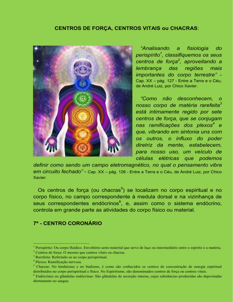 CENTROS DE FORÇA, CENTROS VITAIS ou CHACRAS: “Analisando a fisiologia do perispírito1, classifiquemos os seus centros de força2, aproveitando a lembrança das regiões mais importantes do corpo terrestre” Cap. XX – pág. 127 - Entre a Terra e o Céu, de André Luiz, por Chico Xavier. “Como não desconhecem, o nosso corpo de matéria rarefeita3 está intimamente regido por sete centros de força, que se conjugam nas ramificações dos plexos4 e que, vibrando em sintonia uns com os outros, o influxo do poder diretriz da mente, estabelecem, para nosso uso, um veículo de células elétricas que podemos definir como sendo um campo eletromagnético, no qual o pensamento vibra em circuito fechado” - Cap. XX – pág. 126 - Entre a Terra e o Céu, de André Luiz, por Chico Xavier. Os centros de força (ou chacras5) se localizam no corpo espiritual e no corpo físico, no campo correspondente à medula dorsal e na vizinhança de seus correspondentes endócrinos6, e, assim como o sistema endócrino, controla em grande parte as atividades do corpo físico ou material. 7º - CENTRO CORONÁRIO 1 Perispírito: Ou corpo fluídico. Envoltório semi-material que serve de laço ou intermediário entre o espírito e a matéria. Centros de força: O mesmo que centros vitais ou chacras. 3 Rarefeita: Referindo-se ao corpo perispiritual. 4 Plexos: Ramificação nervosa. 5 Chacras: No hinduísmo e no budismo, é como são conhecidos os centros de concentração de energia espiritual distribuídos no corpo perispiritual e físico. No Espiritismo, são denominados centros de força ou centros vitais. 6 Endócrinos ou glândulas endócrinas: São glândulas de secreção interna, cujas substâncias produzidas são depositadas diretamente no sangue. 2 Este é o centro de força mais importante dos centros vitais7 e situa-se no alto da cabeça, instalado na região central do cérebro, sede da mente, centro que assimila os estímulos do Plano Superior e orienta a forma, o movimento, a estabilidade, o metabolismo orgânico e a vida consciencial da alma encarnada ou desencarnada, nas faixas de aprendizado que lhe corresponde no campo planetário (Cap. II – pág. 28 – Evolução em dois mundos). Esse centro recebe em primeiro lugar os estímulos do espírito, comandando os demais, vibrando todavia com eles em justo regime de interdependência (Cap. XX – pág. 127 – Entre a Terra e o Céu). Dele emanam as energias de sustentação do sistema nervoso e suas subdivisões, sendo o responsável pela alimentação das células do pensamento e o provedor de todos os recursos eletromagnéticos indispensáveis à estabilidade orgânica. O centro coronário supervisiona, ainda, os outros centros vitais que lhe obedecem ao impulso, procedente do Espírito, assim como as peças secundárias de uma usina respondem ao comando da peça-motor de que se serve o tirocínio do homem para estabelecer relação entre elas e dirigi-las (Cap.II – pág. 28 – Evolução em dois mundos). Temos particularmente no centro coronário o ponto de interação entre as forças determinantes do espírito e as forças fisiopsicossomáticas organizadas. Dele parte, desse modo, a corrente de energia vitalizante formada de estímulos espirituais com ação difusível sobre a matéria mental que o envolve, transmitindo aos demais centros da alma, os reflexos vivos de nossos sentimentos, idéias e ações, tanto quanto esses mesmo centros, interdependentes entre si, imprimem semelhantes reflexos nos órgãos e demais implementos de nossa constituição particular, plasmando em nós próprios os efeitos agradáveis ou desagradáveis de nossa influência e conduta (Cap. II – pág. 29 – Evolução em dois mundos). O centro coronário, por fulcro luminoso, entrosa-se com o centro cerebral, a exprimir-se no córtex8 e em todos os mecanismos do mundo cerebral, onde o espírito encontra no cérebro, o gabinete de comando das energias que o servem (Cap. IX – pág. 72 - Evolução em dois mundos). 7 8 Centros vitais: Referência geral aos centros de força ou chacras. Córtex: Camada mais externa, própria dos vertebrados, com espessura variada de 2 a 6 mm, que protege todo o cérebro e muito rica em neurônios. Na condição de expressão máxima do veículo que nos serve, é considerado pela filosofia hindu como sendo o lótus de mil pétalas9, por ser a mais significativa base de recepção e seu alto potencial de radiação, de vez que nele se assenta a ligação com a mente, fulgurante sede da consciência. É o grande assimilador das energias solares e dos raios da Espiritualidade Superior capazes de favorecer a sublimação da alma (Cap. XX – pág. 126/127 Entre a Terra e o Céu). Este centro possui no tálamo10, vasto sistema de governança do espírito. Através dos centros nervosos, o encéfalo, conservando consigo o centro coronário e o centro cerebral, registra excitações inúmeras, para que as faculdades de percepção e seleção, percepção e escolha, se consolidem. (Cap. IX – pág. 69 - Evolução em dois mundos) O córtex cerebral, com as suas delicadas divisões e subdivisões, governando os núcleos reguladores dos sentidos, dos movimentos, dos reflexos e de todas as manifestações nervosas da individualidade encarnada, corresponde à sede do centro cerebral do corpo espiritual no corpo físico, unida à sede do centro coronário, localizado no diencéfalo11, entrosando ambos em perfeita sincronia de estímulos (Cap. XVI – pág. 123 - Evolução em dois mundos). O aborto criminoso e outros desvios do centro genésico afetam igualmente o cardíaco, o esplênico e o cerebral, que também são envolvidos (Cap. XIV – pág. 196 - Evolução em dois mundos). A apreciação dos centros cerebrais (Cerebral e Coronário) é de extrema importância, pois representam as bases de operação do pensamento e da vontade, que influem de modo compreensível em todos os fenômenos mediúnicos. 6º - CENTRO CEREBRAL ou FRONT