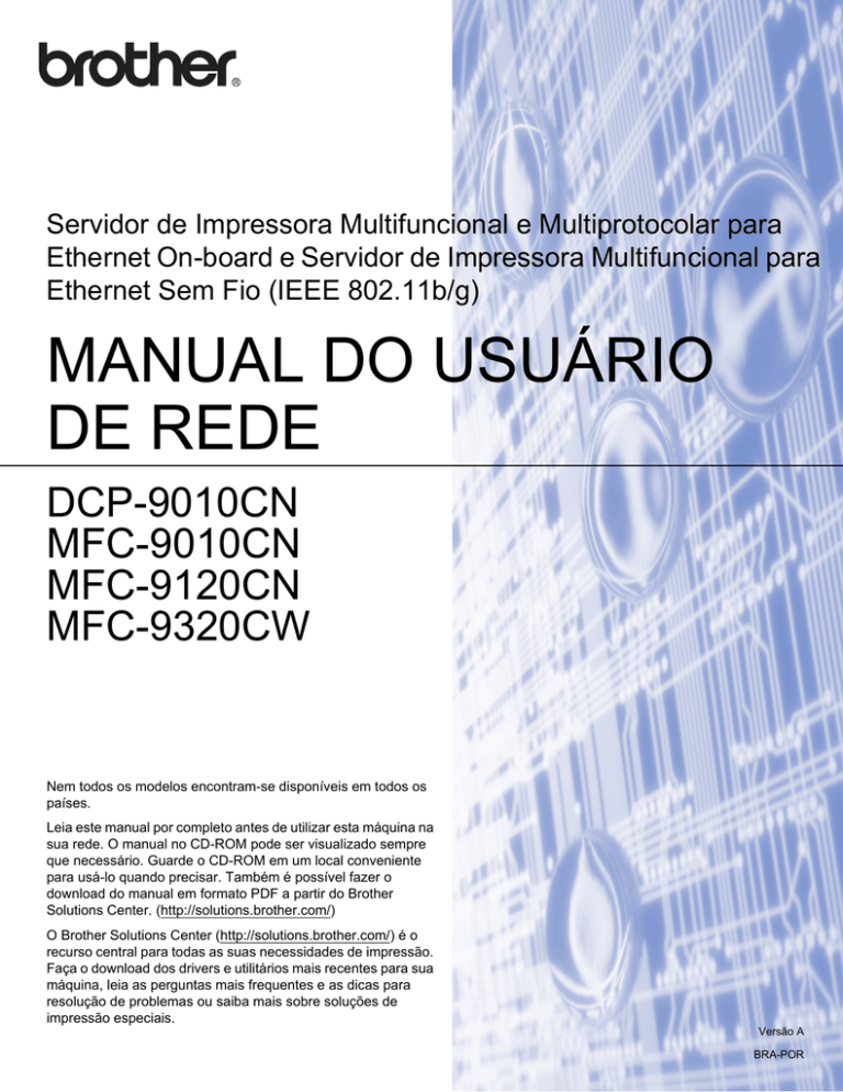 Servidor de Impressora Multifuncional e Multiprotocolar para Ethernet On-board e Servidor de Impressora Multifuncional para Ethernet Sem Fio (IEEE 802.11b/g) MANUAL DO USUÁRIO DE REDE DCP-9010CN MFC-9010CN MFC-9120CN MFC-9320CW Nem todos os modelos encontram-se disponíveis em todos os países. Leia este manual por completo antes de utilizar esta máquina na sua rede. O manual no CD-ROM pode ser visualizado sempre que necessário. Guarde o CD-ROM em um local conveniente para usá-lo quando precisar. Também é possível fazer o download do manual em formato PDF a partir do Brother Solutions Center. (http://solutions.brother.com/) O Brother Solutions Center (http://solutions.brother.com/) é o recurso central para todas as suas necessidades de impressão. Faça o download dos drivers e utilitários mais recentes para sua máquina, leia as perguntas mais frequentes e as dicas para resolução de problemas ou saiba mais sobre soluções de impressão especiais. Versão A BRA-POR Definições de observações Utilizamos o seguinte ícone neste Manual do Usuário: IMPORTANTE IMPORTANTE indica uma situação potencialmente perigosa que, se não evitada, pode resultar em danos à propriedade ou em perda da funcionalidade do produto. Observações indicam como você deve reagir a uma situação que possa surgir ou fornecem dicas sobre como a operação interage com outros recursos. Marcas comerciais O logotipo da Brother é uma marca registrada da Brother Industries, Ltd. Brother é uma marca registrada da Brother Industries, Ltd. Microsoft, Windows, Windows Server, Outlook e Internet Explorer são marcas registradas da Microsoft Corporation nos EUA e/ou em outros países. Windows Vista é uma marca registrada ou uma marca comercial da Microsoft Corporation nos EUA e em outros países. Apple, Macintosh, Safari e TrueType são marcas registradas da Apple Inc. nos EUA e/ou em outros países. Linux é a marca registrada da Linus Torvalds nos EUA e em outros países. UNIX é uma marca registrada do The Open Group nos Estados Unidos e em outros países. Adobe, Flash, Illustrator, Photoshop, PostScript e PostScript 3 são marcas registradas ou marcas comerciais da Adobe Systems Incorporated nos EUA e/ou em outros países. Corel e CorelDRAW são marcas comerciais ou marcas registradas da Corel Corporation e/ou de suas subsidiárias no Canadá, Estados Unidos e outros países. BROADCOM, SecureEasySetup e o logotipo SecureEasySetup são marcas comerciais ou registradas da Broadcom Corporation nos Estados Unidos da América e/ou em outros países. WPA, WPA2, Wi-Fi Protected Access e Wi-Fi Protected Setup são marcas comerciais ou marcas registradas da Wi-Fi Alliance nos Estados Unidos e/ou em outros países. Wi-Fi e Wi-Fi Alliance são marcas registradas da Wi-Fi Alliance. AOSS é uma marca comercial da Buffalo Inc. Todos os nomes comerciais e de produtos de empresas que apareçam nos produtos Brother, documentos relacionados e outros materiais são marcas comerciais ou marcas registradas dessas respectivas empresas. Aviso de publicação e compilação Este manual foi compilado e publicado sob a supervisão da Brother Industries, Ltd., abrangendo as últimas especificações e descrições do produto. O conteúdo deste manual e as especificações deste produto estão sujeitos a alterações sem aviso prévio. A Brother se reserva o direito de fazer alterações sem aviso prévio nas especificações e nos materiais aqui contidos e não se responsabilizará por quaisquer danos (inclusive indiretos) causados por confiança nos materiais apresentados, incluindo, dentre outros, erros tipográficos e de outros tipos relativos à publicação. ©2009 Brother Industries, Ltd. i NOTA IMPORTANTE Este produto é aprovado para uso somente no país de compra. Não use este produto fora do país de compra, pois ele pode violar os regulamentos de energia e telecomunicação sem fio do país. Neste documento, Windows® XP representa o Windows® XP Professional, Windows® XP Professional x64 Edition e Windows® XP Home Edition. Neste documento, Windows Server® 2003 representa o Windows Server® 2003 e Windows Server® 2003 x64 Edition. Neste documento, Windows Server® 2008 representa o Windows Server® 2008 e o Windows Server® 2008 R2. Neste documento, Windows Vista® representa todas as edições do Windows Vista®. Neste documento, Windows® 7 representa todas as edições do Windows® 7. As ilustrações da máquina se baseiam no MFC-9320CW. Nem todos os modelos encontram-se disponíveis em todos os países. Números da Brother IMPORTANTE Para assistência técnica e operacional, ligue para o número correspondente no país onde adquiriu a máquina. As chamadas deverão ser feitas de dentro desse país. Para atendimento ao cliente Nos EUA 1-877-BROTHER (1-877-276-8437) No Canadá 1-877-BROTHER No Brasil [email protected] Na Europa Visite http://www.brother.com/ para obter informações de contato com o seu escritório Brother local. Localizador de centros de serviços (EUA) Para localizar um centro de serviço Brother autorizado, telefone para 1-877-BROTHER (1-877-276-8437). Locais de centros de serviços (Canadá) Para localizar um centro de serviço Brother autorizado, telefone para 1-877-BROTHER. ii Caso tenha algum comentário ou sugestão, escreva para: Nos EUA Customer Support Brother International Corporation 100 Somerset Corporate Boulevard Bridgewater NJ 08807-0911 No Canadá Brother International Corporation (Canada), Ltd. Marketing Dept. 1 Hôtel de Ville Dollard des Ormeaux, QC H9B 3H6 Canadá No Brasil Brother International Corporation do Brasil Ltda. Av. Paulista, 854 - 15 and. - Ed. Top Center CEP: 01310-100 - São Paulo - SP - Brasil Na Europa European Product & Service Support 1 Tame Street Audenshaw Manchester, M34 5JE, Reino Unido Endereço na Internet Site global da Brother na Web: http://www.brother.com/ Para ler as perguntas mais frequentes, obter informações de suporte ao produto e conhe
