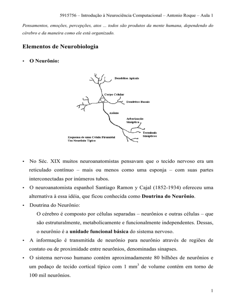 5915756 – Introdução à Neurociência Computacional – Antonio Roque – Aula 1 Pensamentos, emoções, percepções, atos ... todos são produtos da mente humana, dependendo do cérebro e da maneira como ele está organizado. Elementos de Neurobiologia • O Neurônio: • No Séc. XIX muitos neuroanatomistas pensavam que o tecido nervoso era um reticulado contínuo – mais ou menos como uma esponja – com suas partes interconectadas por inúmeros tubos. • O neuroanatomista espanhol Santiago Ramon y Cajal (1852-1934) ofereceu uma alternativa à essa idéia, que ficou conhecida como Doutrina do Neurônio. • Doutrina do Neurônio: O cérebro é composto por células separadas – neurônios e outras células – que são estruturalmente, metabolicamente e funcionalmente independentes. Dessas, o neurônio é a unidade funcional básica do sistema nervoso. • A informação é transmitida de neurônio para neurônio através de regiões de contato ou de proximidade entre neurônios, denominadas sinapses. • O sistema nervoso humano contém aproximadamente 80 bilhões de neurônios e um pedaço de tecido cortical típico com 1 mm3 de volume contém em torno de 100 mil neurônios. 1 5915756 – Introdução à Neurociência Computacional – Antonio Roque – Aula 1 • Os neurônios são células como qualquer outra, com membrana celular e corpo celular (soma) contendo núcleo, mitocôndrias, ribossomos, etc. • A principal característica que distingue os neurônios das demais células é que eles são especializados para comunicação intercelular. • Existem milhares de tipos diferentes de neurônios (veja a figura a seguir). • Alguns neurônios não possuem dendritos, mas outros possuem arborizações dendríticas extremamente complexas. Alguns neurônios não possuem axônios, mas outros possuem axônios que podem atingir até 1 m de extensão. • Do ponto de vista anatômico, os neurônios podem ser diferenciados por tamanho e forma. As diferenças em tamanho e forma têm implicações sobre as maneiras como os neurônios processam e transmitem informação. • Os neurônios não são apenas unidades retransmissoras, isto é, que transmitem a mesma informação que recebem. Pelo contrário, um neurônio típico coleta sinais de várias fontes, integra e transforma esses sinais gerando complexos sinais de saída que são enviados para muitos outros neurônios. 2 5915756 – Introdução à Neurociência Computacional – Antonio Roque – Aula 1 • Visão clássica de um neurônio: Os dendritos recebem sinais de entrada vindos de outras células. Ocorre uma somação espaço-temporal desses sinais ao longo da arborização dendrítica até que eles chegam ao soma (corpo celular). O soma processa e integra esses sinais, gerando pulsos elétricos que se iniciam na região de contato do axônio com o soma (cone axônico); os sinais elétricos (informação) são transmitidos ao longo do axônio, atingindo outros neurônios ou órgãos efetores através de sinapses (veja figura a seguir). • Do ponto de vista anatômico, pode-se classificar os neurônios em três tipos (veja a figura a seguir): - Neurônios multipolares: têm muitos dendritos e um único axônio. A maioria dos neurônios dos cérebros de vertebrados é multipolar; - Neurônios bipolares: têm um único dendrito em um lado da célula e um único axônio do outro lado. Esse tipo de neurônio é encontrado em sistemas sensoriais, e.g., na retina e no bulbo olfativo; - Neurônios monopolares: têm um único ramo (em geral, chamado de axônio) que, após deixar o corpo celular, se estende em duas direções: uma que recebe as entradas e outra que fornece as saídas. Esse tipo de neurônio transmite informações táteis da superfície do corpo para o cordão espinhal. 3 5915756 – Introdução à Neurociência Computacional – Antonio Roque – Aula 1 • Em todos esses três tipos de neurônios os dendritos são as estruturas por onde entra informação, mas nas células multipolares o corpo celular também recebe informação de entrada. • Do ponto de vista funcional, pode-se classificar os neurônios em três tipos: - Neurônios sensoriais: tipicamente, têm dendritos longos e um axônio curto. Carregam mensagens dos receptores sensoriais para o sistema nervoso central; - Neurônios motores: têm um axônio comprido e dendritos curtos. Transmitem mensagens do sistema nervoso central para os músculos (ou glândulas); - Interneurônios: ocorrem apenas no sistema nervoso central e conectam os neurônios entre si. 4 5915756 – Introdução à Neurociência Computacional – Antonio Roque – Aula 1 • Além dos neurônios, o cérebro possui outro tipo de células, chamadas de células gliais, ou glia. Existem três tipos de células gliais no cérebro: astrócitos, oligodendrócitos e microglia. • Estima-se que o número de células gliais no cérebro seja aproximadamente três vezes maior do que o número de neurônios. • Ainda se conhece pouco sobre o papel da glia no processamento de informação cerebral. Acredita-se que o principal papel da glia esteja relacionado à manutenção das concentrações iônicas no meio intercelular e à modulação da taxa de propagação de sinais nervosos e da ação sináptica. • Como ainda se sabe muito pouco sobre o papel das células gliais no funcionamento do cérebro, é conveniente manter-se informado sobre as pesquisas relacionadas a essas células, pois elas podem trazer novidades no futuro. • Circuitos cerebrais: • Sistemas que processam informação podem ter sua arquitetura organizada de duas maneiras básicas: com processamento feedforward ou com processamento recorrente. A visão clássica do neurônio exemplifica o tipo de processamento feedforward: a informação entra por uma via (os dendritos) e segue um caminho de processamento sem retroalimentação (feedback) até uma via de saída (o axônio). Qualquer sistema que tenha pelo menos um