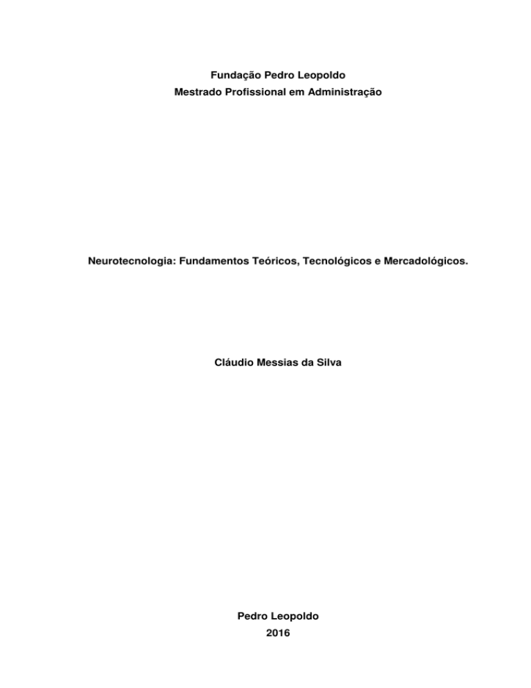 Fundação Pedro Leopoldo Mestrado Profissional em Administração Neurotecnologia: Fundamentos Teóricos, Tecnológicos e Mercadológicos. Cláudio Messias da Silva Pedro Leopoldo 2016 Cláudio Messias da Silva Neurotecnologia: Fundamentos Teóricos, Tecnológicos e Mercadológicos. Dissertação apresentada ao Curso de Mestrado Profissional em Administração, da Fundação Pedro Leopoldo, como requisito parcial para a obtenção do título de Mestre em Administração. Área de concentração: Organizações Gestão em Linha de pesquisa: Estratégias Corporativas Orientador: Prof. Dr. José Edson Lara Pedro Leopoldo Fundação Pedro Leopoldo 2016 611.8 S586n SILVA, Claudio Messias da Neurotecnologia: Fundamentos Teóricos, Tecnológicos e Mercadológicos / Claudio Messias da Silva. - Pedro Leopoldo: FPL, 2016. 158 p. Dissertação: Mestrado Profissional em Administração, Fundação Cultural Dr. Pedro Leopoldo, Pedro Leopoldo, 2016. Orientador : Prof. Dr. José Edson Lara 1. Neurociências. 2. Neuroimageamento. 3. Sistema Nervoso Central. I. Título. II. LARA, José Edson, orient. CDD: 611.8 Dados Internacionais de Catalogação na Publicação Ficha catalográfica elaborada por Maria Luiza Diniz Ferreira CRB 6 -1590 ÀDEUS, o que seria de mim sem a fé que tenho nele. AGRADECIMENTOS Quero agradecer, em primeiro lugar, a Deus, pela força e coragem durante toda esta longa caminhada. Ao professor José Edson Lara, pela paciência na orientação e incentivo que me ajudou bastante, tornando possível a conclusão deste trabalho. A todos os professores, professoras e colaboradores da Fundação Pedro Leopoldo, pela compreensão, pelo apoio e pela amizade que foram tão importantes no desenvolvimento do meu aprendizado. Aos meus pais, irmãos, minha esposa Iara Marina da Cruz e Silva e a toda minha família que, com muito carinho e apoio, não mediram esforços para que eu chegasse até esta etapa de minha vida. Aos médicos que participaram deste trabalho, podendo contribuir com o tempo que me foi dado para realização das entrevistas. Aos amigos principalmente a Mônica Viviane Rosa e colegas, pelo incentivo, pelo apoio constante, pelas alegrias, tristezas e dores compartilhadas. RESUMO A neurociência cada vez mais tem-se revelado uma área extensa de estudos, envolvendo muitos campos de análise, no contexto do sistema nervoso central e periférico, tão mais acessíveis quanto mais se evidencia o desenvolvimento tecnológico. A fim de conhecer sobre a neurociência e utilização dos seus equipamentos neurotecnológicos, esta dissertação tem por propósito, apresentar as tecnologias de neuroimageamento cerebral utilizadas no município de Montes Claros em termos da operacionalidade, empregabilidade e condições de mercado vigentes, segundo opinião dos médicos radiologistas e neurologistas. O arcabouço teórico do estudo foi constituído a partir artigos, dissertações, teses e sites nacionais e internacionais.Nesse sentido, são abordados vários conceitos relacionados à neurociência e suas tecnologias para a observação e a análise de eventos do sistema nervoso central através de diversas técnicas, como a eletromiografia, a eletroneuromiografia, a eletrooculografia, a resposta galvânica da pele e técnicas de Imageamento, a Ressonância Magnética funcional, o Eletroencefalograma, o Magneto-encefalograma e a Tomografia por Emissão de Pósitrons. A pesquisa tem sua natureza apoiada sob a abordagem qualitativa.O instrumento é a entrevista semiestruturada, constituída de 25 questões direcionadas aos profissionais clínicos radiologistas e neurologistas. O primeiro objetivo específico busca-se apresentar as tecnologias de neuroimageamento cerebral. O segundo objetivo específico descreve as tecnologias de neuroimageamento utilizadas no município de Montes Claros, em termos da diversidade, operacionalidade e empregabilidade, já o terceiro objetivo específico busca identificar as condições de mercado vigentes no ramo de neuroimageamento no município de Montes Claros segundo opinião de médicos radiologistas e neurologistas. O quarto objetivo específico descreve como esses profissionais interagem com novas neurotecnologias. O quinto objetivo específico busca a percepção dos profissionais sobre a convergência tecnológica e o sexto objetivo específico procura identificar como esses profissionais lidam com a manutenção dos equipamentos neurológicos em suas clínicas. Palavras-chave: Neurociências, Neuroimageamento, Sistema Nervoso Central. ABSTRACT Increasingly neuroscience has proved an area of studies involving many fields of analysis, in the context of the central and peripheral nervous system, so much the more accessible if it highlights the technological development.In order to know about neuroscience and use of its equipment, this dissertation neurotech has for purpose to present the brain neuroimageamento technologies used in the municipality of Montes Claros in terms of operational readiness, employability, current market conditions, according to the opinion of the radiologists and neurologists.The theoretical framework of the study was constituted from articles, dissertations, theses and national and international sites, in this sense, are discussed various concepts related to neuroscience and their technologies for the observation and analysis of central nervous system events through various techniques like electromyography, electroneuromyography, eletrooculografia, Galvanic Skin response and imaging techniques , functional magnetic resonance imaging, EEG, Magneto-encephalogram, Positron Emission Tomography.Research has supported nature under the qualitative approach, the instrument is the semi-structured interview, consisting of 25 questions directed to the clinical professional’s radiologists and neurologists.The first specific objective seeks to introduce neuroimageamento technologies. The second specific objective describes the neuroimage