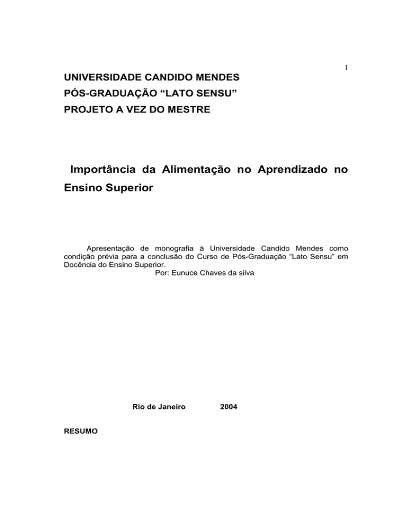 1 UNIVERSIDADE CANDIDO MENDES PÓS-GRADUAÇÃO “LATO SENSU” PROJETO A VEZ DO MESTRE Importância da Alimentação no Aprendizado no Ensino Superior Apresentação de monografia à Universidade Candido Mendes como condição prévia para a conclusão do Curso de Pós-Graduação “Lato Sensu” em Docência do Ensino Superior. Por: Eunuce Chaves da silva Rio de Janeiro RESUMO 2004 2 A alimentação está diretamente ligada à apropriação do conhecimento, à construção e reconstrução de nossa humanidade a nível social e intelectual. Ela, quando equilibrada, saudável e em quantidade suficiente ao organismo, é fator fundamental para o desenvolvimento harmonioso do indivíduo, principalmente no ensino superior. O tipo de alimento que o homem ingere em sua infância e adolescência irá determinar o desenvolvimento intelectual e a saúde do adulto. Os hábitos alimentares são formados principalmente nela e a tendência é que permaneçam durante toda a vida do indivíduo e sejam transmitidos por ele à sua descendência. O quadro de desnutrição, mesmo quando leve, provoca profunda alteração no organismo humano: diminui a produção de proteínas essenciais à formação de anticorpos, de células sangüíneas de defesa e de preservação e manutenção dos tecidos, dificultando a resistência a doenças corriqueiras. Por isso ficam mais vezes doentes, podendo mesmo morrer de enfermidades às quais as pessoas bem nutridas facilmente possuem defesas, e mais sensíveis a agressões psíquicas e afetivas. A tudo isso se acrescenta o fato de que, a cada quadro de enfermidade, a saúde do desnutrido mais se deprime. Desta maneira, se negar ao indivíduo uma alimentação saudável e necessária a seus gastos energéticos, está-se promovendo sua desnutrição. Por outro lado, ao se lhe prejudicar a capacidade de aprendizagem por falta de nutrientes, negação de seu direito de aprender e ter acesso à riqueza cultural desenvolvida pela humanidade ao longo de sua história. Está-se, assim, se lhe negando sua condição humana. Ele será sempre um indivíduo isolado culturalmente num mundo onde o conhecimento é tudo. Ele perde sua capacidade total de conhecer a maior parte do saber existente: torna-se órfão do saber ancestral. Estudos demonstraram que as deficiências nutricionais estão freqüentemente associadas às perturbações de aprendizagem e aos problemas cognitivos do 3 aluno. Um aluno bem alimentado chega à escola alegre, disposta, aprende com facilidade; um aluno com fome, ao contrário, não consegue se concentrar fica inquietas, nervosas, sonolentas, apáticas e tem dificuldades de aprendizagem, por falta de concentração. Isso determina alterações, por vezes graves, no rendimento escolar e no comportamento do estudante. No entanto, mesmo tendo diante dos olhos a realidade, ainda existe muita polêmica entre a fome e desnutrição e o processo de aprendizagem, altos níveis de repetência e abandono, e o fracasso escolar observado nas universidades brasileiras. Há teorias que afirmam que a causa do fracasso escolar se deve a seqüelas produzidas no sistema nervoso central de crianças submetidas à desnutrição nos dois primeiros anos de vida; ou ainda desde o útero da mãe desnutrida, que se alimentam inadequadamente. O cérebro é o centro de controle do movimento, do sono, da fome, da sede e de quase todas as atividades vitais necessárias à sobrevivência. Todas as emoções, como o amor, o ódio, o medo, a ira, a alegria e a tristeza, também são controladas pelo cérebro. Ele está encarregado ainda de receber e interpretar os inúmeros sinais enviados pelo organismo e pelo exterior. Os cientistas já conseguiram elaborar um mapa do cérebro, localizando diversas regiões responsáveis pelo controle da visão, da audição, do olfato, do paladar, dos movimentos automáticos e das emoções, entre outras. No entanto, pouco ainda se sabe sobre os mecanismos que reagem o pensamento e a memória. Mais sabe que a falta de alimentação, diminui a atividade cerebral. É comum que se encontre professores do ensino de graduação queixando-se de seus alunos: são desatentos, agressivos, inquietos, desanimados e, às vezes sonolentos. É quando o aluno sente enjôo, têm dor de cabeça, transpiração excessiva, tonturas e visão turva, sintomas característicos da má nutrição. Palavras-chaves.1.Aprendizagem. 2.Alimentação. 3.Cérebro. UNIVERSIDADE CANDIDO MENDES PÓS-GRADUAÇÃO “LATO SENSU” 4 PROJETO A VEZ DO MESTRE Importância da Alimentação no Aprendizado no Ensino Superior Por: Eunuce Chaves da silva Orientador Prof. Ms. Fabiane Muniz Rio de Janeiro 2002 5 AGRADECIMENTOS Eu, Eunice, agradeço a Deus por ter me permitido chegar até aqui. A todos os professores e colegas de sala que de uma forma direta ou indireta contribuíram para elaboração desta monografia. A minha orientadora Fabiane Muniz. 6 DEDICATÓRIA Ao meu marido Jaime, minha filha Jéssica, Pai, mãe e irmãos. 7 METODOLOGIA A metodologia aplicada por pesquisa bibliográfica. Os livros utilizados foram principalmente livros de leitura corrente que objetivam proporcionar conhecimento cientifico como Estes livros foram consultados por estar relacionado diretamente com o tema proposto e por auxiliarem na elaboração da monografia e da resolução dos principais problemas encontrados, são livros que contem assuntos pertinentes ao tema. INTRODUÇÃO A avaliação dos transtornos da aprendizagem constitui um dos desafios mais freqüentemente enfrentado na universidade. A falta de êxito acadêmico ou as dificuldades no rendimento escolar acarretam preocupações para os pais, para os professores e também do próprio aluno, necessitando, portanto de uma avaliação médica a fim de determinar se existem fatores neurológicos, psiquiátricos, psicológicos e nutricional que possam ser remediados. Além de problemas com a memória, inclui condições tais como uma falha de percepção,