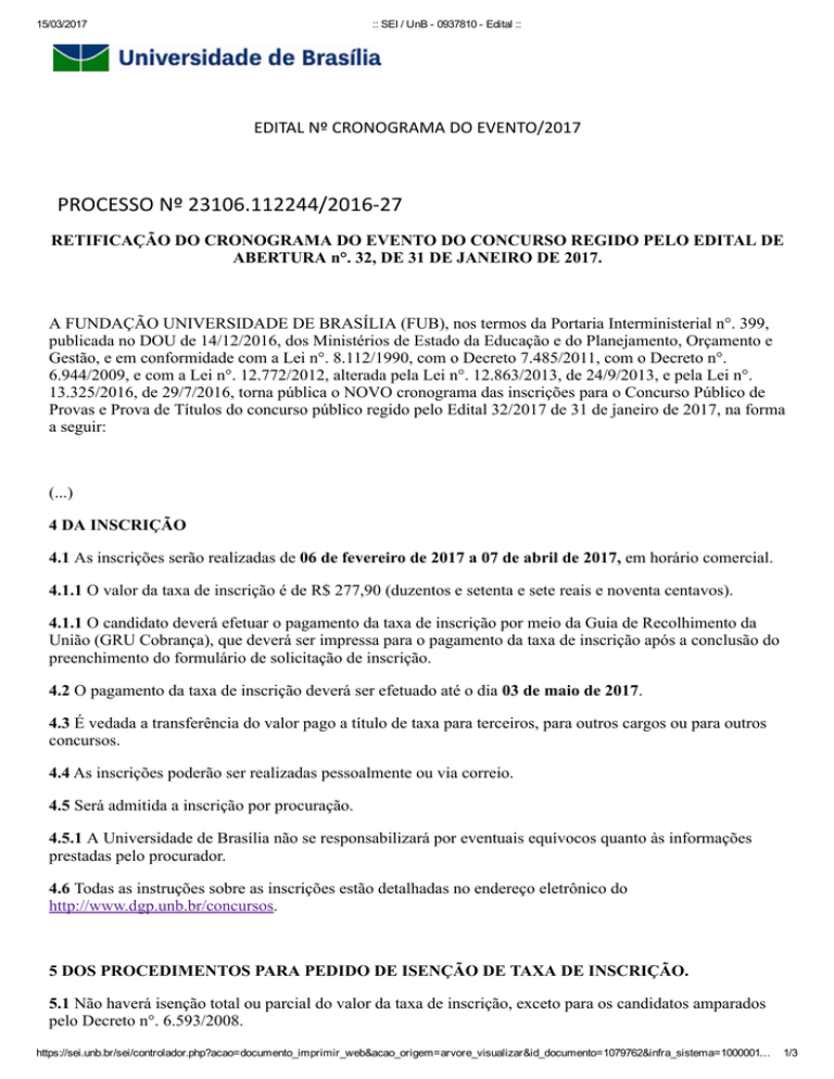 15/03/2017 :: SEI / UnB ­ 0937810 ­ Edital :: EDITAL Nº CRONOGRAMA DO EVENTO/2017 PROCESSO Nº 23106.112244/2016‐27 RETIFICAÇÃO DO CRONOGRAMA DO EVENTO DO CONCURSO REGIDO PELO EDITAL DE ABERTURA n°. 32, DE 31 DE JANEIRO DE 2017. A FUNDAÇÃO UNIVERSIDADE DE BRASÍLIA (FUB), nos termos da Portaria Interministerial n°. 399, publicada no DOU de 14/12/2016, dos Ministérios de Estado da Educação e do Planejamento, Orçamento e Gestão, e em conformidade com a Lei n°. 8.112/1990, com o Decreto 7.485/2011, com o Decreto n°. 6.944/2009, e com a Lei n°. 12.772/2012, alterada pela Lei n°. 12.863/2013, de 24/9/2013, e pela Lei n°. 13.325/2016, de 29/7/2016, torna pública o NOVO cronograma das inscrições para o Concurso Público de Provas e Prova de Títulos do concurso público regido pelo Edital 32/2017 de 31 de janeiro de 2017, na forma a seguir: (...) 4 DA INSCRIÇÃO 4.1 As inscrições serão realizadas de 06 de fevereiro de 2017 a 07 de abril de 2017, em horário comercial. 4.1.1 O valor da taxa de inscrição é de R$ 277,90 (duzentos e setenta e sete reais e noventa centavos). 4.1.1 O candidato deverá efetuar o pagamento da taxa de inscrição por meio da Guia de Recolhimento da União (GRU Cobrança), que deverá ser impressa para o pagamento da taxa de inscrição após a conclusão do preenchimento do formulário de solicitação de inscrição. 4.2 O pagamento da taxa de inscrição deverá ser efetuado até o dia 03 de maio de 2017. 4.3 É vedada a transferência do valor pago a título de taxa para terceiros, para outros cargos ou para outros concursos. 4.4 As inscrições poderão ser realizadas pessoalmente ou via correio. 4.5 Será admitida a inscrição por procuração. 4.5.1 A Universidade de Brasília não se responsabilizará por eventuais equívocos quanto às informações prestadas pelo procurador. 4.6 Todas as instruções sobre as inscrições estão detalhadas no endereço eletrônico do http://www.dgp.unb.br/concursos. 5 DOS PROCEDIMENTOS PARA PEDIDO DE ISENÇÃO DE TAXA DE INSCRIÇÃO. 5.1 Não haverá isenção total ou parcial do valor da taxa de inscrição, exceto para os candidatos amparados pelo Decreto n°. 6.593/2008. https://sei.unb.br/sei/controlador.php?acao=documento_imprimir_web&acao_origem=arvore_visualizar&id_documento=1079762&infra_sistema=1000001… 1/3 15/03/2017 :: SEI / UnB ­ 0937810 ­ Edital :: 5.2 Estará isento do pagamento da taxa de inscrição o candidato que: a) estiver inscrito no Cadastro Único para Programas Sociais do Governo Federal (CadÚnico), de que trata o Decreto n°. 6.135/2007; e b) for membro de família de baixa renda, nos termos do Decreto n°. 6.135/2007. 5.3 A isenção deverá ser solicitada mediante requerimento do candidato, disponível na página do concurso, no período compreendido 06 de fevereiro de 2017 a 07 de abril de 2017contendo: a) indicação do Número de Identificação Social (NIS), atribuído pelo CadÚnico; e b) declaração de que atende à condição estabelecida na letra “b” do subitem 5.2 deste edital. 5.4 A Universidade de Brasília consultará o órgão gestor do CadÚnico para verificar a veracidade das informações prestadas pelo candidato. 5.5 As informações prestadas no requerimento de isenção serão de inteira responsabilidade do candidato, podendo responder este, a qualquer momento, por crime contra a fé pública, o que acarreta sua eliminação do concurso, aplicando­se, ainda, o disposto no parágrafo único do artigo 10, do Decreto n°. 83.936/1979. 5.6 Não será concedida isenção de pagamento de taxa de inscrição ao candidato que: a) omitir informações e(ou) torná­las inverídicas; b) fraudar e(ou) falsificar documentação; c) não observar a forma, o prazo e os horários estabelecidos no subitem 5.3 deste edital. 5.7 Não será aceita solicitação de isenção de pagamento de valor de inscrição via postal. 5.8 Cada pedido de isenção será analisado e julgado pelo órgão gestor do CadÚnico. 5.9 A relação dos candidatos que tiveram o seu pedido de isenção deferido será divulgada na data provável de 20 de abril de 2017, no endereço eletrônico http://www.dgp.unb.br/concursos. 5.10 Após a divulgação da relação dos candidatos que tiveram o seu pedido de isenção deferido será concedido o prazo de 2 (dois) dias úteis aos candidatos que não constarem desta relação, para contestar o indeferimento, no endereço eletrônico http://www.dgp.unb.br/concursos. Após esse período não serão aceitos pedidos de revisão. 5.11 A resposta da contestação será disponibilizada, em 5 (cinco) dias úteis, após o término do prazo previsto no subitem 5.10, no endereço eletrônico http://www.dgp.unb.br/concursos. 5.12 Os candidatos que tiverem o seu pedido de isenção indeferido, deverão entrar em contato com a UnB e imprimir a GRU Cobrança para pagamento até o dia 03 de maio de 2017, conforme procedimentos descritos neste Edital. 5.13 O interessado que não tiver o seu pedido de isenção deferido e que não efetuar o pagamento da taxa de inscrição na forma e no prazo estabelecido no subitem anterior, estará automaticamente excluído do concurso público. Cronograma do Evento Evento Data https://sei.unb.br/sei/controlador.php?acao=documento_imprimir_web&acao_origem=arvore_visualizar&id_documento=1079762&infra_sistema=1000001… 2/3 15/03/2017 :: SEI / UnB ­ 0937810 ­ Edital :: Período de Inscrição e Período de Solicitação de Isenção de 06/02/2017 a 07/04/2017 Inscrição Divulgação da relação dos candidatos que tiveram o pedido de isenção deferido 20/04/2013 Período para contestar o indeferimento do pedido de isenção 24/04/2017 e 25/04/2016 Divulgação do resultado da contestação 28/04/2017 Data limite para o pagamento da taxa de inscrição 03/05/2017 (...) Permanecem inalteradas as demais condições estabelecidas no Edital de Abertura do concurso em questão. Cláudia Rosana de Araújo Costa Decana de Gestã