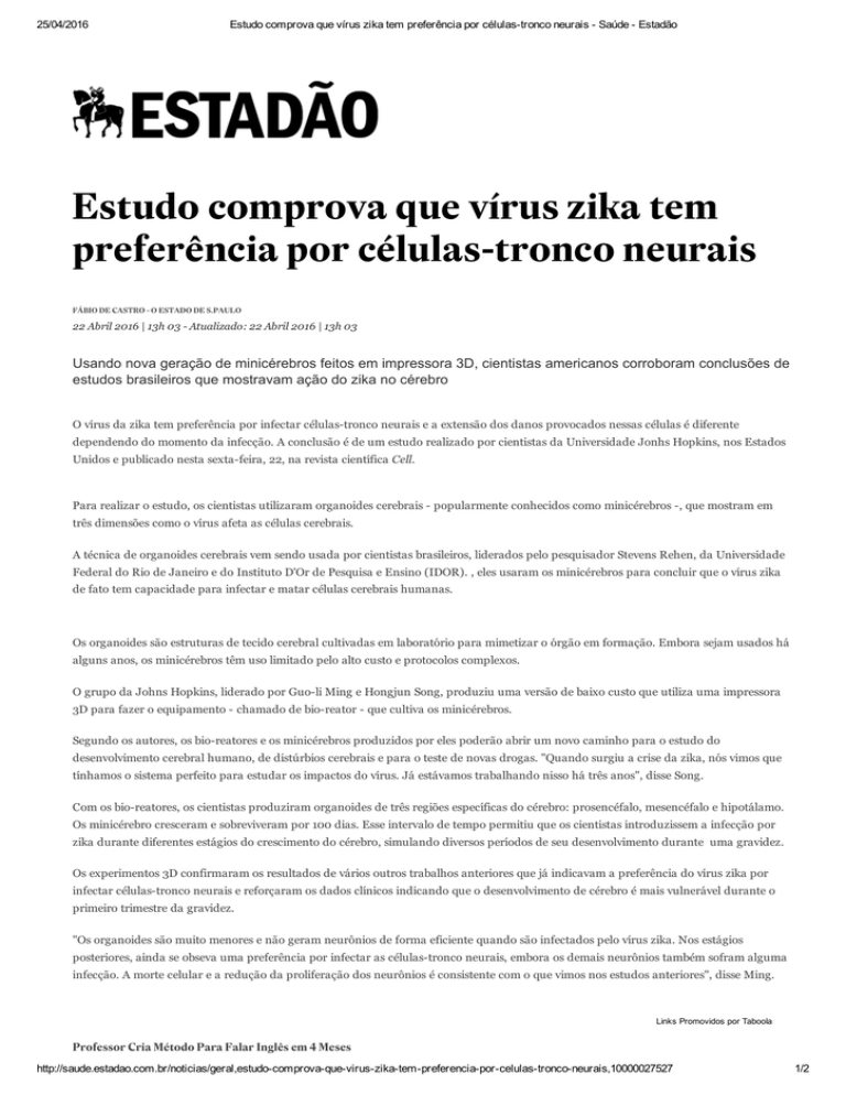 25/04/2016 Estudo comprova que vírus zika tem preferência por células­tronco neurais ­ Saúde ­ Estadão Estudo comprova que vírus zika tem preferência por células-tronco neurais FÁBIO DE CASTRO - O ESTADO DE S.PAULO 22 Abril 2016 | 13h 03 ­ Atualizado: 22 Abril 2016 | 13h 03 Usando nova geração de minicérebros feitos em impressora 3D, cientistas americanos corroboram conclusões de estudos brasileiros que mostravam ação do zika no cérebro O vírus da zika tem preferência por infectar células­tronco neurais e a extensão dos danos provocados nessas células é diferente dependendo do momento da infecção. A conclusão é de um estudo realizado por cientistas da Universidade Jonhs Hopkins, nos Estados Unidos e publicado nesta sexta­feira, 22, na revista científica Cell. Para realizar o estudo, os cientistas utilizaram organoides cerebrais ­ popularmente conhecidos como minicérebros ­, que mostram em três dimensões como o vírus afeta as células cerebrais. A técnica de organoides cerebrais vem sendo usada por cientistas brasileiros, liderados pelo pesquisador Stevens Rehen, da Universidade Federal do Rio de Janeiro e do Instituto D'Or de Pesquisa e Ensino (IDOR). , eles usaram os minicérebros para concluir que o vírus zika de fato tem capacidade para infectar e matar células cerebrais humanas. Os organoides são estruturas de tecido cerebral cultivadas em laboratório para mimetizar o órgão em formação. Embora sejam usados há alguns anos, os minicérebros têm uso limitado pelo alto custo e protocolos complexos. O grupo da Johns Hopkins, liderado por Guo­li Ming e Hongjun Song, produziu uma versão de baixo custo que utiliza uma impressora 3D para fazer o equipamento ­ chamado de bio­reator ­ que cultiva os minicérebros. Segundo os autores, os bio­reatores e os minicérebros produzidos por eles poderão abrir um novo caminho para o estudo do desenvolvimento cerebral humano, de distúrbios cerebrais e para o teste de novas drogas. "Quando surgiu a crise da zika, nós vimos que tínhamos o sistema perfeito para estudar os impactos do vírus. Já estávamos trabalhando nisso há três anos", disse Song. Com os bio­reatores, os cientistas produziram organoides de três regiões específicas do cérebro: prosencéfalo, mesencéfalo e hipotálamo. Os minicérebro cresceram e sobreviveram por 100 dias. Esse intervalo de tempo permitiu que os cientistas introduzissem a infecção por zika durante diferentes estágios do crescimento do cérebro, simulando diversos períodos de seu desenvolvimento durante uma gravidez. Os experimentos 3D confirmaram os resultados de vários outros trabalhos anteriores que já indicavam a preferência do vírus zika por infectar células­tronco neurais e reforçaram os dados clínicos indicando que o desenvolvimento de cérebro é mais vulnerável durante o primeiro trimestre da gravidez. "Os organoides são muito menores e não geram neurônios de forma eficiente quando são infectados pelo vírus zika. Nos estágios posteriores, ainda se obseva uma preferência por infectar as células­tronco neurais, embora os demais neurônios também sofram alguma infecção. A morte celular e a redução da proliferação dos neurônios é consistente com o que vimos nos estudos anteriores", disse Ming. Links Promovidos por Taboola Professor Cria Método Para Falar Inglês em 4 Meses http://saude.estadao.com.br/noticias/geral,estudo­comprova­que­virus­zika­tem­preferencia­por­celulas­tronco­neurais,10000027527 1/2 25/04/2016 Estudo comprova que vírus zika tem preferência por células­tronco neurais ­ Saúde ­ Estadão Inglês do Jerry 8 truques para aprender um idioma sem perceber Babbel Onde investir agora? Veja aqui Empiricus Luciano Huck e Angélica fazem acordo financeiro com pilotos e babás após acidente ­ Emais ­ Estadão Coragem de Giba acaba com a farsa de Bernardinho Tô gata! http://saude.estadao.com.br/noticias/geral,estudo­comprova­que­virus­zika­tem­preferencia­por­celulas­tronco­neurais,10000027527 2/2