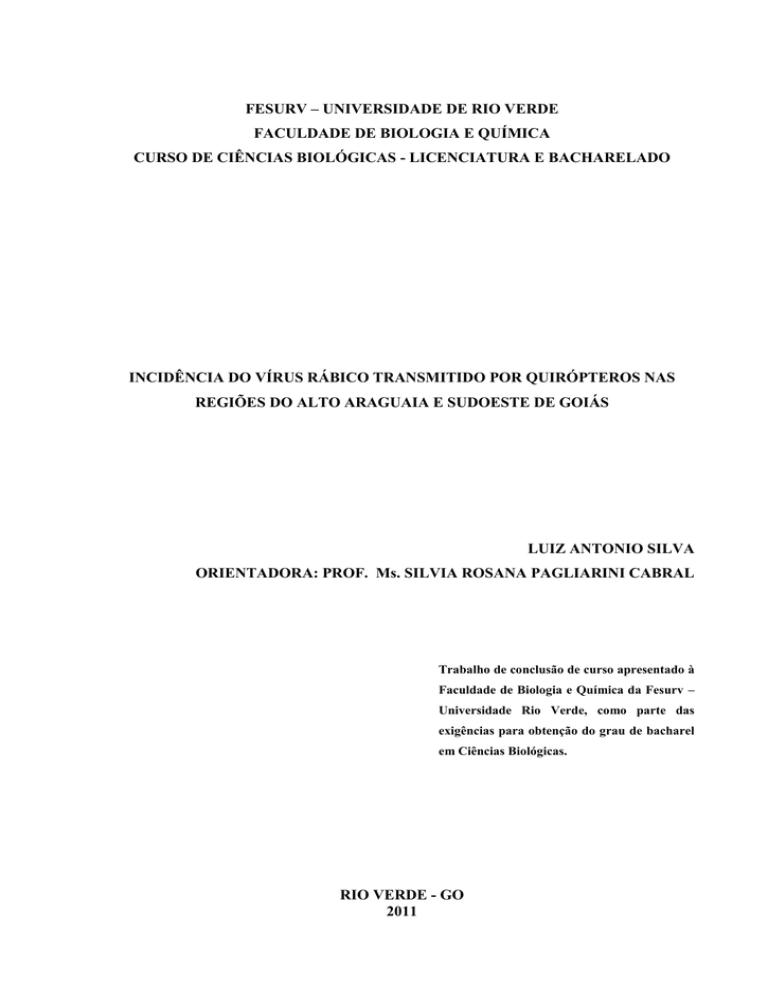 FESURV – UNIVERSIDADE DE RIO VERDE FACULDADE DE BIOLOGIA E QUÍMICA CURSO DE CIÊNCIAS BIOLÓGICAS - LICENCIATURA E BACHARELADO INCIDÊNCIA DO VÍRUS RÁBICO TRANSMITIDO POR QUIRÓPTEROS NAS REGIÕES DO ALTO ARAGUAIA E SUDOESTE DE GOIÁS LUIZ ANTONIO SILVA ORIENTADORA: PROF. Ms. SILVIA ROSANA PAGLIARINI CABRAL Trabalho de conclusão de curso apresentado à Faculdade de Biologia e Química da Fesurv – Universidade Rio Verde, como parte das exigências para obtenção do grau de bacharel em Ciências Biológicas. RIO VERDE - GO 2011 2 INCIDÊNCIA DO VÍRUS RÁBICO TRANSMITIDO POR QUIRÓPTEROS NAS REGIÕES DO ALTO ARAGUAIA E SUDOESTE DE GOIÁS Luiz Antonio Silva¹ Silvia Rosana Pagliarini Cabral² RESUMO O presente estudo reporta a incidência do vírus rábico em bovinos, equinos e quirópteros nas regiões do Alto Araguaia e Sudoeste de Goiás, no período de 2000 a 2010. Os dados foram obtidos do arquivo da Agencia Goiana de Defesa Agropecuária (AGRODEFESA) de Laboratório de Análises e Diagnóstico Veterinário (LABVET) totalizando em 502 amostras. As amostras do sistema nervoso central destes animais foram submetidas à técnica de imunofluorescência direta (IFD) e inoculação em camundongos (IC). Constatou-se positividade ao vírus em 111 amostras de bovinos, 8 em equinos e nenhum relato para quirópteros. A região do Sudoeste apresentou o maior número de casos positivos ao vírus. A maioria dos morcegos analisados foi da espécie Desmodus rotundus. Sugere-se, um estudo completo sobre os aspectos biológicos dos quirópteros encaminhados para análise e também uma maior intensificação no número de amostras enviadas, o que contribuirá para o conhecimento destes animais na epidemiologia da raiva. Palavras-chave: Morcegos hematófagos, morcegos não hematófagos, vírus da raiva, zoonose, epidemiologia. ______________________________________ ¹Acadêmico do curso de Ciências Biológicas Licenciatura e Bacharelado. Universidade de Rio Verde FESURV. ²Professora Mestre adjunta da Universidade de Rio Verde – FESURV do Curso Ciências Biológicas Licenciatura e Bacharelado. 3 INTRODUÇÃO O grupo dos quirópteros é um dos mais diversificados dentre os mamíferos, com 18 famílias, 202 gêneros, e 1120 espécies (SIMMONS, 2005), representando aproximadamente 22% das espécies de mamíferos catalogados (WILSON & REEDER, 2005), onde 167 espécies são encontradas no Brasil (REIS et al., 2006). Estes animais têm grande importância médica sanitária, por serem hoje um dos principais portadores do vírus rábico (CUNHA et al., 2006), tendo em vista que no ano de 2010 duas pessoas morreram pelo vírus da raiva, sendo uma transmitida por morcego e outra por cão (BRASIL, 2010). A raiva é considerada uma doença endêmica, com distribuição epidemiológica bastante heterogênica, e está diretamente relacionada com as condições socioeconômicas e culturais dos estados, sendo a região Centro-Oeste um local de incidência relevante (LAZARINI, 2003), além disso, esta doença tem afetado grande parte do mundo (SOUZA et al., 2005). A doença é uma enfermidade infecciosa aguda que atinge o sistema nervoso central (SNC) e pode ser transmitida pela inoculação do vírus por mordedura, lambedura e arranhadura; onde o infectado pode apresentar diversos sintomas como: fobias, paralisia, síndromes entre outros (KOTAIT at al., 2009), sendo as fezes, urina e saliva destes animais o fator principal pela disseminação do vírus (CARNEIRO et al., 2009). Portanto a doença possui grande importância epidemiológica, tendo esta zoonose provocado um impacto expressivo para a saúde pública e animal, devido sua alta letalidade (WARRELL & WARRELL, 2004), resultando na morte tanto de animais como de seres humanos (OMS, 2005). O Vírus da raiva pertence à família Rhabdoviridae, gênero Lyssavirus (SILVA & LANGONI, 2011), sendo classificado em onze espécies e sete genótipos (I, II, III, IV, V, VI e VII), sendo as espécies: Rabies virus (RABV), Duvenhage virus (DUVV), European bat Lyssavirus type 1 (EBLV1), European bat Lyssavirus type 2 (EBLV2), Australian bat Lyssavirus (ABLV), Lagos bat Lyssavirus (LBV), Mokola virus (MOKV), Aravan virus (ARAV), Khujand virus (KHUV), Irkut virus (IRKV), West Caucasian bat virus (WEBV). As onze espécies descritas do vírus, 10 são encontradas em morcegos, não se encontrando em morcegos a espécie Mokola virus (KOTAIT et al., 2009). Na América Latina, o principal hospedeiro do vírus rábico dentre os quirópteros são os da espécie Desmodus rotundos classificados como hematófagos, sendo considerados o 4 principal transmissor da raiva em bovinos, herbívoros e inclusive em humanos (SCHNEIDER et al., 2009). O contato direto com esses morcegos pode oferecer grandes riscos em populações animais e humanos (SILVA et al., 2007). Outras duas espécies de morcegos hematófagos Diphylla ecaudata e Diaemus youngi possuem como principal dieta alimentar o sangue de aves, entretanto, pode haver casos de se alimentarem de humanos, podendo, desta forma transmitirem o vírus rábico, porém sua participação nos ciclos de infecção é irrelevante(BATISTA et al., 2007). Os morcegos não hematófagos tem se tornado portadores do vírus da raiva com mais frequência nos últimos anos, o qual inclui espécies de insetívoros, frugívoros, omnívoros, polinívoros e piscívoros (SCHEFFER et al., 2007). São contaminados pelos morcegos hematófagos devido às diferentes interações, como disputas por território. Esses animais tem se refugiado para as áreas urbanas, por intervenção desordena e inadequada do homem em seu ecossistema natural, o que fortalece a disseminação da doença entre as diferentes espécies (CARNEIRO et al., 2009). Na América Latina os hematófagos são responsáveis por grandes perdas na pecuária (ACHA & SYFRES, 2003), onde se estima que a prevalência de bovinos sob risco da doença seja aproximadamente de 70 Milhões de cabeças, com 
