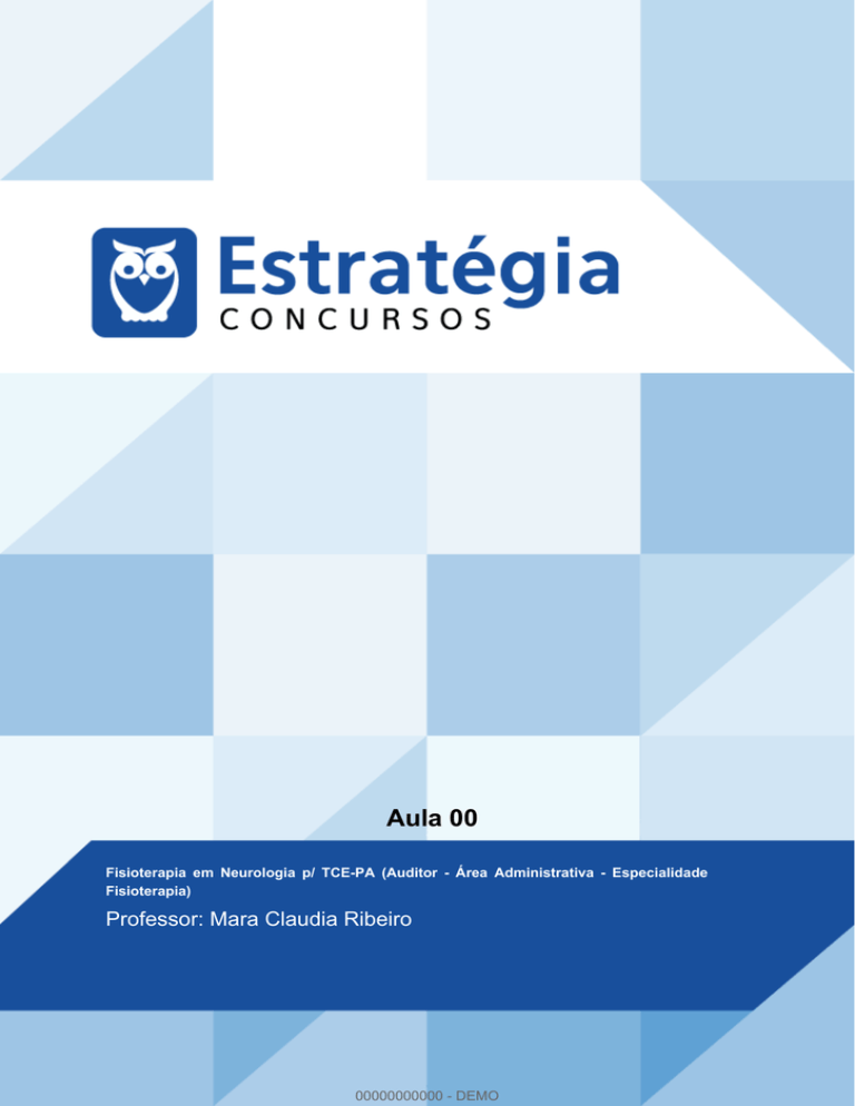 Aula 00 Fisioterapia em Neurologia p/ TCE-PA (Auditor - Área Administrativa - Especialidade Fisioterapia) Professor: Mara Claudia Ribeiro 00000000000 - DEMO !∀#∀∃%&∋()∀(∗+∗,−.∗/(∋0∗ !∀#∀∃%&∋()∀(∗&1∗2&3∋∃4∃5∀(∗+∗634(∗77∗ /∋∃8(9∗:(∋(∗−4(3;∀(∗<∀=&∀∋∃∗∗ AULA 00: Anatomia e Fisiologia do Sistema Nervoso SUMÁRIO PÁGINA 1. Apresentação 01 2. Planejamento dos Assunto Abordados 04 3. Neuroanatomia e Neurofisiologia Básica 06 4. Sistema Motor 16 5. Sistema Somato-Sensorial 37 6. Lista das questões apresentadas 45 7. Gabarito 52 1. APRESENTAÇÃO Prezado concursando, parabéns pela iniciativa de adquirir o curso, trata-se de um passo importante para a sua aprovação !!! É com imensa satisfação que iniciaremos os estudos do Curso Preparatório para o Concurso do TRIBUNAL DE CONTAS DO ESTADO DO PARÁ, neste módulo veremos a FISIOTERAPIA NEUROLÓGICA. 00000000000 Neste curso serão abordados temas de Anatomia e Fisiologia do Sistema Nervoso, Propedêutica Neurológica, Lesão Medular, Principais doenças e síndromes em neurologia. Este material será desenvolvido com muita dedicação e responsabilidade. Esforçandome ao máximo para oferecer o melhor e mais completo conteúdo possível para concursos que pode ser encontrado no mercado. Em todas as aulas serão apresentadas diversas questões de diferentes bancas que desenvolvem provas para concurso em todo o Brasil. A fim de discutirmos e ampliar os nossos conhecimentos as /∋∃89∗:(∋(∗−4(3;∀(∗<∀=&∀∋∃∗∗∗∗∗∗∗∗∗∗∗∗∗∗∗∗!!!∀#∃%&∋%#()∋∗+,∗−&∃+∃∀∗+.∀/&01!∀#!23! 00000000000 - DEMO !∀#∀∃%&∋()∀(∗+∗,−.∗/(∋0∗ !∀#∀∃%&∋()∀(∗&1∗2&3∋∃4∃5∀(∗+∗634(∗77∗ /∋∃8(9∗:(∋(∗−4(3;∀(∗<∀=&∀∋∃∗∗ questões serão TODAS COMENTADAS. E para que você possa praticar bastante, teremos, no final do material questões com gabarito. Mas antes de iniciarmos, tomo a liberdade de me apresentar sou a professora Mara Claudia Ribeiro, formada em fisioterapia e pós graduada em Fisioterapia Neurofuncional pela Universidade Estadual de Londrina, Mestre em Gerontologia pela Universidade Católica de Brasília e Doutoranda em Ciências Médicas pela Universidade de Brasília. Leciono no ensino superior há 12 anos, em cursos de graduação e pós-graduação, em diversas disciplinas ligadas ao Sistema Locomotor. E sou Fisioterapeuta do Hospital das Forças Armadas - Brasília. Utilizarei uma linguagem informal, com ênfase naquilo que realmente é cobrado, ou seja, para resolução de questões que envolvam o tema em qualquer concurso público para área de fisioterapia, objetivando sua aprovação. Para isso, os alunos matriculados no curso terão acesso ao seguinte conteúdo: a) Material em pdf com a teoria completa de todos os recursos 00000000000 utilizados na fisioterapia, contendo as principais discussões. b) Questões comentadas de várias bancas. c) Figuras para facilitar a memorização dos principais tópicos da disciplina. d) Videoaulas com a teoria. e) Fórum de dúvidas. Outras duas professoras também produzirão material para este concurso, serão as professoras Michelline Ribeiro e Gislaine /∋∃89∗:(∋(∗−4(3;∀(∗<∀=&∀∋∃∗∗∗∗∗∗∗∗∗∗∗∗∗∗∗∗!!!∀#∃%&∋%#()∋∗+,∗−&∃+∃∀∗+.∀/&03!∀#!23! 00000000000 - DEMO !∀#∀∃%&∋()∀(∗+∗,−.∗/(∋0∗ !∀#∀∃%&∋()∀(∗&1∗2&3∋∃4∃5∀(∗+∗634(∗77∗ /∋∃8(9∗:(∋(∗−4(3;∀(∗<∀=&∀∋∃∗∗ Holler, elas também farão a apresentação de si próprias e de seus conteúdos no momento oportuno. Este material é de extrema importância para que você obtenha êxito em ser aprovado em um concurso na área de Fisioterapia. 00000000000 2. PLANEJAMENTO DOS ASSUNTOS ABORDADOS /∋∃89∗:(∋(∗−4(3;∀(∗<∀=&∀∋∃∗∗∗∗∗∗∗∗∗∗∗∗∗∗∗∗!!!∀#∃%&∋%#()∋∗+,∗−&∃+∃∀∗+.∀/&04!∀#!23! 00000000000 - DEMO !∀#∀∃%&∋()∀(∗+∗,−.∗/(∋0∗ !∀#∀∃%&∋()∀(∗&1∗2&3∋∃4∃5∀(∗+∗634(∗77∗ /∋∃8(9∗:(∋(∗−4(3;∀(∗<∀=&∀∋∃∗∗ Abordarei, em vários módulos, os seguintes itens do edital par a o concurso do TCE-Pará: CINESIOTERAPIA Fisioterapia em neurologia Aula 00 – Movimento Humano Aula 01 – Introdução à cinesioterapia Aula 02 – Cinesioterapia 1 Aula 03 – Cinesioterapia 2 Aula 04 - Marcha Mara Ribeiro 14/03 18/03 21/03 28/03 04/04 Aula 00: Anatomia e 08/04 Fisiologia do Sistema Nervoso Mara Ribeiro Aula 01: Propedêutica Neurológica 11/04 Aula 02: Lesão Medular 18/04 Aula 03: Principais doenças 25/04 e lesões encefálicas Aula 04: Síndromes neurológicas 02/05 Aula 05: Principais doenças 09/05 do sistema nervoso periférico Órteses fisioterapia reabilitação em e Aula 00: Introdução à órtese 16/05 e prótese Mara Claudia Ribeiro Aula 01: Órteses 18/05 Aula 02: Próteses 20/05 00000000000 Aula 03: Amputação reabilitação amputados e 23/05 de /∋∃89∗:(∋(∗−4(3;∀(∗<∀=&∀∋∃∗∗∗∗∗∗∗∗∗∗∗∗∗∗∗∗!!!∀#∃%&∋%#()∋∗+,∗−&∃+∃∀∗+.∀/&05!∀#!23! 00000000000 - DEMO !∀#∀∃%&∋()∀(∗+∗,−.∗/(∋0∗ !∀#∀∃%&∋()∀(∗&1∗2&3∋∃4∃5∀(∗+∗634(∗77∗ /∋∃8(9∗:(∋(∗−4(3;∀(∗<∀=&∀∋∃∗∗ ! Fisioterapia em ginecologia e obstetrícia Mara Claudia Ribeiro Aula 00: Anatomia do sistema uroginecológico Aula 01: Mama / mastectomia Aula 02: Incontinecia urinária feminina e masculina Aula 03: Gestação e puerpério 30/05 01/06 08/06 13/06 Encontro-me sempre a disposição para tirar dúvidas e fazer esclarecimentos, via chat ou e-mail ... Feito todos os esclarecimentos iniciais, podemos começar nossa aula 00 !!!! Preparados? Que tenhamos um excelente curso !!!! Profa. M