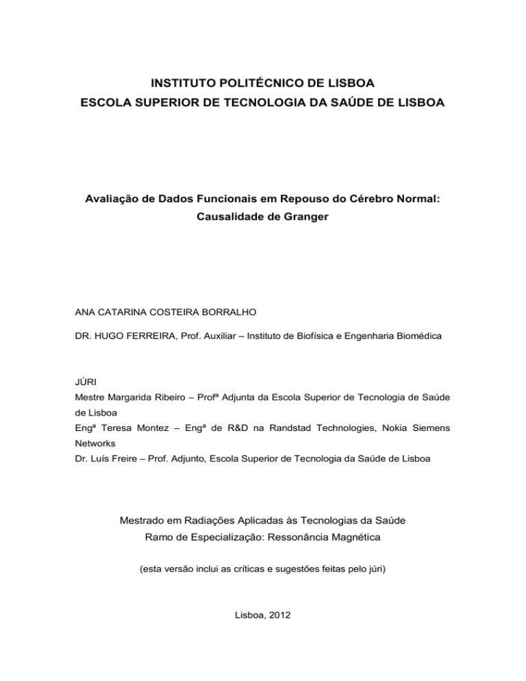 INSTITUTO POLITÉCNICO DE LISBOA ESCOLA SUPERIOR DE TECNOLOGIA DA SAÚDE DE LISBOA Avaliação de Dados Funcionais em Repouso do Cérebro Normal: Causalidade de Granger ANA CATARINA COSTEIRA BORRALHO DR. HUGO FERREIRA, Prof. Auxiliar – Instituto de Biofísica e Engenharia Biomédica JÚRI Mestre Margarida Ribeiro – Profª Adjunta da Escola Superior de Tecnologia de Saúde de Lisboa Engª Teresa Montez – Engª de R&D na Randstad Technologies, Nokia Siemens Networks Dr. Luís Freire – Prof. Adjunto, Escola Superior de Tecnologia da Saúde de Lisboa Mestrado em Radiações Aplicadas às Tecnologias da Saúde Ramo de Especialização: Ressonância Magnética (esta versão inclui as críticas e sugestões feitas pelo júri) Lisboa, 2012 Avaliação de Dados Funcionais em Repouso do Cérebro Normal: Causalidade de Granger Avaliação de Dados Funcionais em Repouso do Cérebro Normal: Causalidade de Granger A Escola Superior de Tecnologia da Saúde de Lisboa tem o direito, perpétuo e sem limites geográficos, de arquivar e publicar esta dissertação através de exemplares impressos reproduzidos em papel ou de forma digital, ou por qualquer outro meio conhecido ou que venha a ser inventado, e de a divulgar através de repositórios científicos e de admitir a sua cópia e distribuição com objectivos educacionais ou de investigação, não comerciais, desde que seja dado crédito ao autor e editor e que tal não viole nenhuma restrição imposta por artigos publicados que estejam incluídos neste trabalho. -I- Avaliação de Dados Funcionais em Repouso do Cérebro Normal: Causalidade de Granger PRODUÇÃO CIENTÍFICA ADICIONAL No âmbito da realização deste Projecto, foi aprovada a apresentação de Poster no: “10º Congresso Europeu de Epilepsia em Londres”, de 30 de Setembro a 4 de Outubro 2012. - II - Avaliação de Dados Funcionais em Repouso do Cérebro Normal: Causalidade de Granger AGRADECIMENTOS Ao meu orientador de Projecto, Professor Hugo Ferreira, por todo o apoio, orientação, e disponibilidade que teve durante toda a realização do mesmo. Agradeço à Drª. Graça Correia, Directora do Serviço de Radiologia do Hospital dos Lusíadas, pela disponibilização de recursos técnicos e humanos que permitiram a realização deste trabalho. Agradeço ainda ao Dr. Pedro Gonçalves-Pereira e ao Dr. Rui Manaças pela avaliação clínica das imagens de ressonância magnética. Agradeço igualmente aos Drs. Vítor Gonçalves, Anabela Nabais e Miguel Laia do Serviço de Neurocirurgia do Hospital dos Lusíadas, ao Dr. John Peters do Serviço de Neurologia do Instituto Português de Oncologia Francisco Gentil e ao Dr. Ribeiro da Costa do Serviço de Neurocirurgia do Hospital de São José pela referenciação de doentes. E um especial agradecimento aos meus pais pelo apoio dado ao longo de todo este tempo, e por serem uma fonte contínua de cultura e partilha. Por fim, e não menos importante, ao Rui por toda a paciência, compreensão e ajuda. Este trabalho foi realizado no âmbito do projecto "Avaliação multi-paramétrica da conectividade do sistema límbico em doentes com epilepsia pós-traumática" (PTDC/SAU-ENB/120718/2010) financiado pela Fundação para a Ciência e Tecnologia. “…Que a ciência seja fundamentalmente um caminho para redescobrir e implementar a conectividade à escala Humana e global.” Adriana Silva, 2008 - III - Avaliação de Dados Funcionais em Repouso do Cérebro Normal: Causalidade de Granger RESUMO O objectivo deste projecto prende-se com a intenção de determinar os coeficientes de conectividade efectiva num grupo de indivíduos saudáveis, através da análise da Causalidade de Granger. Em particular, pretende-se identificar o fluxo de informação entre duas redes neuronais específicas, a DMN e a TEN. Para além destas duas estruturas também se propôs a avaliação de outras redes que nos permitem avaliar aspectos motores (rede Sensório-Motora), processamento de dados visuais (rede Visual), funções executivas (rede da atenção), emoções (cingulado anterior) e bem como a tomada de decisões (rede da Ínsula). Foi realizada uma aquisição de RMf em repouso usando a técnica BOLD. Foram estudados 27 indivíduos, 24 saudáveis e 3 doentes com epilepsia pós-traumática. Este grupo de doentes foi estudado de forma preliminar para identificação de alterações a nível da conectividade efectiva das redes mencionadas. Foram realizadas análises ROI-Wise, entre cada par de redes distintas e Voxel-Wise, onde se avaliou a causalidade de um sinal funcional médio numa determinada rede em relação a todo o encéfalo usando uma estratégia de análise voxel a voxel. Estas análises permitiram determinar relações causais entre as redes e diferenciar indivíduos saudáveis e doentes. Observou-se que o Cingulado Anterior dirige os processos cognitivos da atenção, e que a BA 23_31 dirige a DMN. A rede TEN provoca alterações em todas as outras redes com excepção da Visual. Verificou-se que os doentes apresentavam todos, lesões ao nível córtex motor. E dois dos doentes ao nível da rede das emoções (ínsula) e rede da atenção. Palavras-Chave: Ressonância Magnética Funcional; Conectividade Efectiva; Causalidade de Granger; Redes em Repouso (RSN); e Epilepsia - IV - Avaliação de Dados Funcionais em Repouso do Cérebro Normal: Causalidade de Granger ABSTRACT The purpose of this project was to determine the coefficients of effective connectivity in a group of healthy individuals, through Granger Connectivity analysis. In particularly we want to identify the flow of information between two specific networks, the DMN and TEN. In addition to these two structures, we also proposed to evaluate other networks that enable us to assess motor aspects (sensory-motor network), visual data processing (visual network), executive functions (attention network), emotions (BA 23_31 network) and as well as the decision-making (insula network). Re