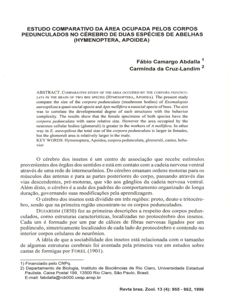 ESTUDO COMPARATIVO DA ÁREA OCUPADA PELOS CORPOS PEDUNCULADOS NO CÉREBRO DE DUAS ESPÉCIES DE ABELHAS (HYMENOPTERA, APOIDEA) Fábio Camargo Abdalla 1 Carminda da Cruz-Landim 2 ABSTRACT. COMPARA TIVE Sl1JDY OF THE AREA OCCUPIED BY THECORPORA PEDUNCUtATA lN THE BRAIN OF TWO BEE SPECIES (HYMENOPTERA, ApOIDEA). The present study compare lhe size of lhe corpora pedunculata (mushroom bodies) of K-comalopsis aureopilosa a quasi-social specie and Apis mellifera a eusocial specie ofbees. The aim was to correlate lhe developmental degree of such structures with the behavior complexity. The results show lhat lhe female specimens of bolh species have lhe corpora pedunculata with sarne relative size. However the area occupied by lhe neurones cellular bodies (glomeruli) is greater in lhe workers of A.mellifera. ln other way in E. aureopilosa lhe total size of lhe corpora pedunculata is larger in females, but lhe glomeruli area is relatively larger in the male. KEY WORDS. Hymenoptera, Apoidea, corpora pedunculata, glomeruli, castes, behavior o cérebro dos insetos é um centro de associação que recebe estímulos provenientes dos órgãos dos sentidos e está em contato com a cadeia nervosa ventral através de uma rede de interneurônios. Do cérebro emanam ordens motoras para os músculos das antenas e para as partes posteriores do corpo, passando através das vias descendentes, pré-motoras, que vão aos gânglios da cadeia nervosa ventral. Além disto, o cérebro é a sede dos padrões do comportamento organizado de longa duração, governando suas modificações pela aprendizagem. O cérebro dos insetos está dividido em três regiões: proto, deuto e tritocérebro, sendo que na primeira região encontram-se os corpos pedunculados. DUJARDIM (1850) fez as primeiras descrições a respeito dos corpos pedunculados, como estruturas características, localizadas no protocérebro dos insetos. Cada um é formado por um par de cálices de fibras nervosas ligados por um pedúnculo, simetricamente localizados de cada lado do protocérebro e contendo no interior corpos celulares de neurônios. A idéia de que a sociabilidade dos insetos está relacionada com o tamanho de algumas estruturas cerebrais foi aventada pela primeira vez em estudos sobre castas de formigas por FOREL (1901). 1) Financiado pelo CNPq . 2) Departamento de Biologia, Instituto de Biociências de Rio Claro, Universidade Estadual Paulista. Caixa Postal 199, 13500 Rio Claro, São Paulo, Brasil. E-mail: [email protected] Revta bras. ZooI. 13 (4): 955 - 962, 1996 956 ABDALLA & CRUZ-LANDlM HUBER (1965) verificou que cauterizando partes ou a totalidade dos corpos pedunculados, o comportamento de estridulação dos ortópteros era alterado tanto na capacidade de emissão do estrídulo como na sua percepção. Numa visão global dos insetos nota-se que os Protura e os Thysanura., que não possuem os corpos pedunculados e os Ephemeroptera., Megaloptera e Lepidoptera., que os possuem pouco desenvolvidos, apresentam um padrão comportamental limitado em relação as ordens filogeneticamente mais avançadas como os Coleoptera e os Hymenoptera, sendo que esta última ordem apresenta o mais complexo padrão comportamental social e possue tanto o cérebro como os corpos pedunculados mais desenvolvidos. De modo geral, segundo RA rZERDORFER (1952) e RENSCH (1959) os insetos considerados mais evoluídos e vivendo em sociedade têm o cérebro e os corpos pedunculados relativamente maiores. Porém VOWLESS (1955), afirma que a comparação do tamanho destas estruturas não deve ser correlacionada entre espécies filogeneticamente muito separadas, pois, exemplifica, tanto as abelhas (Apis me/lifera) como as formigas (Formica sp) apresentam capacidade mental equiparável, porém nota-se uma diferença marcante, no tamanho do cérebro, sendo o de Apis muito maior. ALrEN (1910) e RArZERDORFER (1952) realizaram alguns estudos em vertebrados e também nos insetos, com a finalidade de correlacionar o desenvolvimento de algumas partes do cérebro com o grau de cerebralização do animal, ou complexidade de seu comportamento ou de sua organização social. Admitindo que as partes do cérebro que não estão envolvidas nas atividades associativas mantêm-se mais ou menos constantes nos grupos de animais relacionados (RATZERDORFER 1952), um estudo comparativo das estruturas cerebrais entre espécies relacionadas, juntamente com o conhecimento de sua posição filogenética ou seu grau de sociabilidade poderiam esclarecer qual ou quais estruturas estariam relacionadas com a complexidade do comportamento ou sociabilidade do inseto. JAWLOWSKI (1960) argumenta que a condição de maior desenvolvimento cerebral e dos corpos pedunculados nos insetos sociais só aparece quando se estudam insetos de grupos diferentes. No caso de insetos filogeneticamente próximos, segundo este autor, parece ocorrer o contrário. Esta opinião parece estar de acordo com os achados de CRuz-LANDIM & ZANIBONI (1986) que estudando algumas estruturas cerebrais em várias espécies de abelhas, verificaram certa tendência para maior tamanho relativo dos lobos ópticos e lobos antenais e tendência para menor tamanho dos corpos pedunculados entre as espécies sociais. Em A. mellifera e formigas (Acromyrmex multicinodis) PANDAZIS (1930) e JA WLOWSKI (J 957), verificaram uma diferença no tamanho do cérebro entre as castas, tendo as operárias cérebros maiores. JAWLOWSKI (1957) atribui este fato às diferenças comportamentais entre as castas, já que as operárias desenvolvem atividades mais complexas que a rainha. No caso de A. mellifera, os zangões possuem um aumento evidente dos lobos ópticos, sendo a região central do protocérebro mais reduzida,já que nas sociedades matrifiliais os machos têm participação quase nula na organização social da espécie e necessitam de visão acurada para o acasalamento e sua própria sobrevivência. Revta bras. Zool. 13 (4): 955 - 962, 1996 Estudo comparat