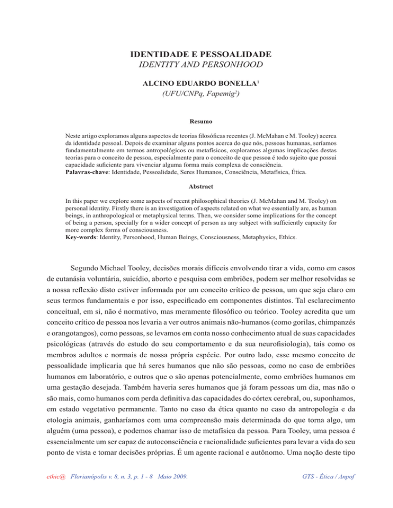 IDENTIDADE E PESSOALIDADE IDENTITY AND PERSONHOOD ALCINO EDUARDO BONELLA1 (UFU/CNPq, Fapemig2) Resumo Neste artigo exploramos alguns aspectos de teorias filosóficas recentes (J. McMahan e M. Tooley) acerca da identidade pessoal. Depois de examinar alguns pontos acerca do que nós, pessoas humanas, seríamos fundamentalmente em termos antropológicos ou metafísicos, exploramos algumas implicações destas teorias para o conceito de pessoa, especialmente para o conceito de que pessoa é todo sujeito que possui capacidade suficiente para vivenciar alguma forma mais complexa de consciência. Palavras-chave: Identidade, Pessoalidade, Seres Humanos, Consciência, Metafísica, Ética. Abstract In this paper we explore some aspects of recent philosophical theories (J. McMahan and M. Tooley) on personal identity. Firstly there is an investigation of aspects related on what we essentially are, as human beings, in anthropological or metaphysical terms. Then, we consider some implications for the concept of being a person, specially for a wider concept of person as any subject with sufficiently capacity for more complex forms of consciousness. Key-words: Identity, Personhood, Human Beings, Consciousness, Metaphysics, Ethics. Segundo Michael Tooley, decisões morais difíceis envolvendo tirar a vida, como em casos de eutanásia voluntária, suicídio, aborto e pesquisa com embriões, podem ser melhor resolvidas se a nossa reflexão disto estiver informada por um conceito crítico de pessoa, um que seja claro em seus termos fundamentais e por isso, especificado em componentes distintos. Tal esclarecimento conceitual, em si, não é normativo, mas meramente filosófico ou teórico. Tooley acredita que um conceito crítico de pessoa nos levaria a ver outros animais não-humanos (como gorilas, chimpanzés e orangotangos), como pessoas, se levamos em conta nosso conhecimento atual de suas capacidades psicológicas (através do estudo do seu comportamento e da sua neurofisiologia), tais como os membros adultos e normais de nossa própria espécie. Por outro lado, esse mesmo conceito de pessoalidade implicaria que há seres humanos que não são pessoas, como no caso de embriões humanos em laboratório, e outros que o são apenas potencialmente, como embriões humanos em uma gestação desejada. Também haveria seres humanos que já foram pessoas um dia, mas não o são mais, como humanos com perda definitiva das capacidades do córtex cerebral, ou, suponhamos, em estado vegetativo permanente. Tanto no caso da ética quanto no caso da antropologia e da etologia animais, ganharíamos com uma compreensão mais determinada do que torna algo, um alguém (uma pessoa), e podemos chamar isso de metafísica da pessoa. Para Tooley, uma pessoa é essencialmente um ser capaz de autoconsciência e racionalidade suficientes para levar a vida do seu ponto de vista e tomar decisões próprias. É um agente racional e autônomo. Uma noção deste tipo ethic@ Florianópolis v. 8, n. 3, p. 1 - 8 Maio 2009. GTS - Ética / Anpof BONELLA, A. E. Identidade e Pessoalidade. 2 poderia contribuir, também, para a compreensão de quem somos nós, do que nos torna especiais, e de qual estatuto moral é apropriado a seres assim, ou seja, quais direitos e deveres morais nós temos mutuamente enquanto agentes racionais e autônomos. Jeff MacMaham sustenta que temos duas estratégias para identificar e esclarecer quem somos e o que nos torna especiais: identificar propriedades intrínsecas (que ele designa como não-relacionais) que nos distingam de outros entes; ou, identificar propriedades extrínsecas ou relacionais que nos tornariam especiais. A primeira pode ser de dois tipos: tais propriedades seriam metafísicas (não-naturais); ou seriam empíricas (naturais). A estratégia mais conhecida do primeiro tipo é a que entende que somos seres especiais dada a presença de uma alma imortal, alma que seria o que somos essencialmente, ou que nos pertenceria como atributo juntamente com o corpo próprio. Todos os seres humanos seriam ou teriam uma alma imortal, mas não os outros animais e mesmo, outros seres vivos. MacMaham considera tal concepção insustentável racionalmente: primeiro [1] tal reivindicação não seria observável diretamente ou sequer embasada empiricamente, e teria pouca ou nenhuma base para ser sustentada racionalmente; em segundo lugar [2], qualquer versão robusta da existência deste tipo de entidade (a alma – cuja versão comum ou não-robusta é simplesmente uma forma de descrição, em linguagem antiga, do fenômeno biológico da vida vegetal, animal e pessoal, em geral), não seria compatível com o que nós sabemos hoje do cérebro e da consciência (dos nossos estados mentais). Por exemplo, segundo MacMaham, sabemos hoje que os estados mentais dependem do funcionamento físico natural do nosso cérebro, e que não há nenhum vestígio da consciência após a morte do córtex cerebral. Poderíamos, talvez, adotar uma noção da alma humana como algo totalmente separada da consciência ou dos estados mentais, porém, esse seria um terceiro problema. [3] Se nos recusamos a ver em tais estados os meios que expressam ou revelam nossa alma, então nossa noção se tornou totalmente arbitrária e sem controle lógico e factual mínimo, seja para nos distinguir dos outros animais, seja de quaisquer seres de quem afirmássemos não ter ou ser almas imortais. Ou seja, como poderíamos afirmar que eles também não possuiriam uma alma se não podemos ancorar nossa a nossa própria em nada de observável ou ao menos empiricamente plausível, e que pudesse ser evidenciado em nós, mas não nos outros animais ou nestes outros seres? MacMaham pensa também que, se ainda assim aceitamos que a noção de uma alma imortal em nós seja realmente verdadeira, então tal idéia não embasaria apenas a visão tradicional e antropocêntrica da importância exclusiva dos seres humanos, e esse seria um quarto aspecto crítico d