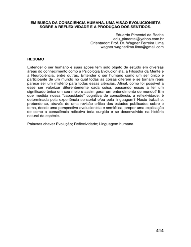 EM BUSCA DA CONSCIÊNCIA HUMANA. UMA VISÃO EVOLUCIONISTA SOBRE A REFLEXIVIDADE E A PRODUÇÃO DOS SENTIDOS. Eduardo Pimentel da Rocha [email protected] Orientador: Prof. Dr. Wagner Ferreira Lima [email protected] RESUMO Entender o ser humano e suas ações tem sido objeto de estudo em diversas áreas do conhecimento como a Psicologia Evolucionista, a Filosofia da Mente e a Neurociência, entre outras. Entender o ser humano como um ser único e participante de um mundo no qual todas as coisas diferem e se tornam reais parece ser um mistério para todas essas ciências. Afinal, como foi possível a esse ser valorizar diferentemente cada coisa, passando essas a ter um significado único em seu meio e assim gerar um entendimento de mundo? Em que medida nossa “capacidade” cognitiva de consciência, a reflexividade, é determinada pela experiência sensorial e/ou pela linguagem? Neste trabalho, pretende-se, através de uma revisão crítica dos estudos publicados sobre o tema, desde uma perspectiva evolucionista e semiótica, propor uma explicação de como a consciência reflexiva teria surgido e se desenvolvido na história natural da espécie. Palavras chave: Evolução; Reflexividade; Linguagem humana. 414 INTRODUÇÃO Como postulado por Charles Darwin1 em seu livro Sobre a Origem das Espécies por Meio da Seleção Natural ou a Preservação de Raças Favorecidas na Luta pela Vida (1859), primeira edição de sua obra prima que mais tarde, em sua sexta edição, teve o nome alterado para A Origem das Espécies (1872), é certo dizer que seres primitivos, que possuíam alguns componentes biológicos básicos para a sua sobrevivência, com o passar dos milhões de anos interagiram e foram moldados pelo meio, em que viviam, o qual os diferenciou biologicamente, adota-se aqui como exemplo uma mudança na sequência de DNA, e ou fisicamente resultando assim nas milhões de espécies que habitam e ou habitaram o planeta Terra até então. Esse processo de diferenciação foi nominado por Darwin de seleção natural2, a qual consiste basicamente em selecionar os indivíduos que melhor se adaptam ao meio proporcionando a estes a possibilidade de passar seus genes adiante, perpetuando assim suas características e a preservação da espécie. A atuação da seleção natural nesses indivíduos fez com que o material genético inicial (DNA) fosse alterado ao longo do tempo. Pode-se adotar aqui, como exemplo, o surgimento de um novo alelo em um ou em um grupo de indivíduos que expressa o surgimento de pelagem marrom ao invés de branca, a qual os favorece contra supostos predadores, devido a uma mutação genética no DNA causada por raios solares ultravioleta, diferenciando e transformando esses seres primeiros em criaturas mais complexas, proporcionando, assim, o surgimento de milhares de novas espécies tendo como produto final o ser humano moderno, o Homo Sapiens Sapiens. 1 Charles Robert Darwin nasceu em 1809 e faleceu em 1882. Foi um naturalista inglês criador da teoria da evolução natural. Participou de uma expedição ao redor do globo terrestre no navio Beagle que saiu de Davenport em 1831 com chegada à América do sul. Pesquisou durante 4 anos fósseis, amostras geológicas e observou espécies diversas de animais e vegetais nas ilhas Galápagos, localizada na América do Sul. Percebeu que havia diferenças em um mesmo animal que vivia em diferentes lugares. Disponível em: http://www.e-biografias.net/charles_darwin/. Acessado em: 27/05/2012 2 Seleção Natural é a variação genética herdável com valor adaptativo, ou seja, os genes que estão em um gameta influenciam a probabilidade deste gameta ser passado para a próxima geração. Disponível em: http://www.ufscar.br/~evolucao/SBG/SBGnatsel.pdf. Acessado em: 27/05/2012 415 O ser humano moderno, até aonde sabemos, é o único ser habitante do planeta Terra capaz de refletir através de uma semiótica3 complexa sobre seus atos. Este tem a capacidade de deixar marcas de sua história e existência, porém, como é possível para a nossa espécie refletir sobre os atos que fazemos no meio proporcionando a inovação? Ou seja, a partir de quando nós, seres humanos, deixamos de meramente nos comportar no ambiente e passamos a entender nossos atos neste? Em que medida nossa “capacidade” cognitiva de consciência, a reflexividade, é determinada pela experiência sensorial e/ou pela linguagem? Para tentar esclarecer essas questões utilizaremos os conceitos de consciência para G. H. Mead e M. Nicolelis corroborando-os com achados neurocientíficos de outros autores. 1. A Consciência Reflexiva para G. Mead4. Uma visão semiótica. A consciência como adotada por Mead (1934) é um ato reflexivo de sentir/interpretar a atitude do outro em si mesmo. Para tanto o self, “eu”, “adota os papéis do outro” como se fossem seus e emprega-os para dar sentido às coisas, inclusive a seus próprios gestos. Este processo de desempenho de papeis é uma simulação interna dos atos que produzimos no meio, no qual o indivíduo que os simula, de alguma maneira, os compreende e dá significado, tornando estes fatos sociais e gerando assim um entendimento de mundo para estes. Mead não utiliza como base para sua teoria conceitos mentalistas, como o proposto por R. Descartes5, mas sim interações sociais ou A semiótica é a ciência que investiga todas as linguagens possíveis, ou seja, tem como objetivo o exame dos modos de constituição de todo e qualquer fenômeno como fenômeno de produção de significação e de sentido (SANTAELLA, 1985, p. 15). Disponível em: http://ead1.unicamp.br/e-lang/multimodal/Semiotica%20Conceito.htm. Acessado em 27/05/2012 3 4 George Hebert Mead nasceu em 1863 e faleceu em 1931. Foi psicólogo, filósofo e pragmático americano pioneiro na teoria social. Com influências da teoria evolutiva e da natureza social da experiência propôs que o eu e a mente emergem dentro de uma ordem social. (tradução 