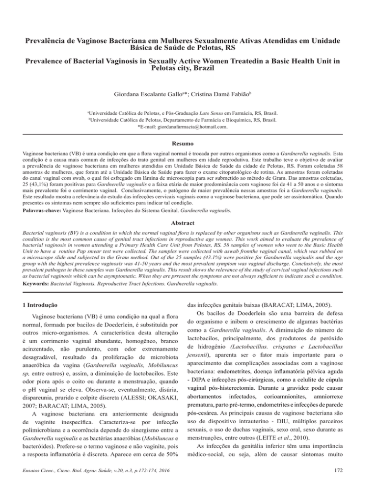 GALLO,G.E.; FABIÃO,C.D. Prevalência de Vaginose Bacteriana em Mulheres Sexualmente Ativas Atendidas em Unidade Básica de Saúde de Pelotas, RS Prevalence of Bacterial Vaginosis in Sexually Active Women Treatedin a Basic Health Unit in Pelotas city, Brazil Giordana Escalante Galloa*; Cristina Damé Fabiãob Universidade Católica de Pelotas, e Pós-Graduação Lato Sensu em Farmácia, RS, Brasil. Universidade Católica de Pelotas, Departamento de Farmácia e Bioquímica, RS, Brasil. *E-mail: [email protected]. a b Resumo Vaginose bacteriana (VB) é uma condição em que a flora vaginal normal é trocada por outros organismos como a Gardnerella vaginalis. Esta condição é a causa mais comum de infecções do trato genital em mulheres em idade reprodutiva. Este trabalho teve o objetivo de avaliar a prevalência de vaginose bacteriana em mulheres atendidas em Unidade Básica de Saúde da cidade de Pelotas, RS. Foram coletadas 58 amostras de mulheres, que foram até a Unidade Básica de Saúde para fazer o exame citopatológico de rotina. As amostras foram coletadas do canal vaginal com swab, o qual foi esfregado em lâmina de microscopia para ser submetido ao método de Gram. Das amostras coletadas, 25 (43,1%) foram positivas para Gardnerella vaginalis e a faixa etária de maior predominância com vaginose foi de 41 a 50 anos e o sintoma mais prevalente foi o corrimento vaginal. Conclusivamente, o patógeno de maior prevalência nessas amostras foi a Gardnerella vaginalis. Este resultado mostra a relevância do estudo das infecções cervicais vaginais como a vaginose bacteriana, que pode ser assintomática. Quando presentes os sintomas nem sempre são suficientes para indicar tal condição. Palavras-chave: Vaginose Bacteriana. Infecções do Sistema Genital. Gardnerella vaginalis. Abstract Bacterial vaginosis (BV) is a condition in which the normal vaginal flora is replaced by other organisms such as Gardnerella vaginalis. This condition is the most common cause of genital tract infections in reproductive age women. This work aimed to evaluate the prevalence of bacterial vaginosis in women attending a Primary Health Care Unit from Pelotas, RS. 58 samples of women who went to the Basic Health Unit to have a routine Pap smear test were collected. The samples were collected with aswab fromthe vaginal canal, which was rubbed on a microscope slide and subjected to the Gram method. Out of the 25 samples (43.1%) were positive for Gardnerella vaginalis and the age group with the highest prevalence vaginosis was 41-50 years and the most prevalent symptom was vaginal discharge. Conclusively, the most prevalent pathogen in these samples was Gardnerella vaginalis. This result shows the relevance of the study of cervical vaginal infections such as bacterial vaginosis which can be asymptomatic. When they are prresent the symptoms are not always sufficient to indicate such a condition. Keywords: Bacterial Vaginosis. Reproductive Tract Infections. Gardnerella vaginalis. 1 Introdução Vaginose bacteriana (VB) é uma condição na qual a flora normal, formada por bacilos de Doederlein, é substituída por outros micro-organismos. A característica desta alteração é um corrimento vaginal abundante, homogêneo, branco acinzentado, não purulento, com odor extremamente desagradável, resultado da proliferação de microbiota anaeróbica da vagina (Gardnerella vaginalis, Mobiluncus sp, entre outros) e, assim, a diminuição de lactobacilos. Este odor piora após o coito ou durante a menstruação, quando o pH vaginal se eleva. Observa-se, eventualmente, disúria, dispareunia, prurido e colpite discreta (ALESSI; OKASAKI, 2007; BARACAT; LIMA, 2005). A vaginose bacteriana era anteriormente designada de vaginite inespecífica. Caracteriza-se por infecção polimicrobiana e a ocorrência depende do sinergismo entre a Gardnerella vaginalis e as bactérias anaeróbias (Mobiluncus e bacteróides). Prefere-se o termo vaginose e não vaginite, pois a resposta inflamatória é discreta. Aparece em cerca de 50% Ensaios Cienc., Cienc. Biol. Agrar. Saúde, v.20, n.3, p.172-174, 2016 das infecções genitais baixas (BARACAT; LIMA, 2005). Os bacilos de Doederlein são uma barreira de defesa do organismo e inibem o crescimento de algumas bactérias como a Gardnerella vaginalis. A diminuição do número de lactobacilos, principalmente, dos produtores de peróxido de hidrogênio (Lactobacillus. crispatus e Lactobacillus jensenii), aparenta ser o fator mais importante para o aparecimento das complicações associadas com a vaginose bacteriana: endometrites, doença inflamatória pélvica aguda - DIPA e infecções pós-cirúrgicas, como a celulite de cúpula vaginal pós-histerectomia. Durante a gravidez pode causar abortamentos infectados, corioamnionites, amniorrexe prematura, parto pré-termo, endometrites e infecções de parede pós-cesárea. As principais causas de vaginose bacteriana são uso de dispositivo intrauterino - DIU, múltiplos parceiros sexuais, o uso de duchas vaginais, sexo oral, sexo durante as menstruações, entre outros (LEITE et al., 2010). As infecções da genitália inferior têm uma importância médico-social, ou seja, além de causar sintomas muito 172 Prevalência de Vaginose Bacteriana em Mulheres Sexualmente Ativas Atendidas em Unidade Básica de Saúde de Pelotas, RS desconfortáveis para a mulher, podem também comprometer o trato genital superior, pois podem ascender para este local. Além disso, essas infecções fazem parte da cadeia de disseminação das doenças sexualmente transmissíveis e podem repercutir, desfavoravelmente, no ciclo gravídico puerperal (ALESSI; OKASAKI, 2007). A Gardnerella vaginalis possui características morfológicas de coco-bacilos, curtos, Gram-variáveis, pleomórficos, não capsulados, imóveis e anaeróbicos facultativos (MOTA et al., 2012). São utilizados alguns parâmetros de diagnóstico da vaginose bacteriana como o pH vaginal > 4,5; a leucorrei