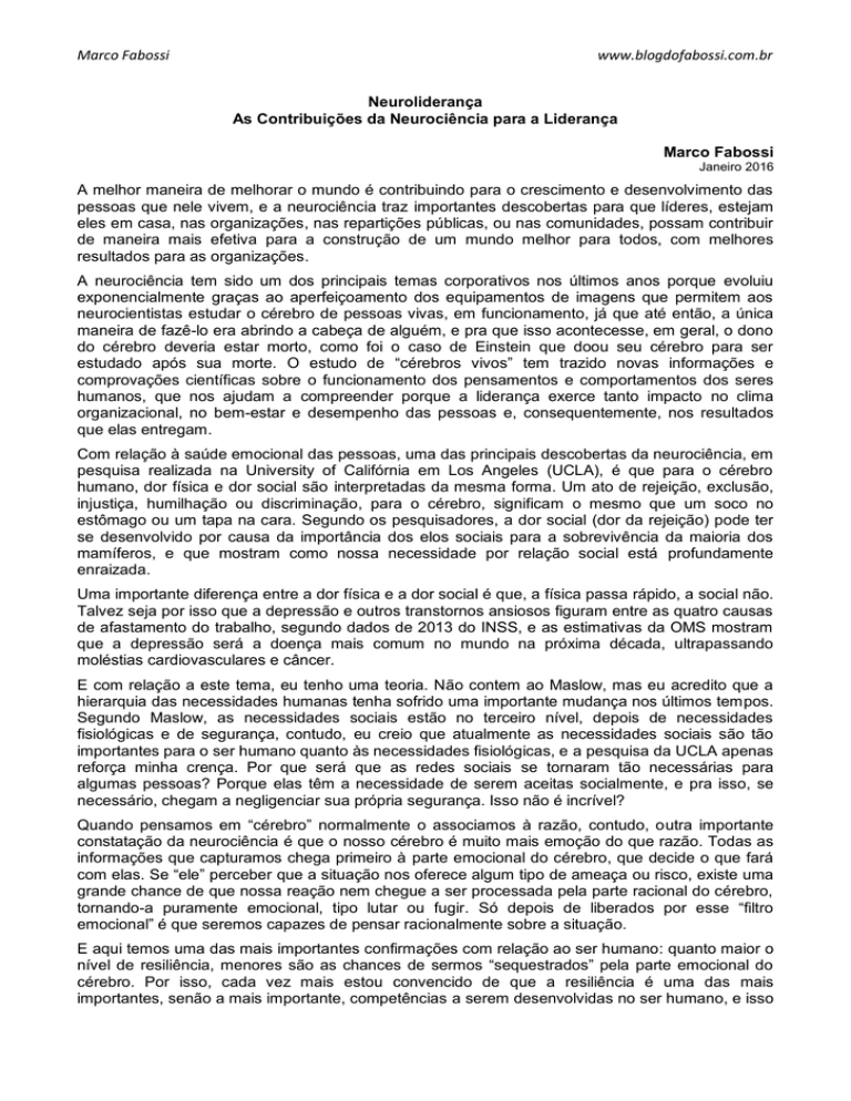 Marco Fabossi www.blogdofabossi.com.br Neuroliderança As Contribuições da Neurociência para a Liderança Marco Fabossi Janeiro 2016 A melhor maneira de melhorar o mundo é contribuindo para o crescimento e desenvolvimento das pessoas que nele vivem, e a neurociência traz importantes descobertas para que líderes, estejam eles em casa, nas organizações, nas repartições públicas, ou nas comunidades, possam contribuir de maneira mais efetiva para a construção de um mundo melhor para todos, com melhores resultados para as organizações. A neurociência tem sido um dos principais temas corporativos nos últimos anos porque evoluiu exponencialmente graças ao aperfeiçoamento dos equipamentos de imagens que permitem aos neurocientistas estudar o cérebro de pessoas vivas, em funcionamento, já que até então, a única maneira de fazê-lo era abrindo a cabeça de alguém, e pra que isso acontecesse, em geral, o dono do cérebro deveria estar morto, como foi o caso de Einstein que doou seu cérebro para ser estudado após sua morte. O estudo de “cérebros vivos” tem trazido novas informações e comprovações científicas sobre o funcionamento dos pensamentos e comportamentos dos seres humanos, que nos ajudam a compreender porque a liderança exerce tanto impacto no clima organizacional, no bem-estar e desempenho das pessoas e, consequentemente, nos resultados que elas entregam. Com relação à saúde emocional das pessoas, uma das principais descobertas da neurociência, em pesquisa realizada na University of Califórnia em Los Angeles (UCLA), é que para o cérebro humano, dor física e dor social são interpretadas da mesma forma. Um ato de rejeição, exclusão, injustiça, humilhação ou discriminação, para o cérebro, significam o mesmo que um soco no estômago ou um tapa na cara. Segundo os pesquisadores, a dor social (dor da rejeição) pode ter se desenvolvido por causa da importância dos elos sociais para a sobrevivência da maioria dos mamíferos, e que mostram como nossa necessidade por relação social está profundamente enraizada. Uma importante diferença entre a dor física e a dor social é que, a física passa rápido, a social não. Talvez seja por isso que a depressão e outros transtornos ansiosos figuram entre as quatro causas de afastamento do trabalho, segundo dados de 2013 do INSS, e as estimativas da OMS mostram que a depressão será a doença mais comum no mundo na próxima década, ultrapassando moléstias cardiovasculares e câncer. E com relação a este tema, eu tenho uma teoria. Não contem ao Maslow, mas eu acredito que a hierarquia das necessidades humanas tenha sofrido uma importante mudança nos últimos tempos. Segundo Maslow, as necessidades sociais estão no terceiro nível, depois de necessidades fisiológicas e de segurança, contudo, eu creio que atualmente as necessidades sociais são tão importantes para o ser humano quanto às necessidades fisiológicas, e a pesquisa da UCLA apenas reforça minha crença. Por que será que as redes sociais se tornaram tão necessárias para algumas pessoas? Porque elas têm a necessidade de serem aceitas socialmente, e pra isso, se necessário, chegam a negligenciar sua própria segurança. Isso não é incrível? Quando pensamos em “cérebro” normalmente o associamos à razão, contudo, outra importante constatação da neurociência é que o nosso cérebro é muito mais emoção do que razão. Todas as informações que capturamos chega primeiro à parte emocional do cérebro, que decide o que fará com elas. Se “ele” perceber que a situação nos oferece algum tipo de ameaça ou risco, existe uma grande chance de que nossa reação nem chegue a ser processada pela parte racional do cérebro, tornando-a puramente emocional, tipo lutar ou fugir. Só depois de liberados por esse “filtro emocional” é que seremos capazes de pensar racionalmente sobre a situação. E aqui temos uma das mais importantes confirmações com relação ao ser humano: quanto maior o nível de resiliência, menores são as chances de sermos “sequestrados” pela parte emocional do cérebro. Por isso, cada vez mais estou convencido de que a resiliência é uma das mais importantes, senão a mais importante, competências a serem desenvolvidas no ser humano, e isso Marco Fabossi www.blogdofabossi.com.br começa em casa. Pais que protegem demasiadamente seus filhos, por exemplo, não contribuem em nada para que eles possam se tornar pessoas resilientes no futuro, e isso pode prejudica-los demais! Assim como líderes paternalistas, que apenas incentivam as pessoas a uma vida de mediocridade. As pessoas precisam de ajuda para compreender que as adversidades fazem parte do caminho de crescimento e desenvolvimento, e que o problema não está na situação em si, mas na maneira pela qual encaramos, interpretamos e reagimos ao problema. Quando a parte emocional do cérebro aprende que as situações não são, por natureza, boas ou ruins, e que temos uma enorme capacidade de influenciar os resultados, nos tornamos mais resilientes, diminuímos o sofrimento, minimizamos a sensação de ameaça, potencializamos a sensação de recompensa, permitimos que a parte racional do cérebro faça parte das decisões, e por consequência, chegamos a resultados melhores. Muito bem, mas o que tudo isso tem a ver com liderança? Tudo! Porque o líder é um dos maiores agentes reguladores da dor social nas organizações, já que a base da liderança é o relacionamento, e a qualidade desse relacionamento implica diretamente no nível de dor social das pessoas e nos resultados. O primeiro passo, portanto, para que haja interações sociais saudáveis na liderança é o estabelecimento de relações de confiança. Aliás, permita-me lhe fazer uma pergunta: Você se relaciona bem com pessoas em quem não confia? Tampouco as pessoas que estão ao seu redor o fazem, ou seja, sem confiança inexistem relações saudáveis e produti