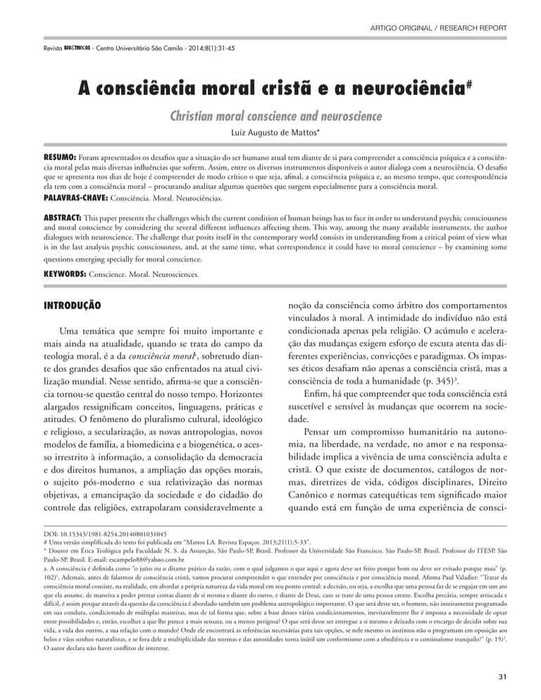 ARTIGO ORIGINAL / RESEARCH REPORT Revista - Centro Universitário São Camilo - 2014;8(1):31-45 A consciência moral cristã e a neurociência# Christian moral conscience and neuroscience Luiz Augusto de Mattos* Resumo: Foram apresentados os desafios que a situação do ser humano atual tem diante de si para compreender a consciência psíquica e a consciência moral pelas mais diversas influências que sofrem. Assim, entre os diversos instrumentos disponíveis o autor dialoga com a neurociência. O desafio que se apresenta nos dias de hoje é compreender de modo crítico o que seja, afinal, a consciência psíquica e, ao mesmo tempo, que correspondência ela tem com a consciência moral – procurando analisar algumas questões que surgem especialmente para a consciência moral. Palavras-chave: Consciência. Moral. Neurociências. Abstract: This paper presents the challenges which the current condition of human beings has to face in order to understand psychic consciousness and moral conscience by considering the several different influences affecting them. This way, among the many available instruments, the author dialogues with neuroscience. The challenge that posits itself in the contemporary world consists in understanding from a critical point of view what is in the last analysis psychic consciousness, and, at the same time, what correspondence it could have to moral conscience – by examining some questions emerging specially for moral conscience. Keywords: Conscience. Moral. Neurosciences. Introdução Uma temática que sempre foi muito importante e mais ainda na atualidade, quando se trata do campo da teologia moral, é a da consciência morala , sobretudo diante dos grandes desafios que são enfrentados na atual civilização mundial. Nesse sentido, afirma-se que a consciência tornou-se questão central do nosso tempo. Horizontes alargados ressignificam conceitos, linguagens, práticas e atitudes. O fenômeno do pluralismo cultural, ideológico e religioso, a secularização, as novas antropologias, novos modelos de família, a biomedicina e a biogenética, o acesso irrestrito à informação, a consolidação da democracia e dos direitos humanos, a ampliação das opções morais, o sujeito pós-moderno e sua relativização das normas objetivas, a emancipação da sociedade e do cidadão do controle das religiões, extrapolaram consideravelmente a noção da consciência como árbitro dos comportamentos vinculados à moral. A intimidade do indivíduo não está condicionada apenas pela religião. O acúmulo e aceleração das mudanças exigem esforço de escuta atenta das diferentes experiências, convicções e paradigmas. Os impasses éticos desafiam não apenas a consciência cristã, mas a consciência de toda a humanidade (p. 345)3. Enfim, há que compreender que toda consciência está suscetível e sensível às mudanças que ocorrem na sociedade. Pensar um compromisso humanitário na autonomia, na liberdade, na verdade, no amor e na responsabilidade implica a vivência de uma consciência adulta e cristã. O que existe de documentos, catálogos de normas, diretrizes de vida, códigos disciplinares, Direito Canônico e normas catequéticas tem significado maior quando está em função de uma experiência de consci- DOI: 10.15343/1981-8254.20140801031045 # Uma versão simplificada do texto foi publicada em “Mattos LA. Revista Espaços. 2013;21(1):5-33”. * Doutor em Ética Teológica pela Faculdade N. S. da Assunção, São Paulo-SP, Brasil. Professor da Universidade São Francisco, São Paulo-SP, Brasil. Professor do ITESP, São Paulo-SP, Brasil. E-mail: [email protected] a. A consciência é definida como “o juízo ou o ditame prático da razão, com o qual julgamos o que aqui e agora deve ser feito porque bom ou deve ser evitado porque mau” (p. 102)1. Ademais, antes de falarmos de consciência cristã, vamos procurar compreender o que entender por consciência e por consciência moral. Afirma Paul Valadier: “Tratar da consciência moral consiste, na realidade, em abordar a própria natureza da vida moral em seu ponto central: a decisão, ou seja, a escolha que uma pessoa faz de se engajar em um ato que ela assume, de maneira a poder prestar contas diante de si mesma e diante do outro, e diante de Deus, caso se trate de uma pessoa crente. Escolha precária, sempre arriscada e difícil, é assim porque através da questão da consciência é abordado também um problema antropológico importante. O que será deste ser, o homem, não inteiramente programado em sua conduta, condicionado de múltiplas maneiras, mas de tal forma que, sobre a base desses vários condicionamentos, inevitavelmente lhe é imposta a necessidade de optar entre possibilidades e, então, escolher a que lhe parece a mais sensata, ou a menos perigosa? O que será desse ser entregue a si mesmo e deixado com o encargo de decidir sobre sua vida, a vida dos outros, a sua relação com o mundo? Onde ele encontrará as referências necessárias para tais opções, se nele mesmo os instintos não o programam em oposição aos belos e vãos sonhos naturalistas, e se fora dele a multiplicidade das normas e das autoridades torna inútil um conformismo com a obediência e o continuísmo tranquilo?” (p. 15)2. O autor declara não haver conflitos de interesse. 31 A consciência moral cristã e a neurociência Revista ência ética e responsável diante dos compromissos com a vida da humanidadeb. Manter uma consciência lúcida e livre é fundamental para não esclerosar as próprias ações, as quais deverão afugentar qualquer sintoma de rigorismo, fixismo, legalismo e autoritarismo. Há que afirmar que, desde que não esteja em perigo o depósito da fé, nem toda transgressão, à luz da consciência, é condenável4! Também quando se aborda o tema da consciência moral apresenta-se uma conceituação e um entendimento nesses rumos: A consciência é percebida como instância da inteligência (E
