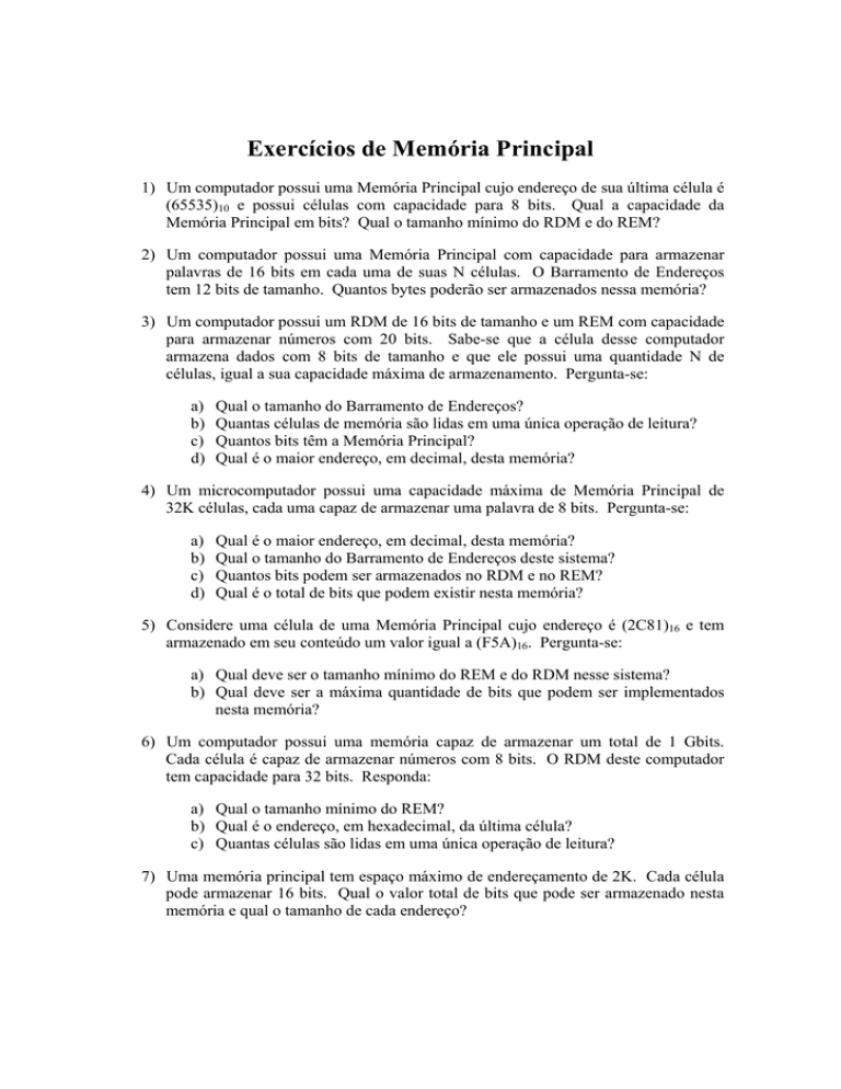 Exercícios de Memória Principal 1) Um computador possui uma Memória Principal cujo endereço de sua última célula é (65535)10 e possui células com capacidade para 8 bits. Qual a capacidade da Memória Principal em bits? Qual o tamanho mínimo do RDM e do REM? 2) Um computador possui uma Memória Principal com capacidade para armazenar palavras de 16 bits em cada uma de suas N células. O Barramento de Endereços tem 12 bits de tamanho. Quantos bytes poderão ser armazenados nessa memória? 3) Um computador possui um RDM de 16 bits de tamanho e um REM com capacidade para armazenar números com 20 bits. Sabe-se que a célula desse computador armazena dados com 8 bits de tamanho e que ele possui uma quantidade N de células, igual a sua capacidade máxima de armazenamento. Pergunta-se: a) b) c) d) Qual o tamanho do Barramento de Endereços? Quantas células de memória são lidas em uma única operação de leitura? Quantos bits têm a Memória Principal? Qual é o maior endereço, em decimal, desta memória? 4) Um microcomputador possui uma capacidade máxima de Memória Principal de 32K células, cada uma capaz de armazenar uma palavra de 8 bits. Pergunta-se: a) b) c) d) Qual é o maior endereço, em decimal, desta memória? Qual o tamanho do Barramento de Endereços deste sistema? Quantos bits podem ser armazenados no RDM e no REM? Qual é o total de bits que podem existir nesta memória? 5) Considere uma célula de uma Memória Principal cujo endereço é (2C81)16 e tem armazenado em seu conteúdo um valor igual a (F5A)16. Pergunta-se: a) Qual deve ser o tamanho mínimo do REM e do RDM nesse sistema? b) Qual deve ser a máxima quantidade de bits que podem ser implementados nesta memória? 6) Um computador possui uma memória capaz de armazenar um total de 1 Gbits. Cada célula é capaz de armazenar números com 8 bits. O RDM deste computador tem capacidade para 32 bits. Responda: a) Qual o tamanho mínimo do REM? b) Qual é o endereço, em hexadecimal, da última célula? c) Quantas células são lidas em uma única operação de leitura? 7) Uma memória principal tem espaço máximo de endereçamento de 2K. Cada célula pode armazenar 16 bits. Qual o valor total de bits que pode ser armazenado nesta memória e qual o tamanho de cada endereço? 8) Uma memória principal é fabricada com a possibilidade de armazenar um máximo de 256K bits. Cada célula pode armazenar 8 bits. Qual é o tamanho de cada endereço e qual é o total de células que podem ser utilizadas naquela memória? 9) Um computador possui uma memória principal com uma capacidade máxima de armazenamento de 2K palavras de 16 bits cada. (ps: quando não for mencionado algo diferente, a célula tem o mesmo tamanho da palavra.) a) Qual o tamanho mínimo do REM e do RDM? b) Qual é o endereço, em decimal e em hexadecimal, da última célula? c) Qual a quantidade total de bits que nela pode ser armazenada? 10) Um processador possui um RDM com capacidade de armazenar 32 bits e um REM com capacidade de armazenar 24 bits. Sabendo-se que em cada acesso são lidas 2 células da memória principal, pergunta-se: a) Qual é a capacidade máxima de endereçamento do computador em questão? b) Qual a quantidade total de bits que pode ser armazenada na memória principal? c) Qual é o tamanho em bits de cada célula desta memória? 11) Um processador possui um Barramento de Endereços com capacidade de permitir a transferência de 33 bits de cada vez. Sabe-se que o Barramento de Dados permite a transferência de quatro palavras em cada acesso e que cada célula da memória armazena 1/8 de cada palavra. Considerando que a memória principal pode armazenar um máximo de 64G bits, pergunta-se: a) Qual é a quantidade máxima de células que podem ser armazenados na memória principal? b) Qual é o total de bits do REM e do Barramento de Dados? c) Qual é o tamanho em bits de cada célula e da palavra desta memória? d) Quantas células são lidas em uma única operação de leitura? Respostas ⎧Capacidade da Memória Principal = 512K bits 1 – ⎪⎨RDM = 8 bits ⎪REM = 16 bits ⎩ 2 – Capacidade da Memória Principal = 8K bytes 3– ⎧a) Barramento de Endereços = 20 bits ⎪b) Total de células lidas por operação de leitura = 2 células ⎪ ⎨ ⎪c) Capacidade da Memória Principal = 8M bits ⎪⎩d) Maior endereço = (1.048.575)10 4– ⎧a) Maior endereço = (32.767 )10 ⎪ ⎪b) Barramento de Endereços = 15 bits ⎨ ⎪c) RDM = 8 bits; REM = 15 bits ⎪⎩d) Capacidade da Memória Principal = 256K bits ⎧a) REM = 14 bits; RDM = 12 bits ⎩b) Capacidade da Memória Principal = 192K bits 5– ⎨ ⎧a) REM = 27 bits 6 – ⎪⎨b) Endereço da última célula = (7FFFFFF)16 ⎪c) Total de células lidas por operação de leitura = 4 células ⎩ ⎧Capacidade da Memória Principal = 32K bits ⎩Total de bits do Endereço = 11 bits 7– ⎨ Total de bits do Endereço = 15 bits 8 – ⎧⎨ ⎩Total de células da Memória Principal = 32K células 9– ⎧a) REM = 11 bits; RDM = 16 bits ⎪ ⎨b) Endereço da última célula = (2047 )10 ; (7FF)16 ⎪c) Capacidade da Memória Principal = 32K bits ⎩ ⎧a) Capacidade máxima de endereçamento = 16M endereços 10 – ⎪⎨b) Capacidade da Memória Principal = 256M bits ⎪c) Capacidade da célula = 16 bits ⎩ ⎧a) Total de células da Memória Principal = 8G células ⎪b) REM = 33 bits; Barramento de Dados = 256 bits ⎪ 11 – ⎨ ⎪c) Capacidade da Célula = 8 bits; Tamanho da palavra = 64 bits ⎪⎩d) Total de células lidas por operação de leitura = 32 células