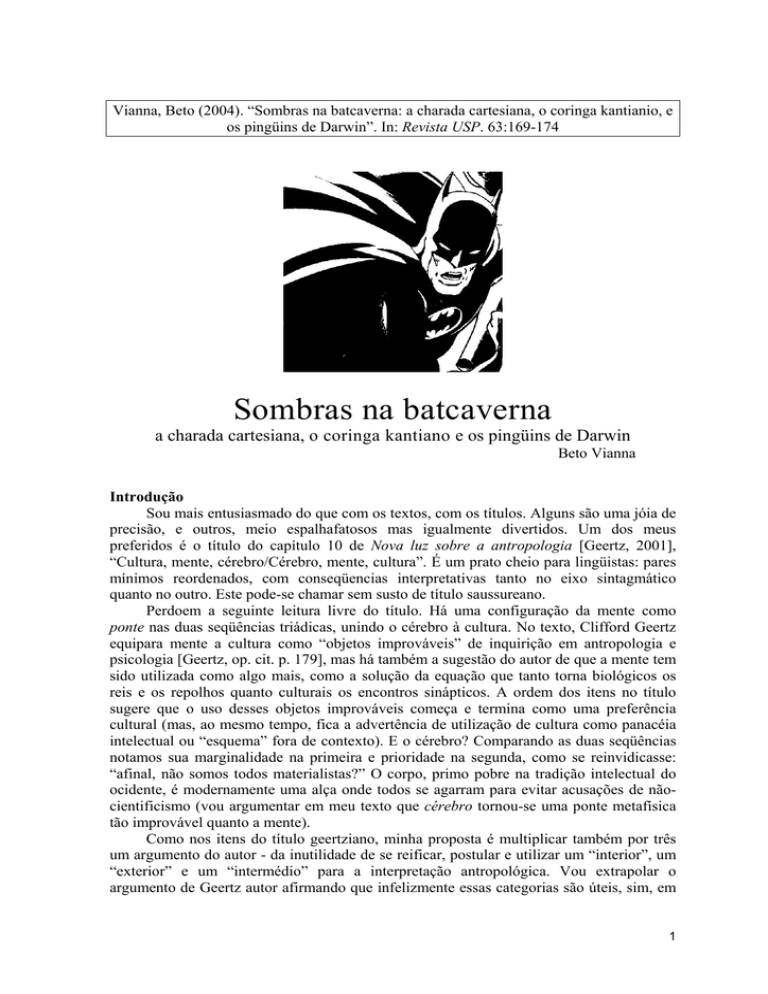 Vianna, Beto (2004). “Sombras na batcaverna: a charada cartesiana, o coringa kantianio, e os pingüins de Darwin”. In: Revista USP. 63:169-174 Sombras na batcaverna a charada cartesiana, o coringa kantiano e os pingüins de Darwin Beto Vianna Introdução Sou mais entusiasmado do que com os textos, com os títulos. Alguns são uma jóia de precisão, e outros, meio espalhafatosos mas igualmente divertidos. Um dos meus preferidos é o título do capítulo 10 de Nova luz sobre a antropologia [Geertz, 2001], “Cultura, mente, cérebro/Cérebro, mente, cultura”. É um prato cheio para lingüistas: pares mínimos reordenados, com conseqüencias interpretativas tanto no eixo sintagmático quanto no outro. Este pode-se chamar sem susto de título saussureano. Perdoem a seguinte leitura livre do título. Há uma configuração da mente como ponte nas duas seqüências triádicas, unindo o cérebro à cultura. No texto, Clifford Geertz equipara mente a cultura como “objetos improváveis” de inquirição em antropologia e psicologia [Geertz, op. cit. p. 179], mas há também a sugestão do autor de que a mente tem sido utilizada como algo mais, como a solução da equação que tanto torna biológicos os reis e os repolhos quanto culturais os encontros sinápticos. A ordem dos itens no título sugere que o uso desses objetos improváveis começa e termina como uma preferência cultural (mas, ao mesmo tempo, fica a advertência de utilização de cultura como panacéia intelectual ou “esquema” fora de contexto). E o cérebro? Comparando as duas seqüências notamos sua marginalidade na primeira e prioridade na segunda, como se reinvidicasse: “afinal, não somos todos materialistas?” O corpo, primo pobre na tradição intelectual do ocidente, é modernamente uma alça onde todos se agarram para evitar acusações de nãocientificismo (vou argumentar em meu texto que cérebro tornou-se uma ponte metafísica tão improvável quanto a mente). Como nos itens do título geertziano, minha proposta é multiplicar também por três um argumento do autor - da inutilidade de se reificar, postular e utilizar um “interior”, um “exterior” e um “intermédio” para a interpretação antropológica. Vou extrapolar o argumento de Geertz autor afirmando que infelizmente essas categorias são úteis, sim, em 1 uma certa visão perniciosa da ciência e em uma certa circunscrição do humano, e que não vejo a antropologia em particular, mas o estudo da diversidade em geral, como a principal vítima do uso substantivo dessas categorias: cérebro, mente e cultura, não necesariamente nessa ordem. Ao final do capítulo, Geertz nos brinda com um poeminha de Richar Wilbur, “Mente”, que tem a seguinte última estrofe: And has this simile a like perfection? The mind is like a bat. Precisely. Save That in the very happiest intellection A graceful error may correct the cave1. Geertz aprecia a metáfora do morcego criativo, elaborando sua própria caverna (presumivelmente, ao contrário do morcego de facto, que só pode contar com seus sentidos aguçados contra uma escuridão a priori...). A subversão das sombras platônicas é completa: os sentidos não mais iludem, mas constróem a realidade. Partindo do poeminha citado, e em homenagem ao nosso antropólogo americano, minha metáfora condutora é o também yankee seriado “Batman”, dos anos 60. Um agora intelectual, e os personagens, nossos velhos conhecidos. Charada: a mente Não há deleite maior para O Investigador Ocidental, de Arquimedes a Madame Curie (e os filósofos todos inclusos), do que encontrar um fato que se encaixe perfeitamente em uma teoria pré-concebida ou pré-adotada. A melhor notícia é que os fatos estão todos aí, à disposição de quem se disponha a investigá-los. Tudo corre a contento pois o fornecedor primário de fatos não é o mundo, não se iludam, mas as próprias teorias pré-concebidas ou pré-adotadas em que eles elegantemente se encaixam. Não estou me confessando adepto do mote “é a nossa mente que constrói o mundo em que vivemos”, e para provar minha inocência, vou justamente propor que a tal “mente construidora de mundos” é um desses fatos feitos sob medida para sistemas a priori. Infelizmente, e Geertz aponta bem em seu texto, ele também cria problemas constrangedores. Na literatura filosófica é antiga a detratação do antiqüíssimo debate entre se o humano (de agora em diante, “nós”) conhece o mundo através da experiência imediata dos sentidos - ou da imposição de categorias abstratas a esse mesmo mundo. O apedrejamento usual da segunda opção é a acusação de solipsismo. Para que, afinal, nos daríamos ao trabalho de sujar as mãos no mundo, se podemos muito bem continuar vivendo apenas da manipulação de categorias abstratas? Muito ingênua, a pergunta? Nem tanto, pois se temos em nossa cultura uma longa tradição da alma imortal (platônica, cristã, cartesiana...), a postulação de um sistemas de regras para manipular categorias e as metáforas da “transmissão de informação” servem ao mesmo propósito. É o que está por trás de grande parte das pesquisas clássicas em AI - inteligência artificial - e da decodificação do genoma humano, chegando às grandes produções sci-fi do cinema, como Matrix (onde a mente sobrevive à pessoa) e Parque dos Dinossauros (onde o código sobrevive ao organismo). Nessa visão, o sonho de viajar no tempo não requer soluções tecnológicas para o dilema da relatividade, nem incrementos na tecnologia de congelamento de corpos, é antes uma simples questão de progressos no armazenamento de dados. Interno é sinônimo científico de eterno. Não é muito difícil demonstrar a fragilidade dessa alucinação neo-cartesiana. Na perspectiva de algoritmos descorporificados que “fazem coisas”, os projetos AI e Genoma 2 são fracassos rotundos (não confessados, é claro), e Matrix e o Parque jurássico decepcionam como 