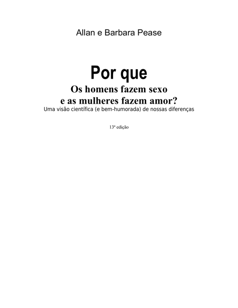 Allan e Barbara Pease Por que Os homens fazem sexo e as mulheres fazem amor? Uma visão científica (e bem-humorada) de nossas diferenças 13ª edição Allan e Barbara Pease Por que os homens fazem sexo e as mulheres fazem amor? © Allan e Barbara Pease, 2000. Tradução Neuza M. Simões Capelo preparo de originais Regina da Veiga Pereira revisão José Tedin Pinto e Sérgio Bellinello Soares capa Silvana Mattievich editoração eletrônica Claudia Lopes Mendes e Elisabeth Dunhoffer fotolitos RR Donnelley Mergulhar impressão e acabamento Cromosete Gráfica e Editora Ltda. CIP-BRASIL. CATALOGAÇÃO-NA-FONTE SINDICATO NACIONAL DOS EDITORES DE LIVRO, RJ ——————————————————————————————————————————————————————————————————, P375p Pea se, Al la n Por que os homens fazem sexo e as mulheres fazem a m o r ? : uma visão científica (e bem-humorada) de nossas diferenças / Al l a n Pease e Barbara Pease ; t r a d u ç ã o N e u z a M . Si m õ e s C a p e l o - Rio de janeiro : Se xt an te, 2000 Tradução de: Why men don't listen & women can't read maps ISBN 85-86796-52-2 1. Relações homem-mulher. 2. Sexo- Diferenças (P si co lo gia ). I. Pe as e, B ar b a ra. II. T it ul o. 00-0530 CDD 306.7 CDU 392.6 ——————————————————————————————————————————————————————————————————, Todos os direitos reservados, no Brasil, por Editora Sextante (GMT Editores Ltda.) Rua Voluntários da Pátria, 45 - Gr. 1404 - Botafogo 22270-000 - Rio de janeiro - RJ Tel.: (21) 2286-9944 - Fax: (21) 2286-9244 Central de Atendimento: 0800-22-6306 Email.- atendimentoCa3esextante.corri. br www.esextante.com.br 2 Allan e Barbara Pease Por que os homens fazem sexo e as mulheres fazem amor? Índice Um passeio de domingo Por que foi tão difícil escrever este livro? Espécies iguais, mundos diferentes Tipos de trabalho diferentes As pesquisas comprovam Será que tudo não passa duma conspiração masculina? Teu guia sobre o ser humano Mas as coisas mudaram Tudo faz sentido A mulher é um radar Os olhos falam Olhos atrás da cabeça? O estranho caso da manteiga desaparecida O homem e a paquera Ver é crer Por que os homens devem assumir a direção na noite? Por que as mulheres têm um sexto sentido? Por que os homens não conseguem mentir pra as mulheres? Ela também escuta melhor... A mulher lê nas entrelinhas Por que os meninos não ouvem? Os homens não reparam em detalhe A mágica do toque Mulheres são sensoriais Por que os homens têm a pele tão grossa? O gosto da vida Alguma coisa no ar Por que os homens são chamados de insensíveis? Está tudo aí Somos os mais espertos Como o cérebro defende o território O cérebro por trás do sucesso Localização no cérebro As primeiras pesquisas sobre o cérebro como se analisa o cérebro Por que as mulheres são melhor conectadas? Por que os homens só conseguem fazer única coisa de cada vez? Faças o teste da escova de dente A identidade sexual O teste da estrutura do cérebro Como avaliar o teste Analisando os resultados A interseção Uma palavra final... Falando e ouvindo A estratégia do sapato azul ou dourado Por que os homens não falam direito? Os meninos e a escola Homem fala sozinho e mulher pensa alto Mulheres falam, homens querem sossego 3 Allan e Barbara Pease Por que os homens fazem sexo e as mulheres fazem amor? Por que e os casais se desentendem? Como os homens falam Os desvios de curso do pensamento feminino Estratégias pra falar com os homens Mulheres usam as palavras como recompensa Mulheres são indiretas Homens vão direto O que fazer Como levar um homem à ação Mulheres são emocionais, homens são literais Como as mulheres ouvem Os homens ouvem como estátuas A voz infantil Habilidade espacial Como um mapa quase causou um divórcio Pensamento sexista O caçador em ação Diana e seus móveis Testando habilidade espacial Como evitar discussão no carro Como vender a uma mulher Então, mulheres, o que fazer? As mulheres podem melhorar sua habilidade espacial? Em resumo Pensamentos, atitudes, emoções e outros campos minados Nossas diferenças de percepção Meninos gostam de objetos, meninas gostam de gente Homem moderno, mulher moderna: O que querem? O cérebro e a emoção A mulher valoriza o relacionamento, o homem valoriza o trabalho Diferenças que separam Por que os homens detestam estar errados? Por que os homens escondem a emoção? Por que os homens acionam o controle remoto? Como fazer os meninos falarem Quando os dois estão sob pressão Compra: Mulheres felizes, homens em pânico Como fazer um elogio sincero a uma mulher Nosso coquetel químico Como os hormônios nos governam A química do amor A química hormonal TPM e desejo sexual A tristeza química da mulher Testosterona: Prêmio ou castigo? O caso da louça voadora Por que os homens são agressivos? Por que os homens trabalham duro? Testosterona e habilidade espacial Por que os homens engordam na frente e as mulheres atrás? Gueis, lésbicas e transexuais Os hormônios em ação Homossexualidade é parte da história 4 Allan e Barbara Pease Por que os homens fazem sexo e as mulheres fazem amor? É uma questão de genética ou de escolha? Por que o pai é acusado? A opção pode ser mudada? Como produzir um rato guei Como acontecem os bebês gueis Como as lésbicas se tornam lésbicas O cérebro transexual Por que, às vezes, é difícil saber quem é guei? Por que ainda é mais difícil saber quem é lésbica? Homens, mulheres e sexo Onde fica o sexo no cérebro? Por que os homens não conseguem resistir? Por que as mulheres são mais fiéis? O homem é um fogão a gás, a mulher um forno elétrico Impulso sexual masculino e feminino Por que o sexo é motivo de discussão? Estresse e disposição pro sexo Com que freqüência