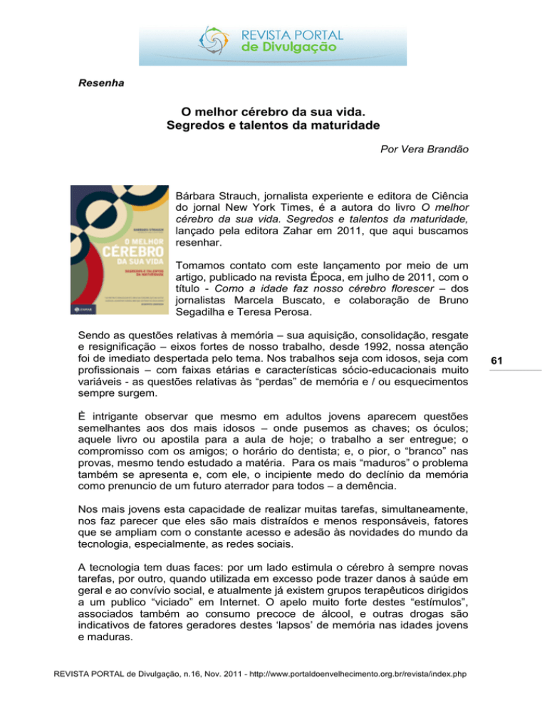 Resenha O melhor cérebro da sua vida. Segredos e talentos da maturidade Por Vera Brandão Bárbara Strauch, jornalista experiente e editora de Ciência do jornal New York Times, é a autora do livro O melhor cérebro da sua vida. Segredos e talentos da maturidade, lançado pela editora Zahar em 2011, que aqui buscamos resenhar. Tomamos contato com este lançamento por meio de um artigo, publicado na revista Época, em julho de 2011, com o título - Como a idade faz nosso cérebro florescer – dos jornalistas Marcela Buscato, e colaboração de Bruno Segadilha e Teresa Perosa. Sendo as questões relativas à memória – sua aquisição, consolidação, resgate e resignificação – eixos fortes de nosso trabalho, desde 1992, nossa atenção foi de imediato despertada pelo tema. Nos trabalhos seja com idosos, seja com profissionais – com faixas etárias e características sócio-educacionais muito variáveis - as questões relativas às “perdas” de memória e / ou esquecimentos sempre surgem. È intrigante observar que mesmo em adultos jovens aparecem questões semelhantes aos dos mais idosos – onde pusemos as chaves; os óculos; aquele livro ou apostila para a aula de hoje; o trabalho a ser entregue; o compromisso com os amigos; o horário do dentista; e, o pior, o “branco” nas provas, mesmo tendo estudado a matéria. Para os mais “maduros” o problema também se apresenta e, com ele, o incipiente medo do declínio da memória como prenuncio de um futuro aterrador para todos – a demência. Nos mais jovens esta capacidade de realizar muitas tarefas, simultaneamente, nos faz parecer que eles são mais distraídos e menos responsáveis, fatores que se ampliam com o constante acesso e adesão às novidades do mundo da tecnologia, especialmente, as redes sociais. A tecnologia tem duas faces: por um lado estimula o cérebro à sempre novas tarefas, por outro, quando utilizada em excesso pode trazer danos à saúde em geral e ao convívio social, e atualmente já existem grupos terapêuticos dirigidos a um publico “viciado” em Internet. O apelo muito forte destes “estímulos”, associados também ao consumo precoce de álcool, e outras drogas são indicativos de fatores geradores destes ‘lapsos’ de memória nas idades jovens e maduras. REVISTA PORTAL de Divulgação, n.16, Nov. 2011 - http://www.portaldoenvelhecimento.org.br/revista/index.php 61 O estresse causado pela competitividade - na escola e no trabalho -, o barulho, o excessivo número de informações, a necessidade de estar sempre em evidência, também características do mundo juvenil, se amplia na maturidade com suas novas, e poderosas, demandas – carreira, necessidade de atualização constante, compromissos familiares crescentes, problemas econômicos, etc. - tanto para homens como para mulheres. Este caminho irregular e repleto de armadilhas nos levaria ao um beco sem saída – no envelhecimento estes esquecimentos, justificados por estresse e excesso de demandas nas idades mais jovens, seriam justificados pelas crescentes perdas – as biológicas naturais pelo passar dos anos; do trabalho; do lugar social; de pessoas próximas; dos sentidos atribuídos a muitas coisas e pessoas, um processo no qual a tristeza e a depressão apareceriam como os primeiros sinais que, para alguns autores, levariam à ante-sala da demência. A afirmação que o com a idade nosso cérebro pode florescer nos pareceu interessante e promissora, confirmada pela leitura do artigo e, posteriormente, do livro. O artigo da revisa Época nos apresenta as idéias principais do livro e foi o ponto de partida e estímulo para sua posterior leitura. Neste artigo os autores apresentam a autora e obra: “Editora de saúde do jornal The New York Times, um dos mais influentes dos Estados Unidos, Bárbara resolveu investigar o que estava acontecendo com seu cérebro. Aos 56 anos, estava cansada de passar pela vergonha de encontrar um conhecido, lembrar o que haviam comido na última vez em que jantaram juntos, mas não ter a mínima idéia de como se chamava o cidadão. Queria entender por que se pegava parada em frente a um armário sem saber o que tinha ido buscar. Bárbara não entendia como o mesmo cérebro que lhe causava lapsos de memória tão evidentes decidira, nos últimos tempos, presenteá-la com habilidades de raciocínio igualmente surpreendentes. Ela sentia que, simplesmente, “sabia das coisas”, mas, ao mesmo tempo, se exasperava com a quantidade imensa de nomes e referências que pareciam estar sumindo na neblina da memória. Como pode ser? ” No artigo encontra-se uma afirmação que todos queremos escutar, nas palavras da autora: “Conforme envelhecemos, o cérebro se reorganiza e passa a agir e pensar de maneira diferente. Essa reestruturação nos torna mais inteligentes, calmos e felizes”. Podemos, incrédulos, indagar: - Será? Mas, as pesquisas realizadas em importantes centros de estudo, referências para o livro, são a comprovação de que a sofisticação dos exames de ressonância magnética tornou possível observar o cérebro em ação. Assim, os estudiosos descobriram que existe um desgaste natural das células nervosas, mas ele está localizado e circunscrito, causando um dano menor do se imaginava. REVISTA PORTAL de Divulgação, n.16, Nov. 2011 - http://www.portaldoenvelhecimento.org.br/revista/index.php 62 Baseada em inúmeras pesquisas bem documentadas ao longo do livro, a autora nos indica uma série de questões, entre as quais se destacam: Por que alguns cérebros envelhecem bem e outros não? É possível definirmos com mais exatidão o envelhecimento normal, em contraste com a verdadeira patologia, como o mal de Alzheimer? Poderemos descobrir o que responde pela diferença? Será que se trata de algo inato, ou as estratégias adaptativas podem funcionar? È evidente que não existem ainda respostas para todas elas, mas há indícios positivos para a continuidade destes estudos, e uma