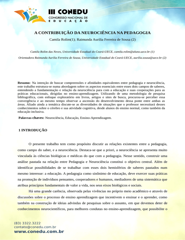 A CONTRIBUIÇÃO DA NEUROCIÊNCIA NA PEDAGOGIA Camila Rolim(1); Raimunda Aurilia Ferreira de Sousa (2) Camila Rolim das Neves, Universidade Estadual do Ceará-UECE, [email protected] (1) Orientadora Raimunda Aurilia Ferreira de Sousa, Universidade Estadual do Ceará-UECE, [email protected] (2) Resumo: Na intenção de buscar compreensões e afinidades equivalentes entre pedagogia e neurociência, este trabalho estrutura-se numa abordagem sobre os aspectos essenciais entre esses dois campos de saberes, entendendo a fundamentação e relação da neurociência para com a educação e suas cooperações para as práticas educacionais, dirigidas no ensino-aprendizagem. Utilizando de uma metodologia de pesquisa bibliográfica, com enfoque exploratório em livros, artigos e sites de busca, procurou-se perceber essa convergência e ao mesmo tempo observar a ascensão do desenvolvimento dessa ponte entre ambas as áreas. Aliado ainda a temática discute-se as diversidades de situações que o professor necessitará desses conhecimentos sobre o cérebro e sua atividade cognitiva, desde alunos do ensino normal, como também da educação inclusiva. Palavras-chaves: Neurociência, Educação, Ensino-Aprendizagem. 1 INTRODUÇÃO O presente trabalho tem como propósito discutir as relações existentes entre a pedagogia, como campo do saber, e a neurociência. Destaca-se que a priori, a neurociência se apresenta muito vinculada às ciências biológicas e médicas do que com a pedagogia. Nesse sentido, construir uma análise pautada na relação entre Pedagogia e Neurociência constitui o objetivo central. Além de identificar possibilidades de se trabalhar com esses dois hemisférios de saberes pautados num mesmo interesse: a educação. A pedagogia como sinônimo de educação, deve exercer suas práticas na promoção de indivíduos pensantes, cooperadores e humanos, mediadores de uma sistemática que atribua princípios fundamentais de valor a vida, nos seus eixos biológicos e sociais. Há uma grande carência, observada pelas vivências no próprio meio acadêmico e através de discussões sobre o processo de ensino aprendizagem que incentivem o ensinar e o aprender, como também na construção de ideias advindas de pesquisas sobre o assunto, em que devemos deter de conhecimentos neurocientíficos, para melhores condutas no ensino-aprendizagem, que possibilite o (83) 3322.3222 [email protected] www.conedu.com.br aprimoramento das capacidades lógicos cognitivas, e das habilidades de raciocínio perceptivo dos alunos. Consideramos que os conhecimentos adquiridos sobre bases neurocientíficas, poderão ser desenvolvidos na própria sala de aula para viabilizar e sustentar os saberes das disciplinas lecionadas, auxiliando significativamente o professor, condutor do exercício do saber. Nesse sentido o professor poderá identificar os potenciais, além de dificuldades, que inviabilizam o pleno desenvolvimento das funções cognitivas dos seus alunos, podendo desta forma trabalhar de acordo com as necessidades de cada um. Da mesma forma estabelece-se uma dinâmica interna nos relacionamentos interpessoais, e na própria forma de enxergar a escola como meio propício e prazeroso para o desenvolvimento e aquisição de saberes. Em muitos casos o professor em seu convívio e interação com seus alunos se vê num conflito interno, por identificar mediante algumas condutas diferenciadas, no processo de socialização escolar, condições de atrasos intelectuais e até mesmo transtornos, ou um conjunto de sinais que alteram a evolução escolar desses alunos e alertam para uma tomada de atitudes sobre tais ocorrências. Isso claro requer de uma discussão a parte, colocando-nos a necessidade de se reportar a essa implícita questão; o que de fato ocorre é que há um acuamento do professor em se posicionar mediante essas ocasiões por medo de represálias ou incompreensões que o prejudique profissionalmente. Faz-se necessária a observação de Oliveira (2011 p.17), onde este cita Contreras (2002) fazendo uma nítida elucidação sobre a autonomia do professor, colocando que as experiências e mediações do professor são importantes, haja vista o seu convívio com os alunos no meio escolar. As demandas que chegam nas escolas colocam a importância dos conhecimentos neurocientíficos para o suporte de tais necessidades. Apresentar ao núcleo gestor, informar aos pais sobre essas dissonâncias, e ainda orientar na busca de instrumentos, e demais profissionais que possam diagnosticar de fato a condição que apresenta o aluno, são meios apropriados para que se trabalhe no devido tempo quaisquer impertinências disfuncionais, que agravem o aprendizado como a outros aspectos de permanência desses alunos na escola. Logo as neurociências destaca essa importância, de forma que tais conhecimentos possibilitem ao professor perceber dificuldades dos alunos no processo de ensino-aprendizagem, e através da orientação e avaliação de profissionais capacitados de outras áreas de formação, o docente poderá viabilizar um plano articulado com as possibilidades e necessidades individuais dos alunos, tendo no seu próprio diagnóstico pedagógico, a constituição de estímulos que provoquem e (83) 3322.3222 [email protected] www.conedu.com.br produzam intervenções, sobre suas metodologias e práticas docentes. Tais condutas servindo-se do amparo das neurociências por certo dará mais consistência e assertividade na prática de ensino. Cabe elucidar que na maioria de nossas realidades, o professor muitas vezes não conta com formação continuada ou qualquer orientação para trabalhar com determinadas especificidades que exijam um conhecimento maior. Tudo isso decorre para a falta de trato do docente no saber agir, e por tal conceber o saber cabível ao aluno dentro das suas limitações. Contudo que essas limitações não sejam barreiras para uma possível evolução do conhecimento. De forma geral,