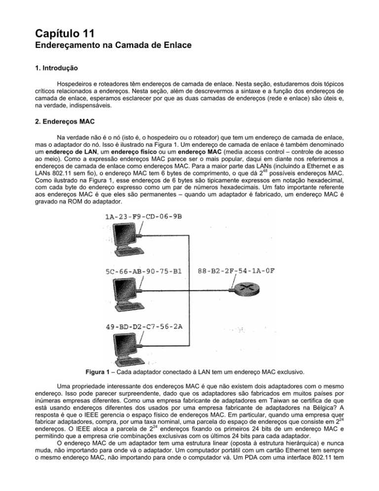 Capítulo 11 Endereçamento na Camada de Enlace 1. Introdução Hospedeiros e roteadores têm endereços de camada de enlace. Nesta seção, estudaremos dois tópicos críticos relacionados a endereços. Nesta seção, além de descrevermos a sintaxe e a função dos endereços de camada de enlace, esperamos esclarecer por que as duas camadas de endereços (rede e enlace) são úteis e, na verdade, indispensáveis. 2. Endereços MAC Na verdade não é o nó (isto é, o hospedeiro ou o roteador) que tem um endereço de camada de enlace, mas o adaptador do nó. Isso é ilustrado na Figura 1. Um endereço de camada de enlace é também denominado um endereço de LAN, um endereço físico ou um endereço MAC (media access control – controle de acesso ao meio). Como a expressão endereços MAC parece ser o mais popular, daqui em diante nos referiremos a endereços de camada de enlace como endereços MAC. Para a maior parte das LANs (incluindo a Ethernet e as LANs 802.11 sem fio), o endereço MAC tem 6 bytes de comprimento, o que dá 248 possíveis endereços MAC. Como ilustrado na Figura 1, esse endereços de 6 bytes são tipicamente expressos em notação hexadecimal, com cada byte do endereço expresso como um par de números hexadecimais. Um fato importante referente aos endereços MAC é que eles são permanentes – quando um adaptador é fabricado, um endereço MAC é gravado na ROM do adaptador. Figura 1 – Cada adaptador conectado à LAN tem um endereço MAC exclusivo. Uma propriedade interessante dos endereços MAC é que não existem dois adaptadores com o mesmo endereço. Isso pode parecer surpreendente, dado que os adaptadores são fabricados em muitos países por inúmeras empresas diferentes. Como uma empresa fabricante de adaptadores em Taiwan se certifica de que está usando endereços diferentes dos usados por uma empresa fabricante de adaptadores na Bélgica? A resposta é que o IEEE gerencia o espaço físico de endereços MAC. Em particular, quando uma empresa quer fabricar adaptadores, compra, por uma taxa nominal, uma parcela do espaço de endereços que consiste em 224 endereços. O IEEE aloca a parcela de 224 endereços fixando os primeiros 24 bits de um endereço MAC e permitindo que a empresa crie combinações exclusivas com os últimos 24 bits para cada adaptador. O endereço MAC de um adaptador tem uma estrutura linear (oposta à estrutura hierárquica) e nunca muda, não importando para onde vá o adaptador. Um computador portátil com um cartão Ethernet tem sempre o mesmo endereço MAC, não importando para onde o computador vá. Um PDA com uma interface 802.11 tem sempre o mesmo endereço MAC onde quer que vá. Lembre-se de que, ao contrário, um endereço IP tem uma estrutura hierárquica (isto é, uma parte que é da rede e uma parte que é do hospedeiro) e que o endereço IP de um nó precisa ser trocado quando o hospedeiro muda de lugar. O endereço MAC de um adaptador é análogo ao número do CPF de uma pessoa, que também tem uma estrutura linear e não muda, não importando para onde a pessoa vá. Um endereço IP é análogo ao endereço postal de uma pessoa que é hierárquico e precisa ser trocado quando a pessoa muda de lugar. Exatamente como uma pessoa pode achar útil ter um endereço postal, bem como um número de CPF, também é útil para um nó ter um endereço de camada de rede, bem como um endereço MAC. Como descrevemos no início desta seção, quando um adaptador quer enviar um quadro para algum adaptador de destino, o adaptador remetente insere no quadro o endereço MAC do destino e envia o quadro para dentro da LAN. Se a LAN utilizar transmissão broadcast (como a LAN 802.11 e muitas LANs Ethernet), o quadro será recebido e processado por todos os outros adaptadores na LAN. Em particular, cada adaptador que recebe o quadro verificará se o endereço MAC de destino que está no quadro combina com seu próprio endereço MAC. Se os endereços combinarem, o adaptador extrairá o datagrama encerrado no quadro e o passa para cima na pilha de protocolos até seu nó pai. Se os endereços não combinarem, o adaptador descartará o quadro sem passar o datagrama de camada de rede para cima na pilha de protocolos. Assim, somente o adaptador no nó de destino interromperá seu nó pai quando receber um quadro. No entanto, às vezes um adaptador remetente quer que todos os outros adaptadores na LAN recebam e processem o quadro que ele está prestes a enviar. Nesse caso, o adaptador remetente insere um endereço de broadcast MAC especial no campo de endereço do destinatário do quadro. Para LANs que usam endereços de 6 bytes (como a Ethernet e as LANs de passagem de permissão), o endereço de broadcast é uma cadeia de 48 bits 1 consecutivos (isto é, FF-FF-FF-FF-FF-FF em notação hexadecimal). 3. ARP (protocolo de resolução de endereços) Como existem endereços de camada de rede (por exemplo, endereços IP da Internet) e endereços de camada de enlace (isto é, endereços MAC), é preciso fazer a tradução de um para o outro. Para a Internet, esta é uma tarefa do protocolo de resolução de endereços (address resolution protocol - ARP). Para compreender a necessidade de um protocolo como o ARP, considere a rede mostrada na Figura 2. Nesse exemplo simples, cada nó tem um único endereço IP e o adaptador de cada nó tem um único endereço MAC. Como sempre, endereços IP são mostrados em notação decimal com pontos e endereços MAC, em notação hexadecimal. Agora suponha que o nó com endereço IP 222.222.222.220 queira mandar um datagrama IP para o nó 222.222.222.222. Nesse exemplo, os nós de fonte e de destino estão na mesma rede (LAN). Para enviar um datagrama, o nó da fonte deve dar a seu adaptador não somente o datagrama IP e o endereço MAC, o adaptador do nó remetente montará um quadro de camada de enlace contendo o endereço MAC do nó receptor e enviará o quadro para dentro da LAN. Figura 2 – Cada nó em uma LAN t