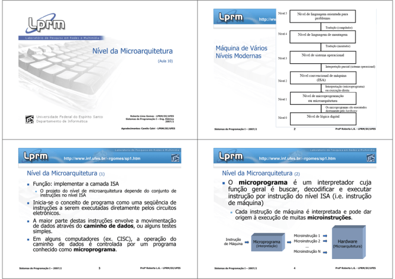 http://www.inf.ufes.br/~rgomes/sp1.htm Nível da Microarquitetura Máquina de Vários Níveis Modernas (Aula 10) (ISA) Interpretação (microprograma) ou execução direta ou microarquitetura Roberta Lima Gomes - LPRM/DI/UFES Sistemas de Programação I – Eng. Elétrica 2007/2 Agradecimentos: Camilo Calvi - LPRM/DI/UFES http://www.inf.ufes.br/~rgomes/sp1.htm Nível da Microarquitetura Função: implementar a camada ISA (1) O projeto do nível de microarquitetura depende do conjunto de instruções no nível ISA Inicia-se o conceito de programa como uma seqüência de instruções a serem executadas diretamente pelos circuitos eletrônicos. A maior parte destas instruções envolve a movimentação de dados através do caminho de dados, ou alguns testes simples. Em alguns computadores (ex. CISC), a operação do caminho de dados é controlada por um programa conhecido como microprograma. Sistemas de Programação I – 2007/2 3 Profa Roberta L.G. - LPRM/DI/UFES 2 Sistemas de Programação I – 2007/2 Profa Roberta L.G. - LPRM/DI/UFES http://www.inf.ufes.br/~rgomes/sp1.htm Nível da Microarquitetura (2) O microprograma é um interpretador cuja função geral é buscar, decodificar e executar instrução por instrução do nível ISA (i.e. instrução de máquina) Cada instrução de máquina é interpretada e pode dar origem à execução de muitas microinstruções. Instrução de Máquina Microprograma (Interpretação) Sistemas de Programação I – 2007/2 Microinstrução 1 Microinstrução 2 ... Microinstrução N 4 Hardware (Microarquitetura) Profa Roberta L.G. - LPRM/DI/UFES http://www.inf.ufes.br/~rgomes/sp1.htm Nível da Microarquitetura http://www.inf.ufes.br/~rgomes/sp1.htm (3) Nível da Microarquitetura Função: buscar, decodificar e executar as instruções (de máquina), uma a uma, usando o caminho de dados para a realização de uma tarefa. Exemplo: Execução de uma instrução de SOMA (ADD) A instrução deve ser buscada na memória, seus operandos devem ser localizados e trazidos para os registradores, a soma deve ser calculada na ULA, e o resultado deve ser encaminhado para o lugar apropriado O microprograma é um conjunto de microinstruções. Ele é armazenado numa memória ROM do processador, chamada control store, ou memória de controle. Cada microinstrução especifica os sinais de controle necessários para controlar a microarquitetura. 5 Sistemas de Programação I – 2007/2 Profa Roberta L.G. - LPRM/DI/UFES Hardware (Microarquitetura) Em geral, enxerga-se: Um conjunto de 8 a 32 registradores O circuito da ULA (Unidade Lógica e Aritmética) Os registradores e a ULA são conectados para formar o Caminho de Dados (Data Path), estrutura sobre a qual os dados fluem. A operação básica do caminho de dados Seleção de um-dois registradores para que a ULA opere sobre eles Esquematizando a Microarquitetura Profa Roberta L.G. - LPRM/DI/UFES http://www.inf.ufes.br/~rgomes/sp1.htm (1) Esquematizando a Microarquitetura Uma Microarquitetura é dividida em uma Parte Operativa e uma Parte de Controle Parte Operativa (ou Caminho de Dados) 6 Sistemas de Programação I – 2007/2 http://www.inf.ufes.br/~rgomes/sp1.htm (4) Microprograma Constituída de todos os componentes responsáveis pela execução das operações elementares sobre os dados (transformações nos dados) (2) - registradores - ULA ... (Caminho de Dados) Parte de Controle - registradores - (memória de controle) - circuitos seqüenciais ... Constituída de circuitos sequenciais e/ou memória de microprograma que gera o controle ciclo-a-ciclo da parte operativa Sistemas de Programação I – 2007/2 7 Profa Roberta L.G. - LPRM/DI/UFES Sistemas de Programação I – 2007/2 8 Profa Roberta L.G. - LPRM/DI/UFES http://www.inf.ufes.br/~rgomes/sp1.htm Um Exemplo de Microarquitetura Não existem os microarquitetura”. “princípios http://www.inf.ufes.br/~rgomes/sp1.htm Um Exemplo de Microarquitetura (1) gerais de projeto de Programa Principal: Depende do conjunto de instruções do nível ISA Exemplo de microarquitetura adotado: MIC1 Um subconjunto da Máquina Virtual Java, em que há apenas instruções inteiras -> IJVM. Nossa microarquitetura conterá um microprograma Considere que cada instrução no nível ISA corresponde a uma função a ser chamada pelo programa principal (microprograma) Cada função, formada por uma sequência de microinstruções, define os passos a serem executados na microarquitetura Sistemas de Programação I – 2007/2 9 Profa Roberta L.G. - LPRM/DI/UFES Composto por um loop que determina a função a ser chamada. E assim sucessivamente. O microprograma tem um conjunto de variáveis que representam o estado do computador Cada função (que corresponde a uma instrução ISA) muda no mínimo uma das variáveis que formam o estado. Na prática, essas variáveis correspondem aos registradores do sistema Sistemas de Programação I – 2007/2 http://www.inf.ufes.br/~rgomes/sp1.htm Um Exemplo de Microarquitetura 6 linhas de seleção (F0,F1, ENA, ENB, INVA, INC) 2 entradas de dados (complemento de dois) 1º : sempre do registrador H (Holding) 2º : Qualquer um dos outros registradores, excluindo o H e MAR Conjunto (array) de registradores Em geral, esses registradores correspondem a variáveis (mesmo nome) utilizadas no nível ISA. 11 Esses registradores só podem ser acessados no nível da microarquitetura (ou seja, pelo microprograma). Sistemas de Programação I – 2007/2 Profa Roberta L.G. - LPRM/DI/UFES Um Exemplo de Microarquitetura (4) (3) Contém a ULA e todas as suas entradas e saídas 10 http://www.inf.ufes.br/~rgomes/sp1.htm Caminho de Dados (Parte Operativa) (2) Profa Roberta L.G. - LPRM/DI/UFES MAR: Memory Address Register MDR: Memory Data Register PC: Program Counter MBR: Memory Buffer Register SP: Stack pointer (aponta para o topo da pilha) LV: Local Variables (Quadro de variáveis Locais) CPP: Constants Pool Pointer (Ponteiro para o Pool de Constantes) TOS: Top Of St