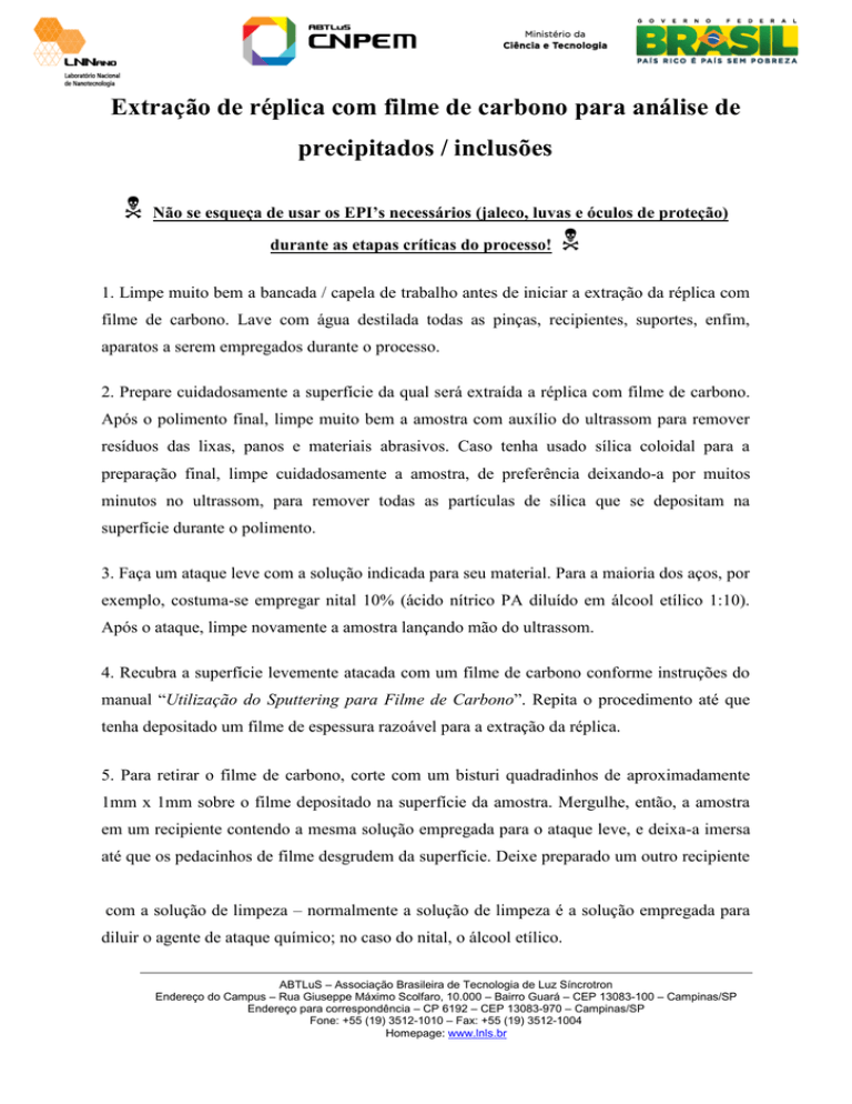 Extração de réplica com filme de carbono para análise de precipitados / inclusões Não se esqueça de usar os EPI’s necessários (jaleco, luvas e óculos de proteção) durante as etapas críticas do processo! 1. Limpe muito bem a bancada / capela de trabalho antes de iniciar a extração da réplica com filme de carbono. Lave com água destilada todas as pinças, recipientes, suportes, enfim, aparatos a serem empregados durante o processo. 2. Prepare cuidadosamente a superfície da qual será extraída a réplica com filme de carbono. Após o polimento final, limpe muito bem a amostra com auxílio do ultrassom para remover resíduos das lixas, panos e materiais abrasivos. Caso tenha usado sílica coloidal para a preparação final, limpe cuidadosamente a amostra, de preferência deixando-a por muitos minutos no ultrassom, para remover todas as partículas de sílica que se depositam na superfície durante o polimento. 3. Faça um ataque leve com a solução indicada para seu material. Para a maioria dos aços, por exemplo, costuma-se empregar nital 10% (ácido nítrico PA diluído em álcool etílico 1:10). Após o ataque, limpe novamente a amostra lançando mão do ultrassom. 4. Recubra a superfície levemente atacada com um filme de carbono conforme instruções do manual “Utilização do Sputtering para Filme de Carbono”. Repita o procedimento até que tenha depositado um filme de espessura razoável para a extração da réplica. 5. Para retirar o filme de carbono, corte com um bisturi quadradinhos de aproximadamente 1mm x 1mm sobre o filme depositado na superfície da amostra. Mergulhe, então, a amostra em um recipiente contendo a mesma solução empregada para o ataque leve, e deixa-a imersa até que os pedacinhos de filme desgrudem da superfície. Deixe preparado um outro recipiente com a solução de limpeza – normalmente a solução de limpeza é a solução empregada para diluir o agente de ataque químico; no caso do nital, o álcool etílico. ABTLuS – Associação Brasileira de Tecnologia de Luz Síncrotron Endereço do Campus – Rua Giuseppe Máximo Scolfaro, 10.000 – Bairro Guará – CEP 13083-100 – Campinas/SP Endereço para correspondência – CP 6192 – CEP 13083-970 – Campinas/SP Fone: +55 (19) 3512-1010 – Fax: +55 (19) 3512-1004 Homepage: www.lnls.br 6. Com auxílio de uma pinça normalmente fechada, segure uma grade de cobre (mesh 400, 3mm de diâmetro, por exemplo) e pesque cada pedacinho de filme solto no nital. Pesque um pedacinho, limpe cuidadosamente a pinça (cuidado para não estragar a amostra!) e solte o pedacinho na solução de limpeza, agitando delicadamente a pinça até que o pedacinho se desgrude da grade de cobre. Repita o procedimento até que tenha pescado uma quantidade suficiente de pedacinhos da amostra. 7. Descarte a grade de cobre utilizada, substituindo-a por uma nova. Prepare um papel de filtro, pesque um pedacinho de filme na solução de limpeza com a nova grade de cobre e deposite sobre o papel filtro para secar. Para cada pedacinho será empregada uma nova grade de cobre, repetindo o procedimento descrito acima. 8. Após o término do processo, limpe novamente o local de trabalho! Elaborado: Davi Munhoz Benati Revisado: Conrado R. M. Afonso Versão 1 – Atualizado 13/08/2009 2