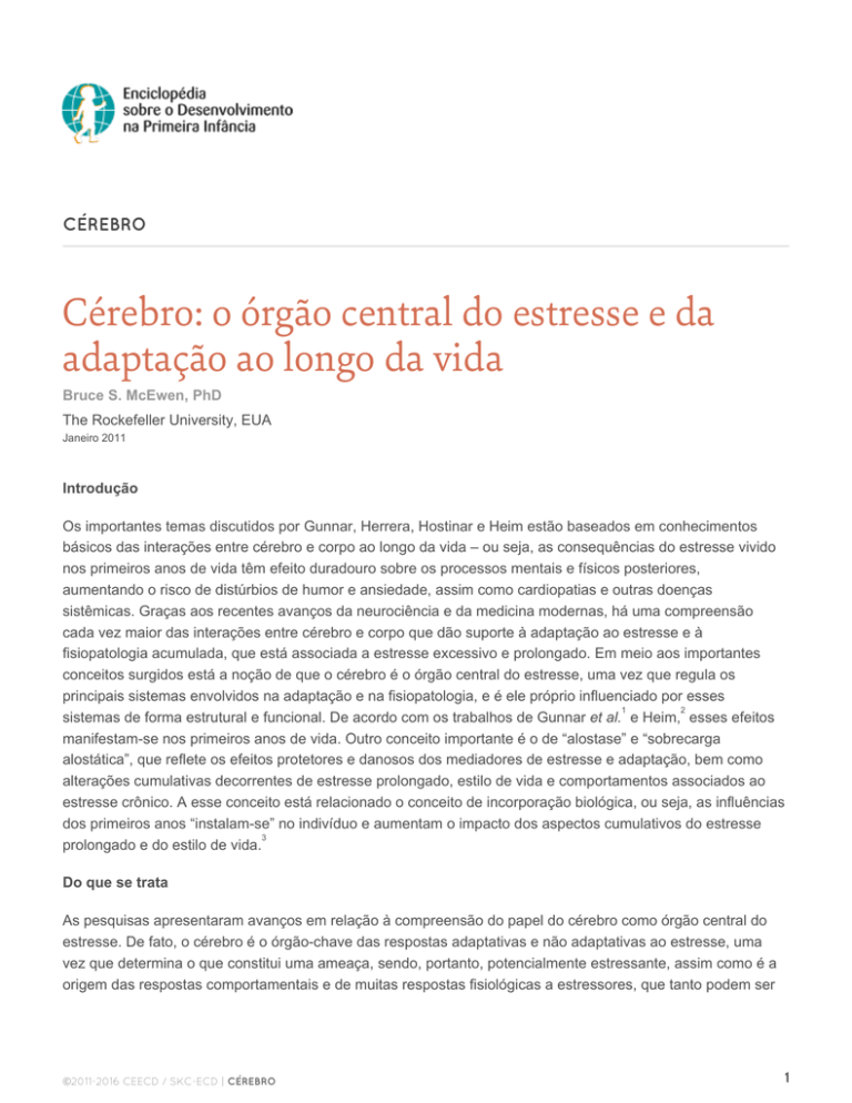 CÉREBRO Cérebro: o órgão central do estresse e da adaptação ao longo da vida Bruce S. McEwen, PhD The Rockefeller University, EUA Janeiro 2011 Introdução Os importantes temas discutidos por Gunnar, Herrera, Hostinar e Heim estão baseados em conhecimentos básicos das interações entre cérebro e corpo ao longo da vida – ou seja, as consequências do estresse vivido nos primeiros anos de vida têm efeito duradouro sobre os processos mentais e físicos posteriores, aumentando o risco de distúrbios de humor e ansiedade, assim como cardiopatias e outras doenças sistêmicas. Graças aos recentes avanços da neurociência e da medicina modernas, há uma compreensão cada vez maior das interações entre cérebro e corpo que dão suporte à adaptação ao estresse e à fisiopatologia acumulada, que está associada a estresse excessivo e prolongado. Em meio aos importantes conceitos surgidos está a noção de que o cérebro é o órgão central do estresse, uma vez que regula os principais sistemas envolvidos na adaptação e na fisiopatologia, e é ele próprio influenciado por esses 1 2 sistemas de forma estrutural e funcional. De acordo com os trabalhos de Gunnar et al. e Heim, esses efeitos manifestam-se nos primeiros anos de vida. Outro conceito importante é o de “alostase” e “sobrecarga alostática”, que reflete os efeitos protetores e danosos dos mediadores de estresse e adaptação, bem como alterações cumulativas decorrentes de estresse prolongado, estilo de vida e comportamentos associados ao estresse crônico. A esse conceito está relacionado o conceito de incorporação biológica, ou seja, as influências dos primeiros anos “instalam-se” no indivíduo e aumentam o impacto dos aspectos cumulativos do estresse 3 prolongado e do estilo de vida. Do que se trata As pesquisas apresentaram avanços em relação à compreensão do papel do cérebro como órgão central do estresse. De fato, o cérebro é o órgão-chave das respostas adaptativas e não adaptativas ao estresse, uma vez que determina o que constitui uma ameaça, sendo, portanto, potencialmente estressante, assim como é a origem das respostas comportamentais e de muitas respostas fisiológicas a estressores, que tanto podem ser ©2011-2016 CEECD / SKC-ECD | CÉREBRO 1 4,5 adaptativas como danosas. O estresse envolve comunicação bilateral entre o cérebro e os sistemas cardiovascular, imunológico e metabólico, por meio do sistema nervoso autônomo e de mecanismos endócrinos. Os efeitos do estresse envolvem medidas de parâmetros múltiplos relativos aos mediadores de estresse e de adaptação, e modificações cumulativas que ocorrem no corpo e no cérebro. Problemas Os mediadores de estresse e de adaptação operam de forma não linear (Figura 1), o que significa que muitos desses mediadores regulam-se mutuamente de forma positiva e negativa, e também operam em um formato 7 de “U” que atualmente é designado pelo termo hormesis. Além da respostas ao estresse agudo do tipo “lutar ou voar”, há eventos na vida cotidiana, inclusive o estilo de vida individual, que produzem um tipo de estresse crônico que, ao longo do tempo, leva ao desgaste do corpo (“sobrecarga alostática”). No entanto, hormônios e outros mediadores associados ao estresse e à adaptação protegem o corpo no curto prazo e favorecem a 4,5,8 adaptação (“alostase”) Esses sistemas são regulados pelo cérebro por meio do hipotálamo e de respostas transmitidas pelos sistemas autônomo e neuroendócrino. Estímulos recebidos pelo hipotálamo envolvem áreas cerebrais como a amígdala, o hipocampo e o córtex pré-frontal que, assim como o hipotálamo, respondem a sinais hormonais. Figura 1. Rede não linear de mediadores de alostase envolvidos na resposta ao estresse. As setas indicam que cada sistema regula os ©2011-2016 CEECD / SKC-ECD | CÉREBRO 2 demais de forma recíproca, criando uma rede não linear. Além disso, há múltiplos trajetos de regulação – por exemplo, a produção de citocinas inflamatórias é negativamente regulada por meio de citocinas antiinflamatórias, e por meio de vias parassimpáticas e de glucocorticoides, ao passo que a atividade simpática aumenta a produção de citocinas inflamatórias. Por outro lado, a atividade parassimpática modula e limita a atividade simpática. Além disso, mediadores – como cortisol e citocinas inflamatórias – produzem efeitos bifásicos que são designados atualmente pelo termo hormesis (ver texto). Transcrito com permissão de McEwens.6 Contexto de pesquisa A avaliação da alostase e da sobrecarga alostática está baseada na coleta de informações para os múltiplos sistemas envolvidos no estresse e na adaptação – ou seja, o eixo hipotálamo-pituitária-adrenal (HPA), o 9,10-12 sistema nervoso autônomo e parâmetros metabólicos. Os mecanismos cerebrais envolvidos em alostase e sobrecarga alostática podem ser observados em modelos animais por meio da utilização de métodos da neurociência moderna, e aplicados a objetos humanos por meio de técnicas de imagens cerebrais em plena 13 evolução. ©2011-2016 CEECD / SKC-ECD | CÉREBRO 3 Figura 2: Eixo hipotálamo-pituitário adrenal (HPA) ou eixo hormonal do estresse Legenda: HIPOTÁLAMO (HYPOTHALAMUS); Hormônio Liberador de Corticotropina (CRH – Corticotropin Releasing Hormone); PITUITÁRIA (PITUITARY); circulação (circulation); Hormônio Adrenocorticotropina (ACTH – AdrenoCorticoTropin Hormone); CORTISOL; GLÂNDULAS ADRENAIS (ADRENAL GLANDS) Questões-chave de pesquisa Experiências envolvendo interações e eventos sociais no ambiente físico são processadas pelo cérebro e são frequentemente designadas sob a rubrica de “estresse”. A partir da observação de modelos animais, sabe-se atualmente que a estrutura e as funções do cérebro são modificadas por experiências, inclusive pelo estresse crônico, e que tais alterações cerebrais representam “plasticida
